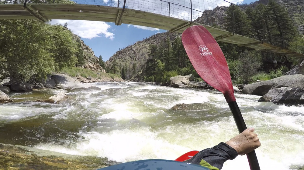 - Foot Bridge (IV- to IV). A foot bridge is overhead and marks the start of the continuous rapids. The first move seemed to have some pin spots in the center and right, we went left over a slide. I think there was also a line far right.