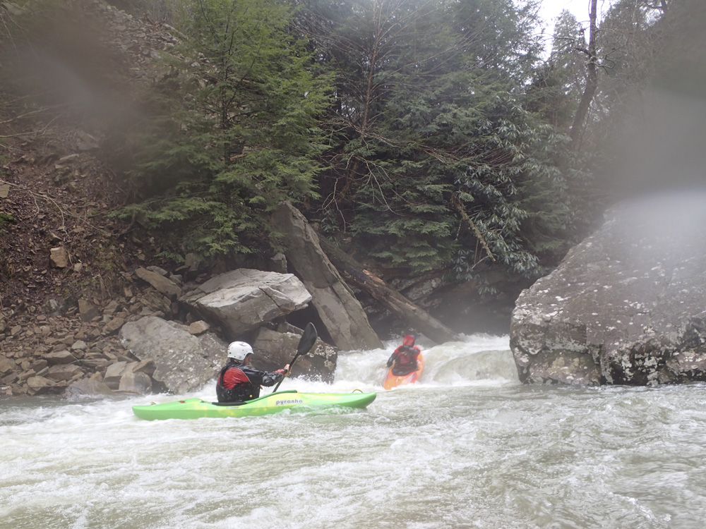 - Rear Entry (V- to V). You can tell there is something bigger downstream. You might scout from the right. We read and ran a little bit and ended up in a small 1 boat eddy at the lip of the main drop, where Jim hoped out and provided beta to us one at a time. The line was down the far left, a ledge should be run with left momentum far left, this auto kicks you through the hole and town a small rocky s-turn. S-turn and boof the exit hole which is backed up by a rock. One in our group hit it with right angle and got a surf on due to the rock backup. Below, is a ledge with sticky hole. I boofed a small left channel on the right, most in the group boofed the main channel either opting far right or far left. The middle was meaty. Below, a small class III/IV boogie rapid can be run anywhere to exit you from the hard section of this river.