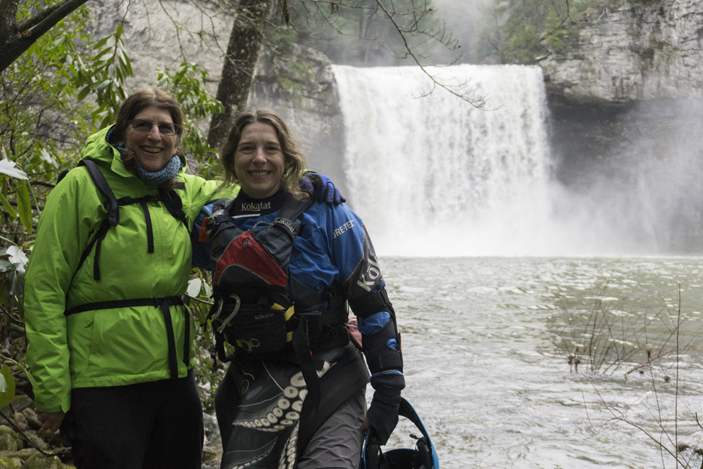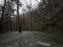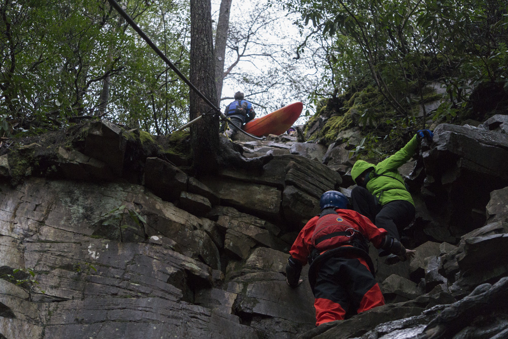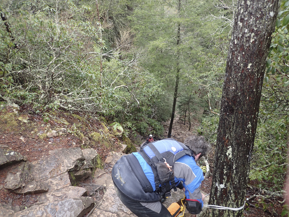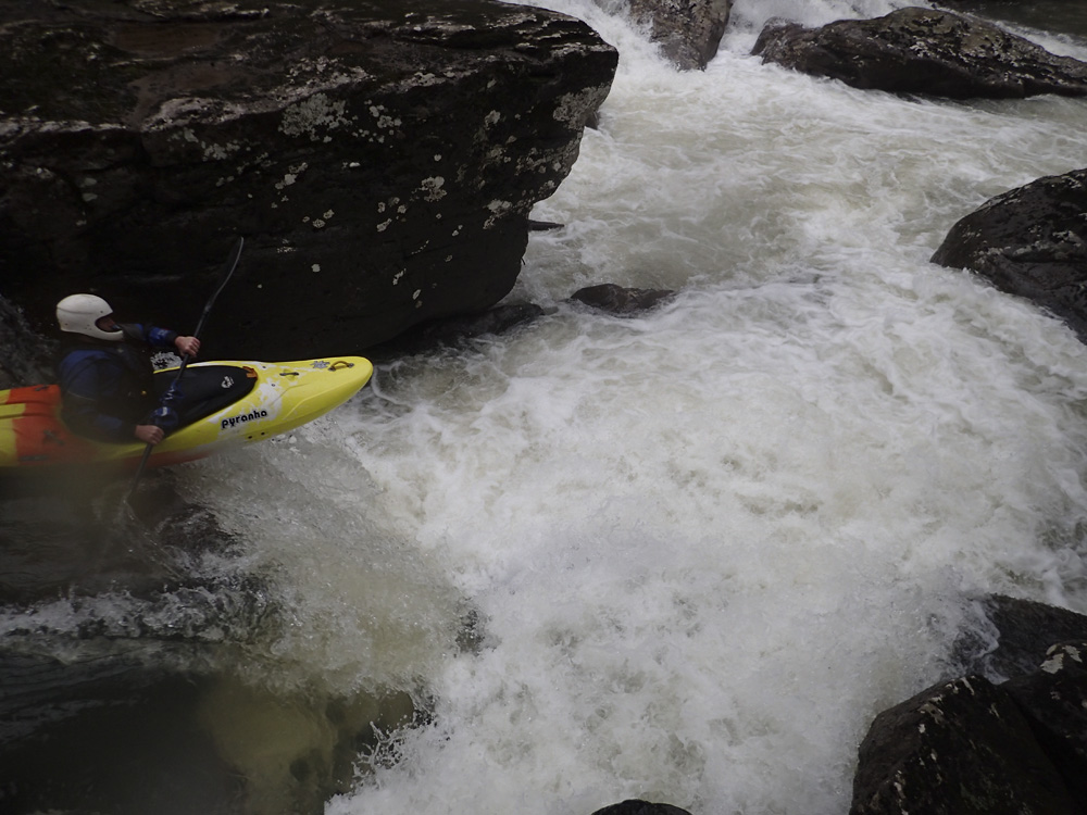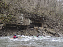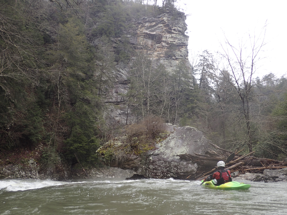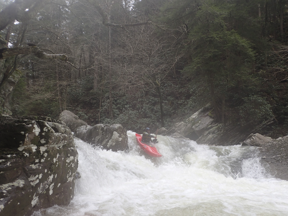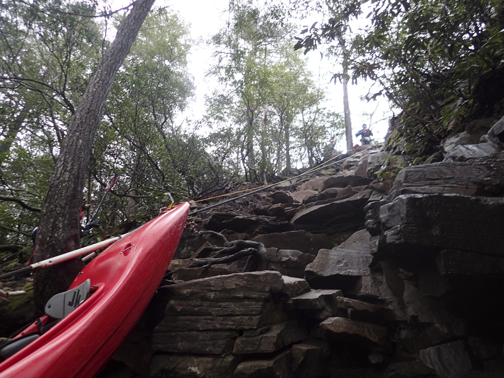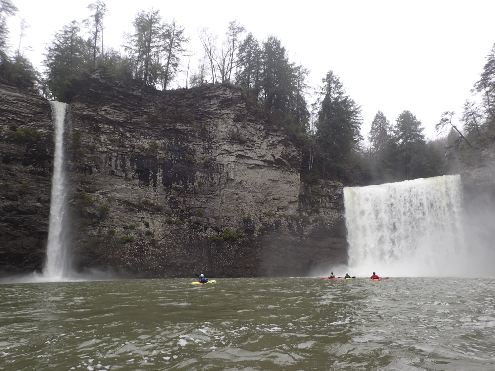 Put-in: Head back towards Mt Crest on TN-30. After 6.2 miles, turn right at the Fall Creek Falls State Park sign onto TN-284. Follow this for 3.1 miles. You will cross Rockhouse Creek (forms the small volume 85 footer next to Cane Creek Falls) and then you will get to a parking area right near Betty Dunn Nature Center. We parked here on the main road. We then walked back down the road the way we came for 100 yards, crossed Rockhouse Creek and then took the Cable Trail (not the Paw Paw Trail) down to the base. Note, that the trail is very steep scramble down 75 degree natural rock steps. If it is frozen, it would be very dangerous. We lowered boats down through the top half via ropes.
