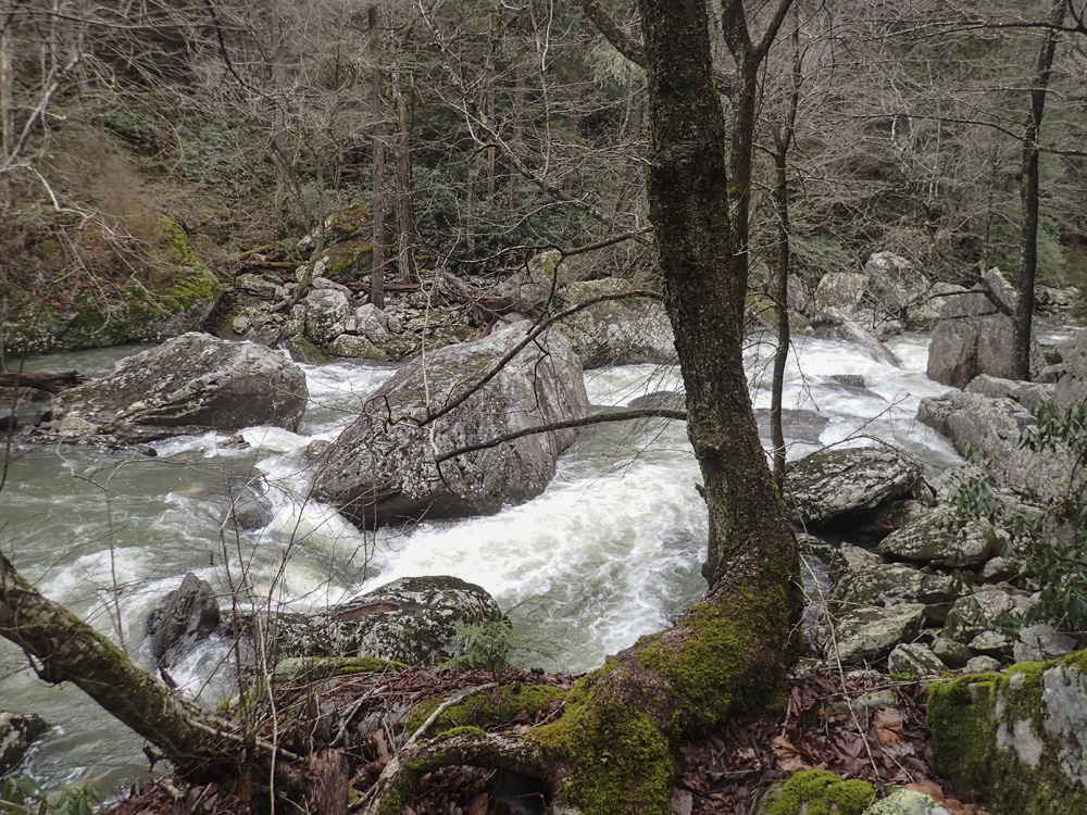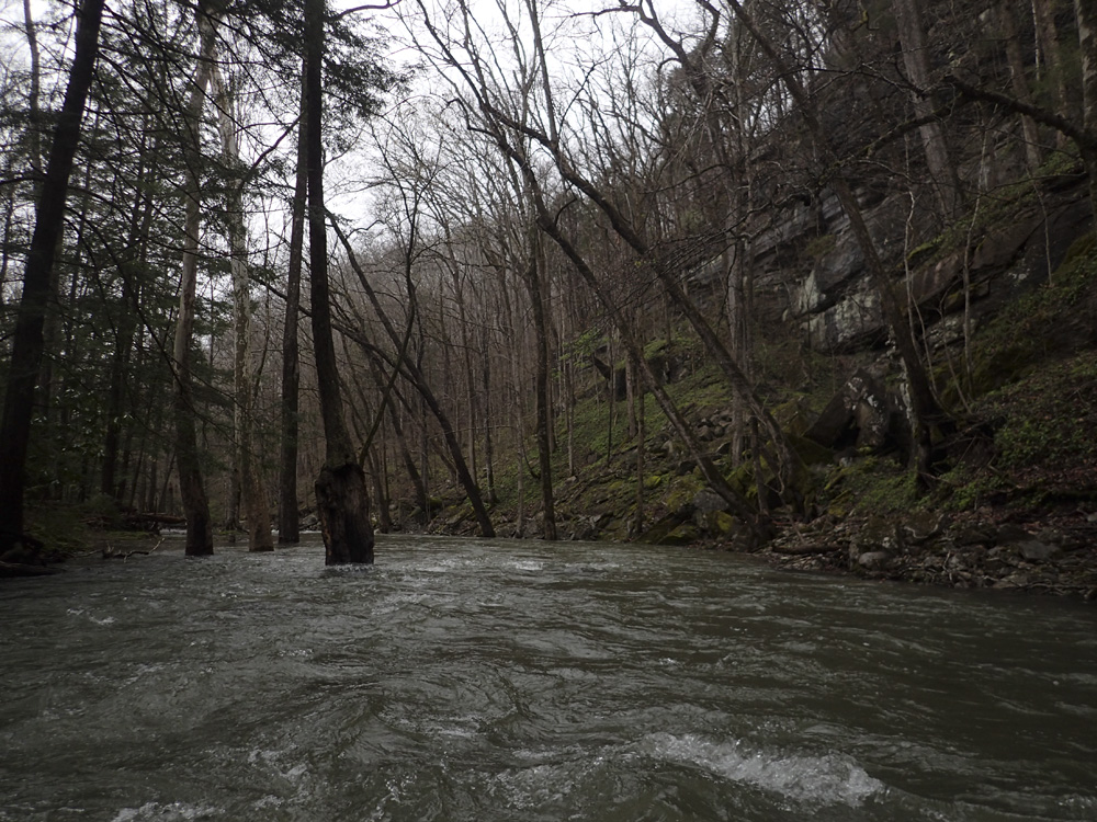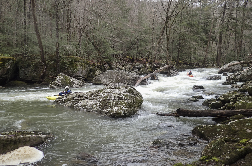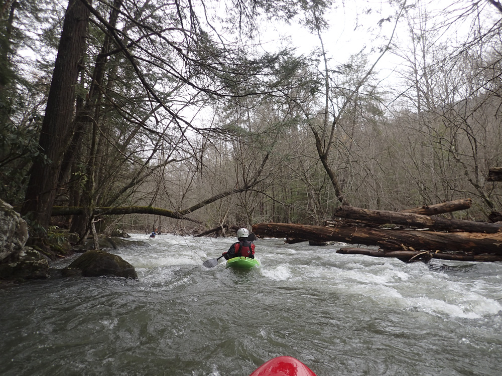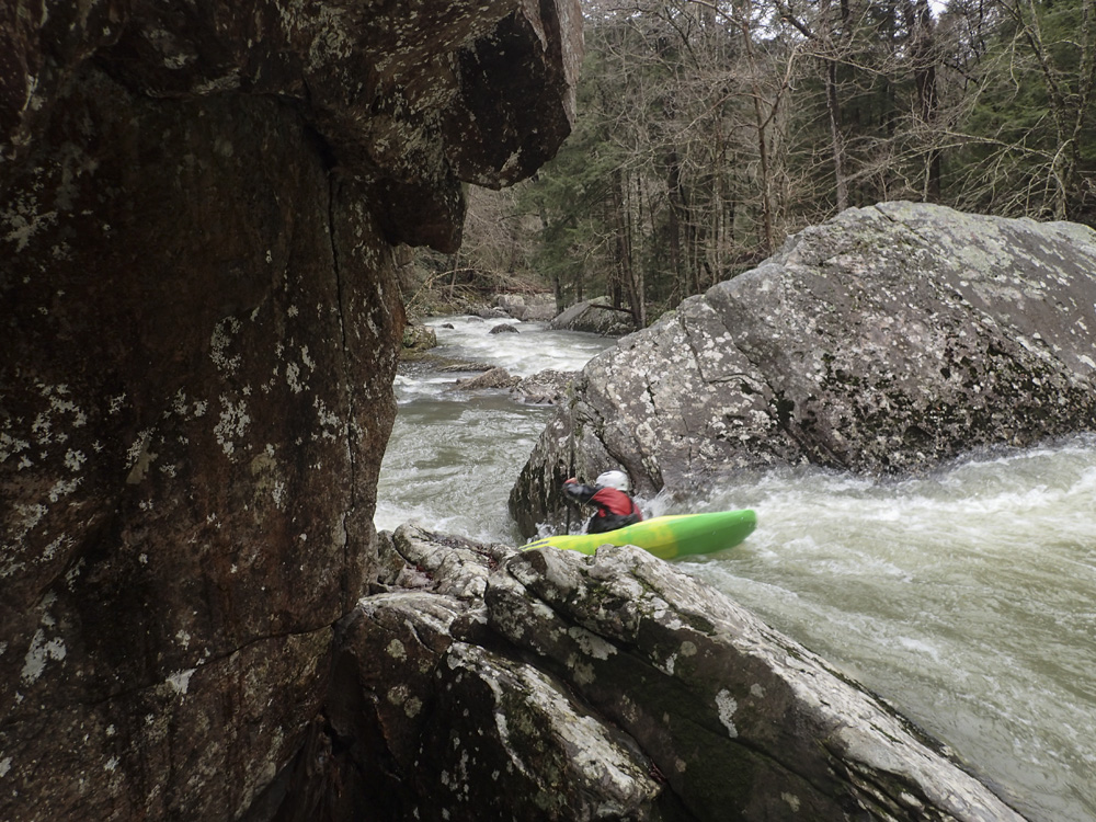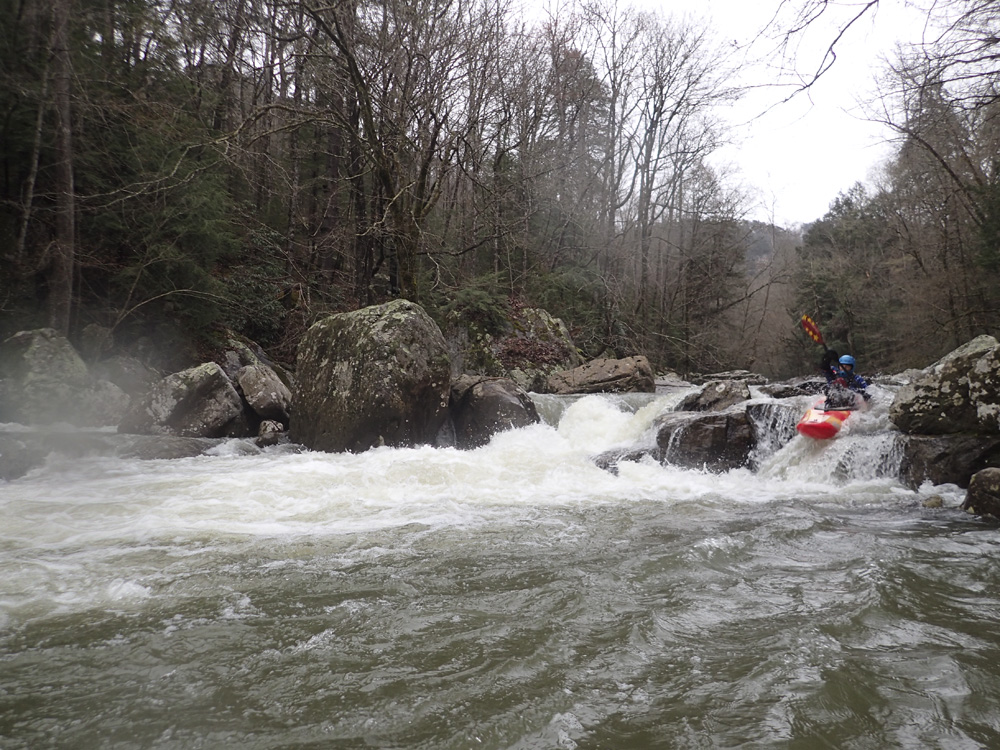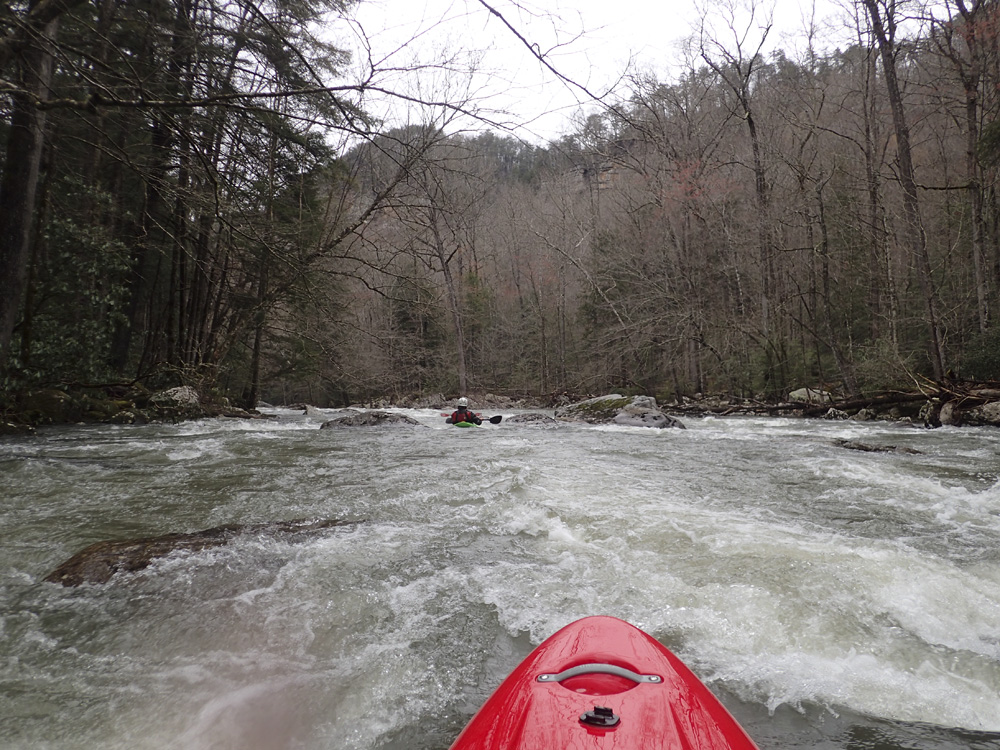 Putting on you quickly get to the rapids. The river is a lot like nearby Bee Creek, or a harder, smaller, and steeper version of Caney Fork. Rocks are sieved or undercut. And rapids tend to be fairly long or multi-tiered. We quickly figured out that the 7" we had felt like a straight medium flow. Not low by any means. In the second or third rapid, we ran into a lack of eddies due to miscommunication with the one person in the group that we don't often boat with. Due to that miscommunication, half the group flushed through a sporty slot on not much more than "it goes" beta. The other half went into it with no more information but in less "flush through" it fashion. Luckily it went well. Not far downstream is Towers, and then the river eases up for a short ways. You collect more water, and then approach Airplane Turn and Hallway Falls which come in quick succession, which then leads quickly into boogie that culminates with Rear Entry. Below that, the river takes a big step down to class III for about a mile before it again steps down this time to class II where it stays until the end. Near the end, the river begins to spread out into multiple channels. We stayed right throughout and this worked out fine. We also found that even throughout this bottom section we had plenty of water. I only hit bottom a few times.
