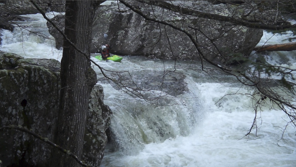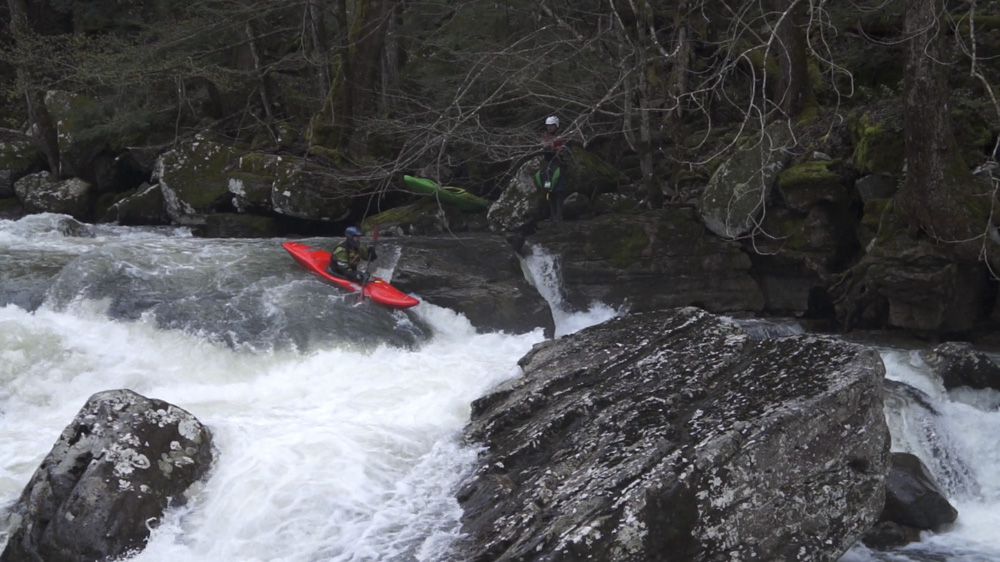 Airplane Turn (IV+ to V). So, the best way to scout is from the center rock. At high flows, that may not be possible. Scouting from the left below doesn't allow you to see the entry hole well as it aligns with the main falls. The line is to drive through the entry hole, the river then airplane turns to the left, you want to be on the far right of this to drop and skip out of the hole below. Being too far center on the drop can result in you getting pitted in the hole, which then moves you back into the pocket, under the undercut, and backed up by a rock. Not a good place to get stuck. There is also a sneak on the far left down a super mellow slide. A small class III serves as the exit of this rapid.