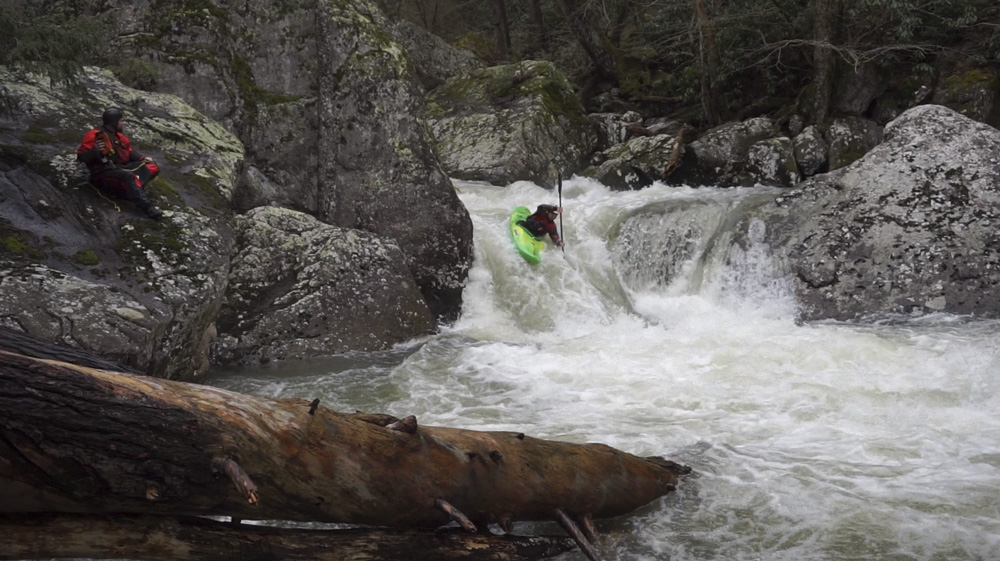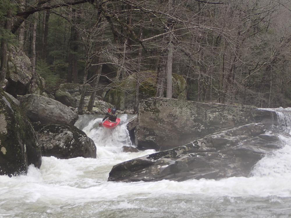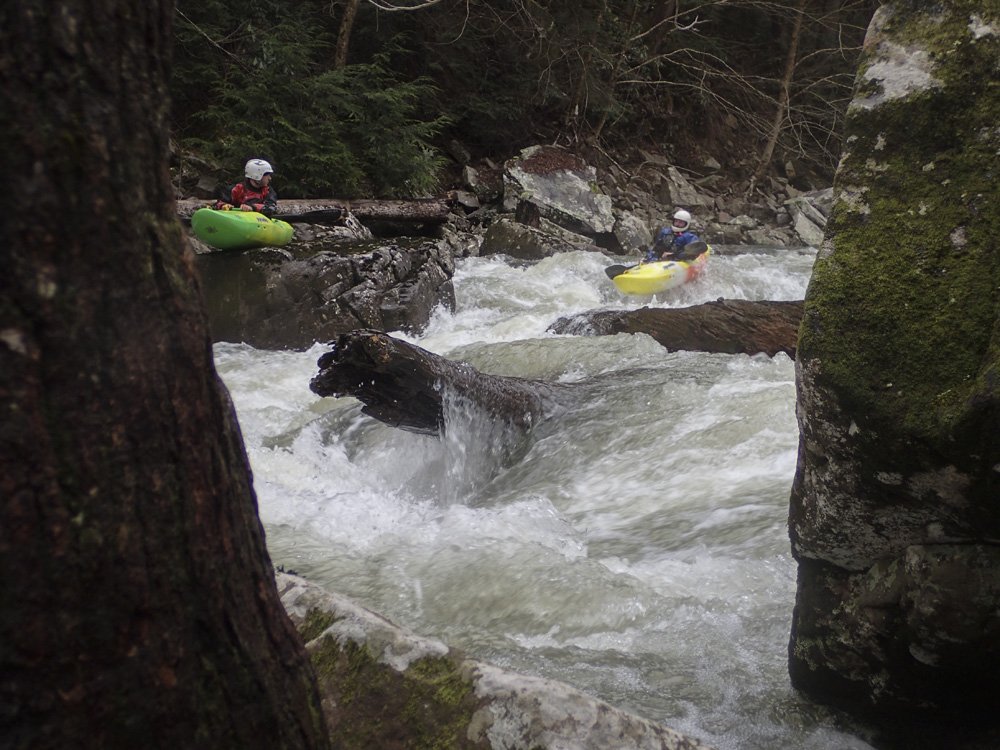 Boof (IV-). Immediately below was a great boof that we ran far left. The hole was decent size and the next step was super congested with wood in play. We ran a small slot on the left of center into a 1.5 boat eddy. From there, we ran down the left channel in front of an undercut we carried right momentum to avoid, This then turned into boogie that we ran down the right before there was another short mellower section of 100 yards which led to a riverwide log.