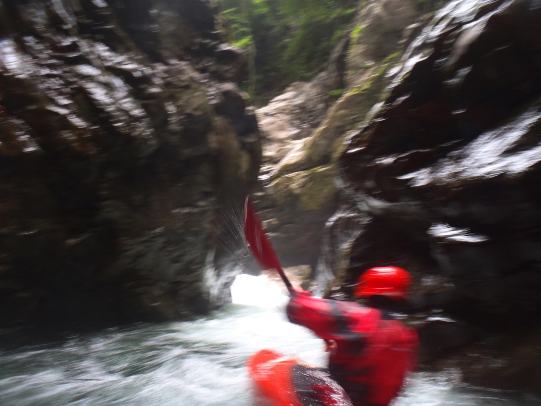 Most of the run is class III to IV with a few junky rapids spread in between. As the walls get closer the rapids get bigger but thankfully turn into bedrock. A few standout class IV rapids lead to the crux which is a slide on the left with a fan over a hole, the exit just downstream is a ledge which bends left to right, forcing you to fade off the left. There is a spot for safety just below on the left. Just downstream is another walled in rapid that goes down the middle at the bottom. You are then in a completely walled out and only 5 foot wide section of river that goes on for a hunred yards before opening into a pool and the first real spot for recovery if something occurred upstream. Below you quickly get to a large two part portage that takes you essentially to the end of the run.