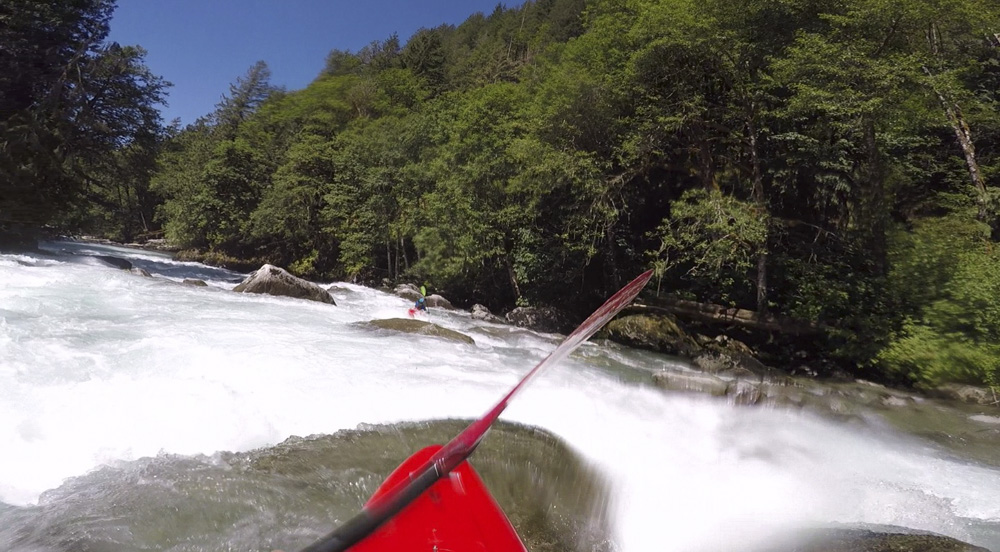 The river starts not too far below put-in, and it starts with a bang. Literally, that is the name of the rapid. This rapid's lead in was easy enough but then we did a long scout of the bottom half in order to get a view of the next eddy. After running the rapid with two different lines, we scouted again, and then again. The second part was the Bridge rapid. And to our surprise, the river was actually less powerful then it looked from the road and we ran the meat of several of the holes. Downstream we were greeted with a nice section of boogie which led to the last two major rapids, both of which we scouted on the left. The second of which we portaged.