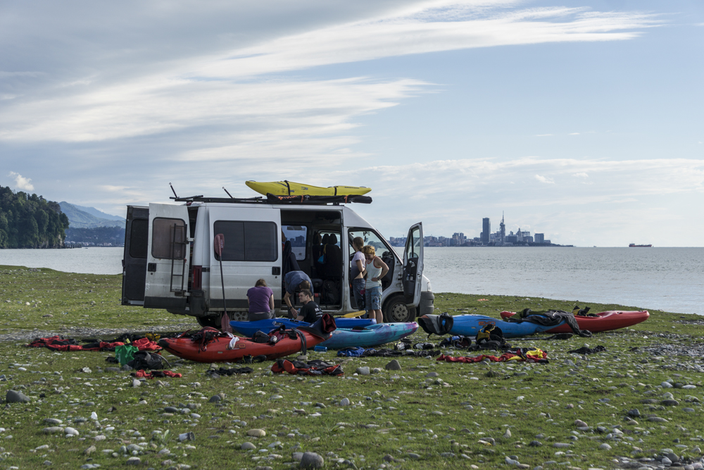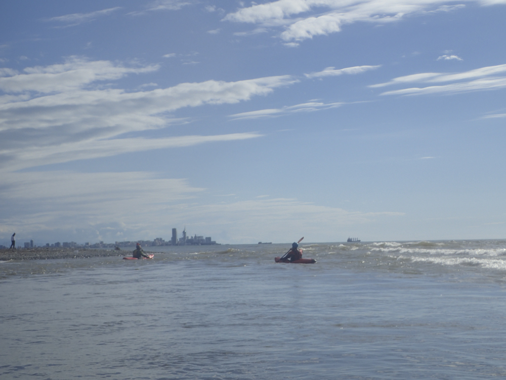This run won't be done commonly... it is all non-descript class II with a few fun splashy class II+. We did it because after doing two laps on the section in the National Park, we wanted to float the entire way down to the Black Sea. So we did. There was one quick portage under the road bridge high above, where the water when into small pipes. This was a construction zone so I imagine it will change again. We then hit the Sea and dried our gear on a beautiful day while enjoying the view of the distant skyline of Batumi.