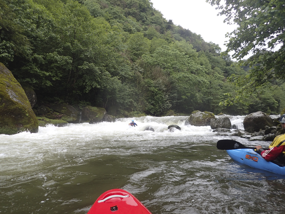 I thought this run was a great class III to IV run, with the one spicier rapid to keep you entertained and I would highly recommend it if you find it with water. Note that you can't judge flow from the high bridge as there is a sizable tributary that comes in about 2 km upstream. I feel our flow was on the low side of medium, maybe even low. But it was plenty for the spicier rapids. The paddle in from the visitor center was definitely on the low side and looked ELF from the road before putting on.