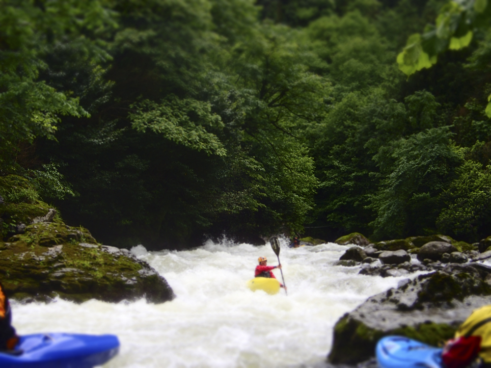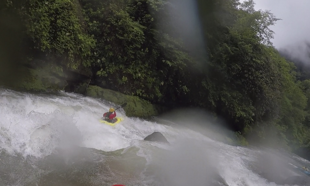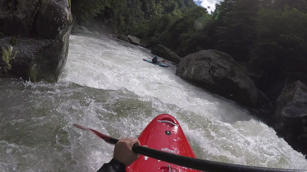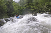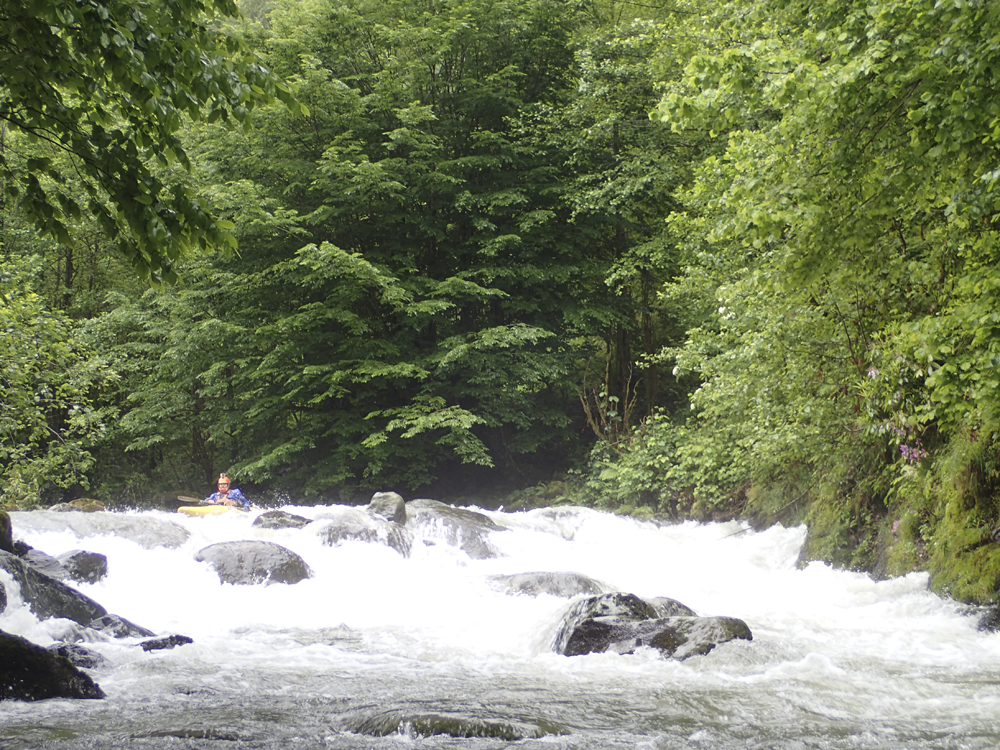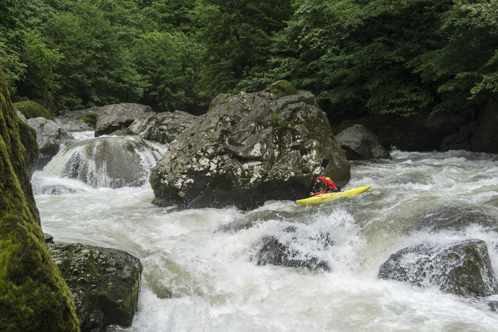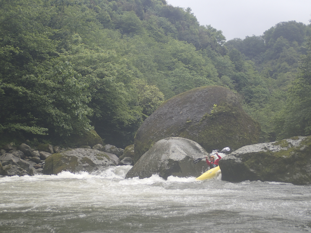 Big One (IV+). This rapid has some hazards in it, so it should be scouted on the right. Note that the rocks are super slick! The line at the top is off of the left wall, boofing over a folding seam. Then, get to the right and hug the inside of the large house size boulder. The left side of the channel drops into some nasty pin rocks. As long as you are on the right tongue you are good. Then, turn left and exit with the water.