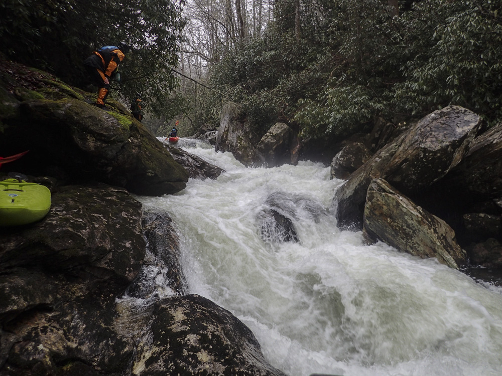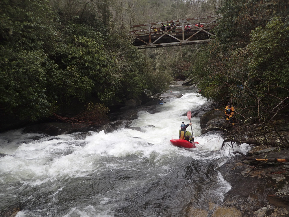 Put-in: Go back out the 2.7 miles to NC-107. Turn left. Continue for 6.2 miles before turning left onto Bull Pen Rd. Turn and follow the road for 3.6 miles to a triangle intersection, stay left and continue for 1.7 more miles as you drop into the river canyon. This too is mostly on dirt. But the first is in good shape.