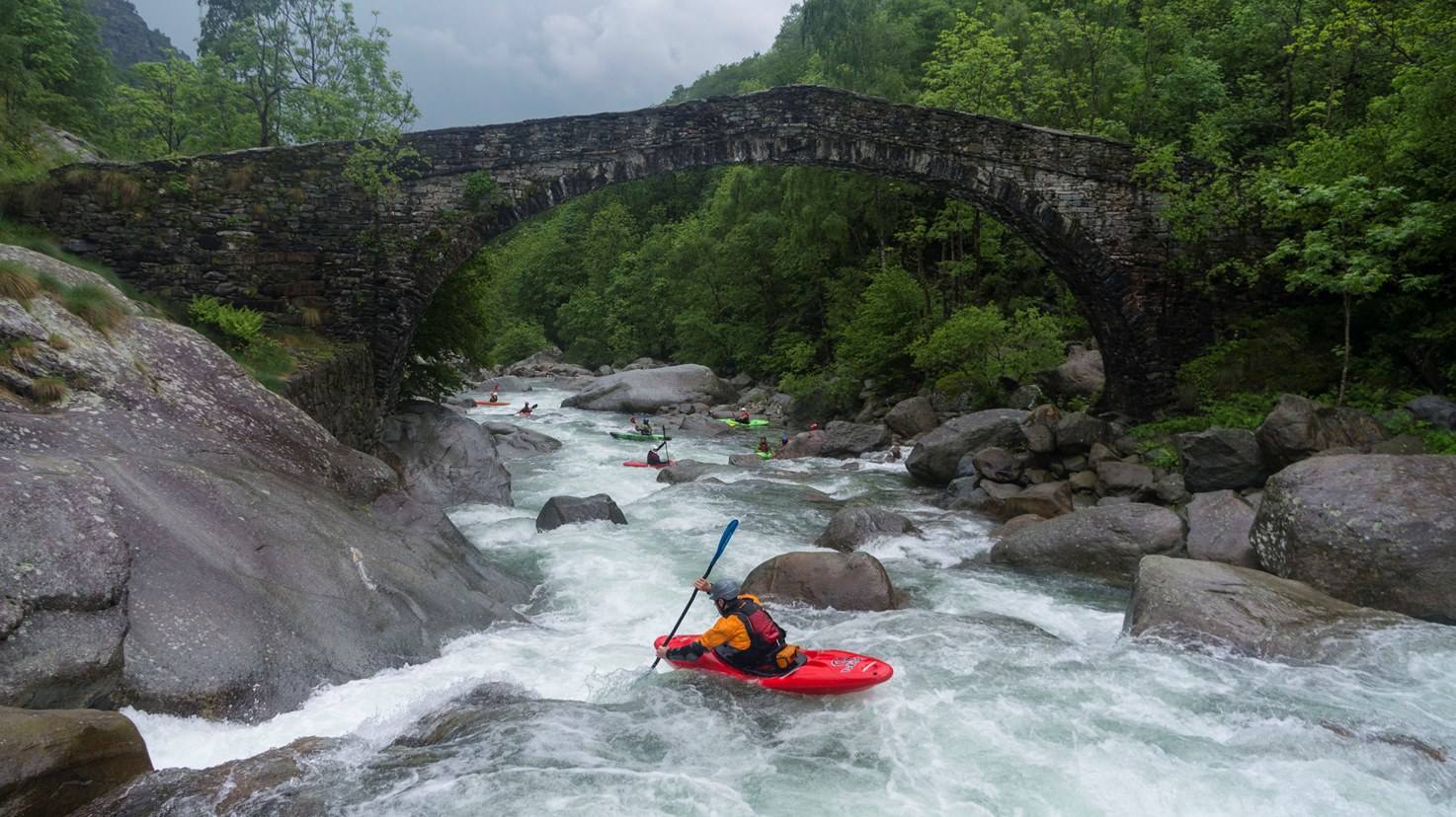Roman Bridge (IV+). A big double boof is just below at the Roman bridge. We entered center and exited left of center. This is a common take-out location.
