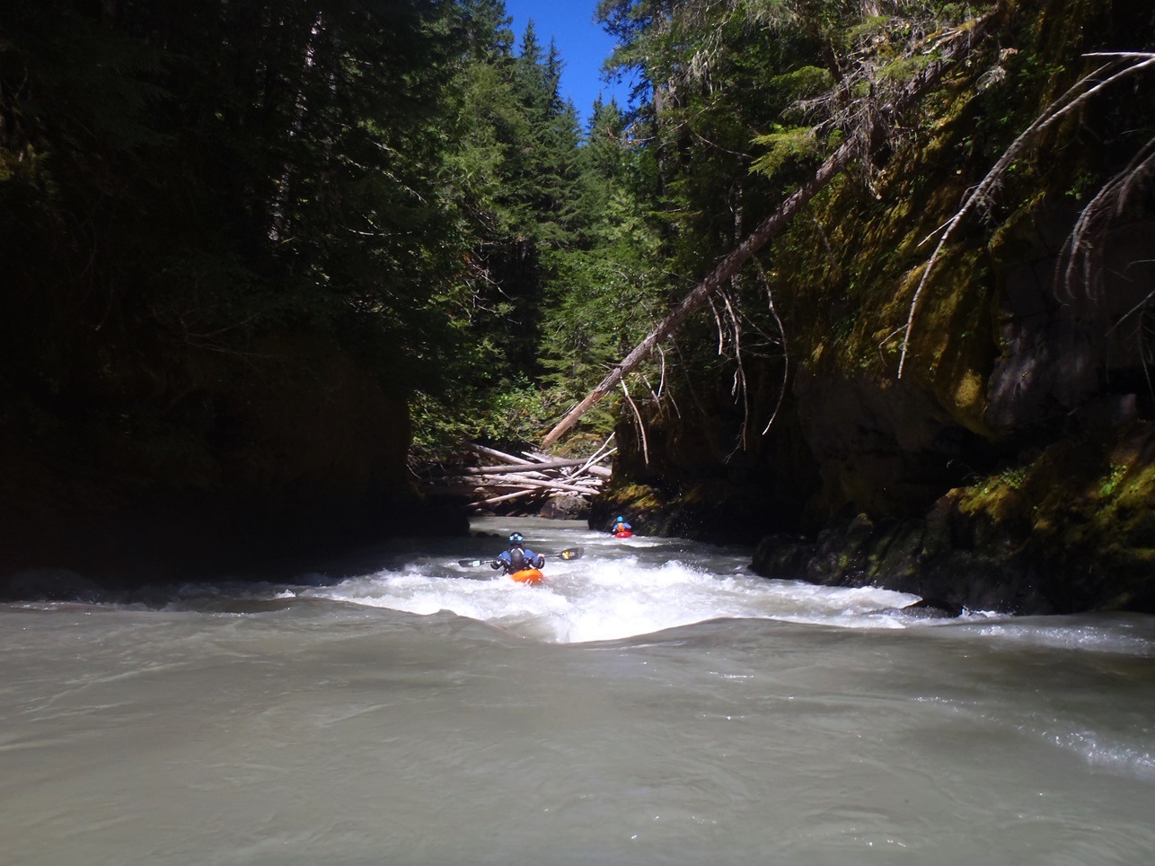 Boogie (IV to IV+). The first mile and a half is boogie with a few stand-out moves. We found the greatest challenge was finding a clean line at the low water, that with the plethora of wood in the river we found ourselves on our toes, but able to boat scout our way down river.