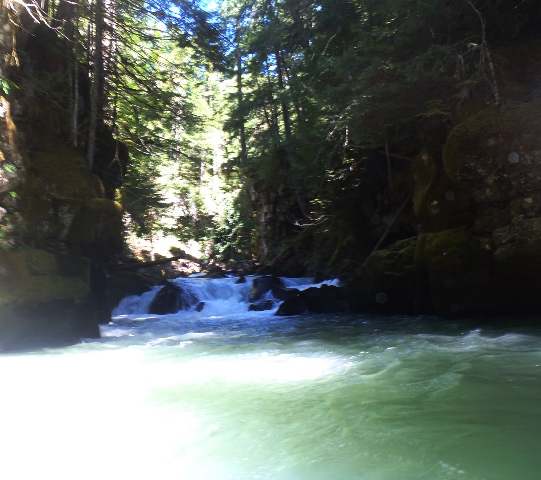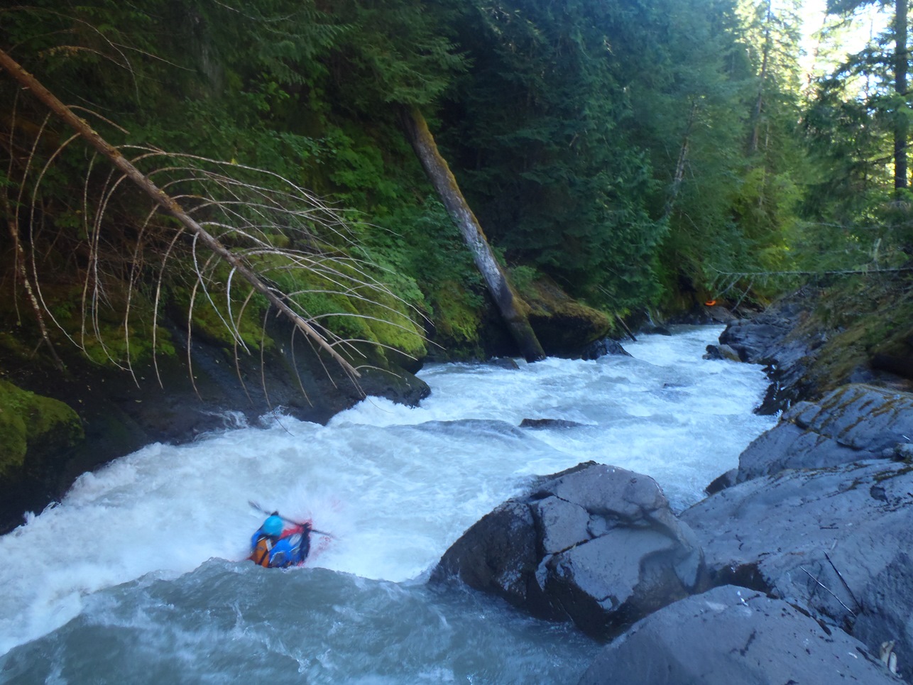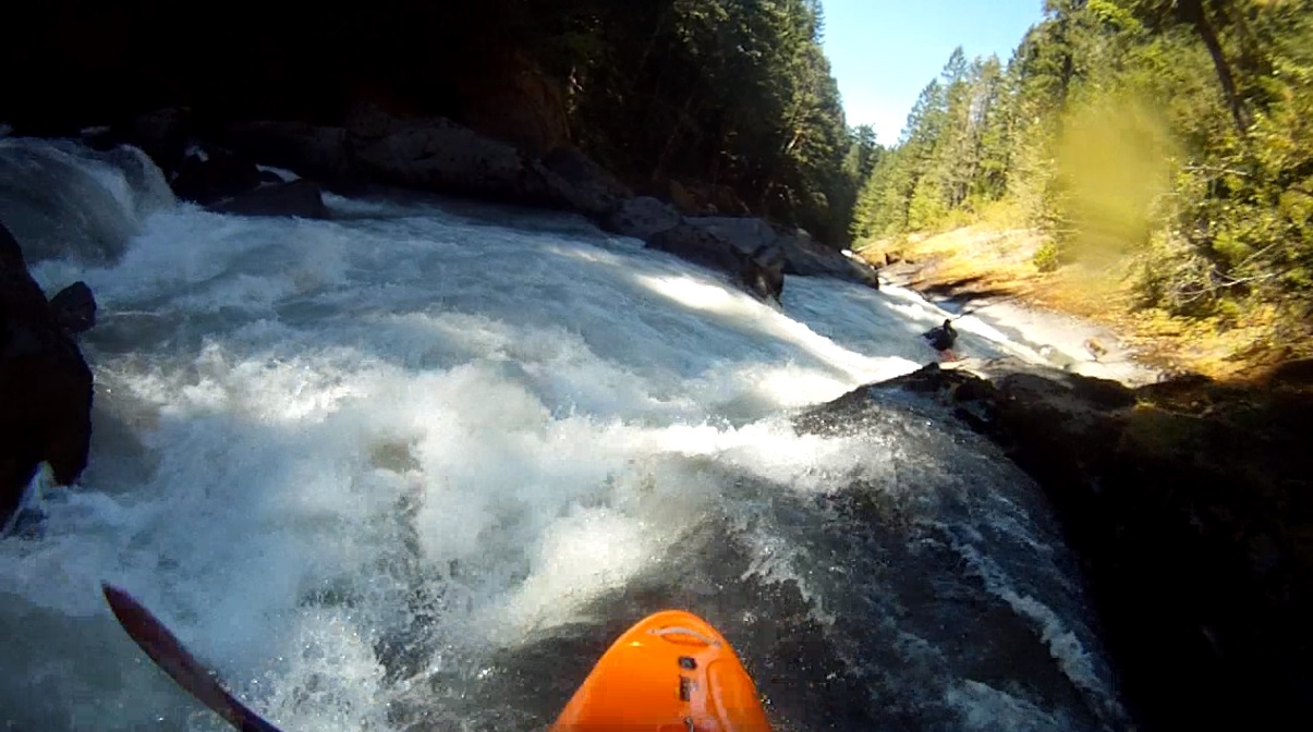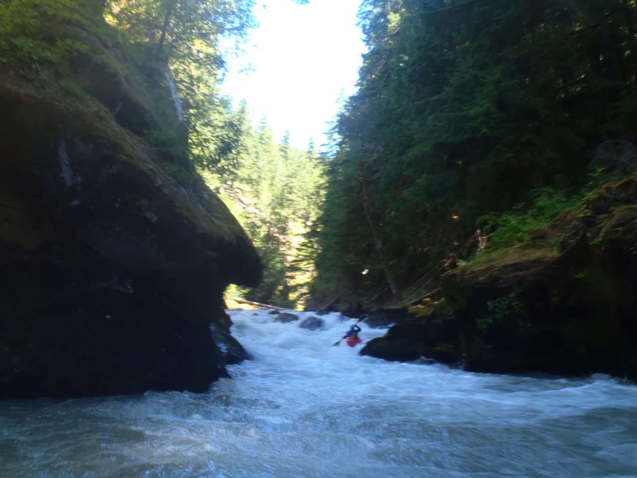 The river itself is interesting. Some guides call it class V+, others class V. As is the theme on this road trip, we had low water... 480 cfs of so in August. We found the river to be mostly class IV+ at this flow. With the exception perhaps of the rapid immediately above Behemoth, Behemoth, and the rapid immediately below. The one above I would give a V- rating, with an added step due to the fact that if you were to swim, your boat would certainly run Behemoth without you. The rapid below is also maybe V- just due to multiple moves and dangerous rocks. The main reason though why I would not take anyone other than class V boaters in here is Behemoth itself. You need to have control entering and boofing the drop. Boof to far left and you run the risk of getting recirculated behind the falls. Plug and run the risk of a skirt implosion. Additionally, the hole below can become very mean at high flows... requiring you to boof left in order to exit left. In total, someone who is not used to running tall drops may be more prone to making a mistake here and requiring a very long drawn out rescue. As it was though, for our group I thought Behemoth was great. Nothing like standing at the top of a must run falls to get your heart going. Especially as one in your team knocks your boat of its precarious perch at the lip of the falls only to be saved by the third member sprawling out on the rock slab to dive after it and almost sliding into the river (and the drop) themselves. Man did I appreciate that. Being without a boat would have sucked!