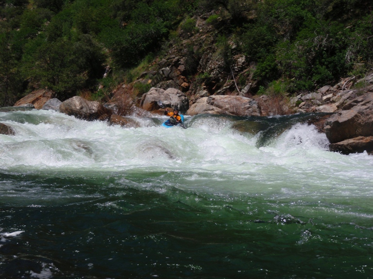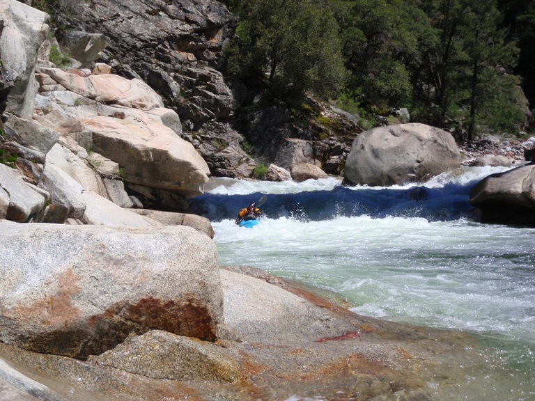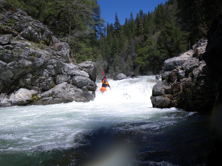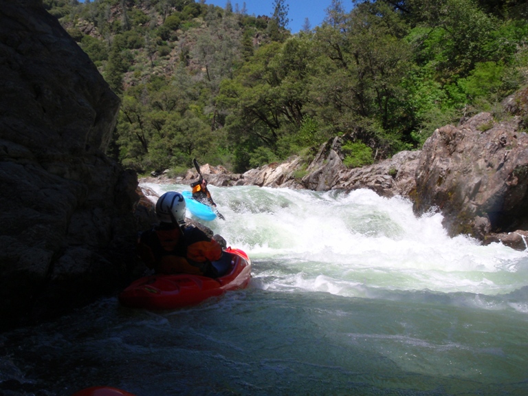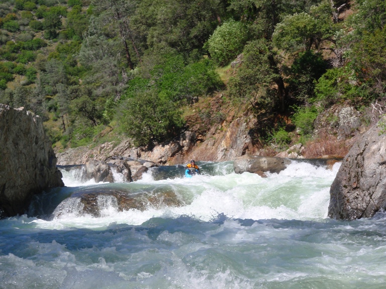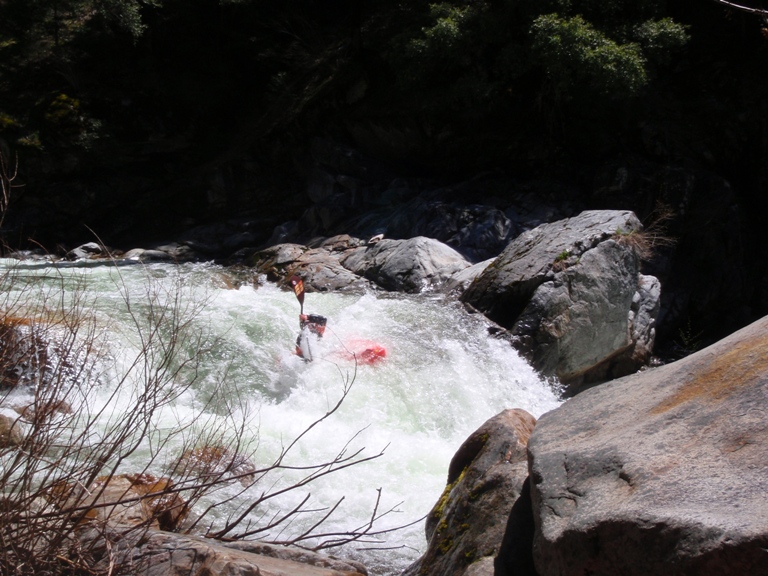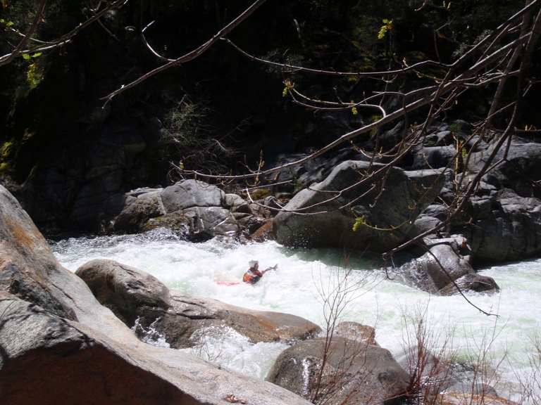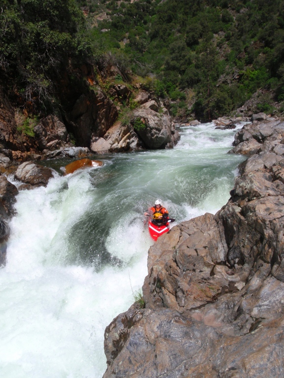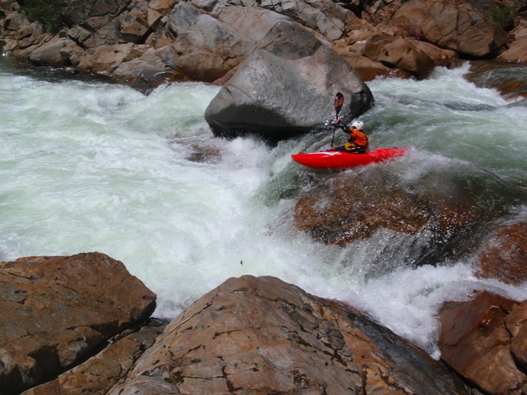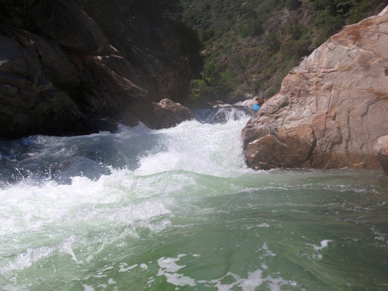 - The Dieter King Drop (V+). I don't know if anyone else has run this drop, maybe folks have. I was told Dieter ran it with more water. At our flow the center rock formed a large pillow and dropped most of the water down two cracks on either side of it. The photos from below make it look good to go, but don't be fooled.