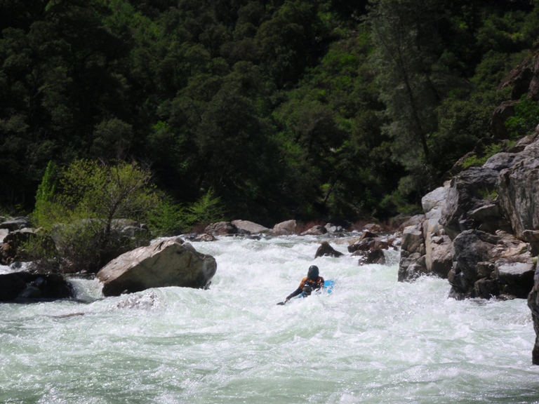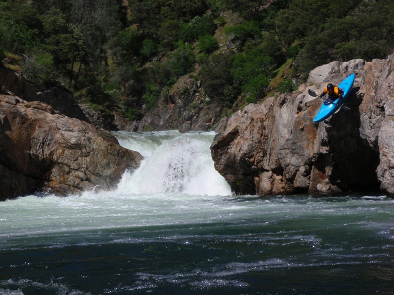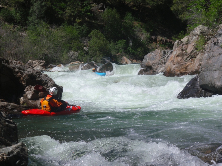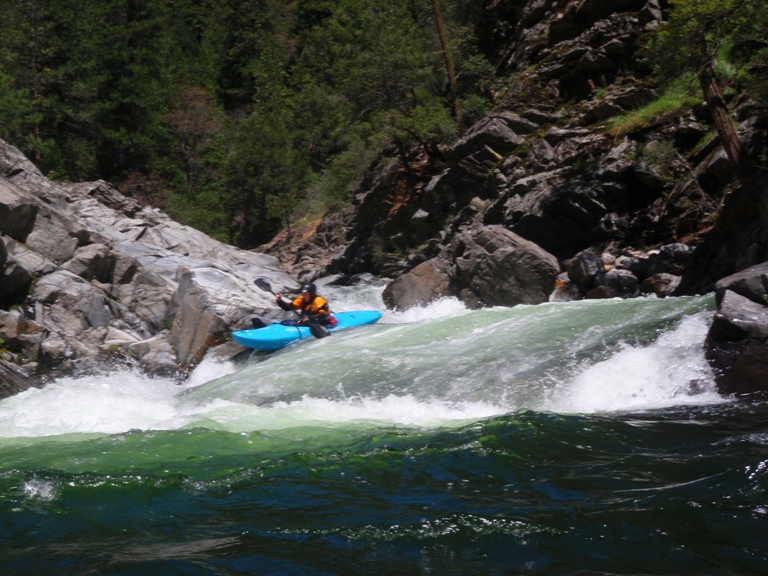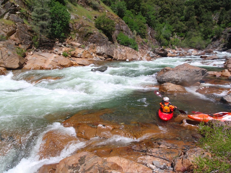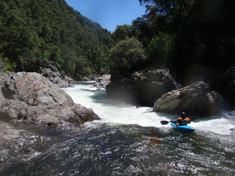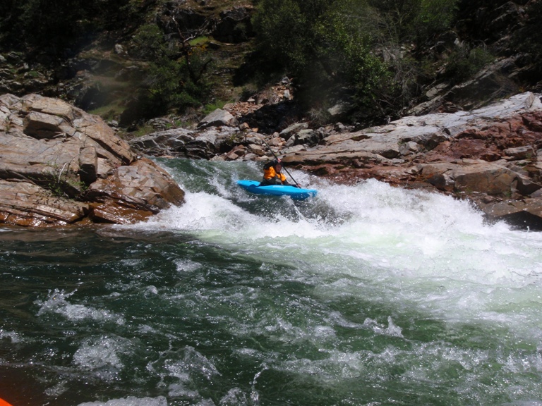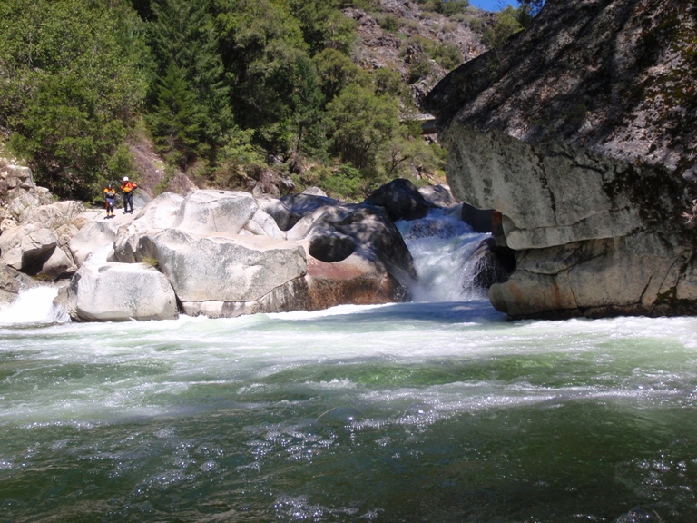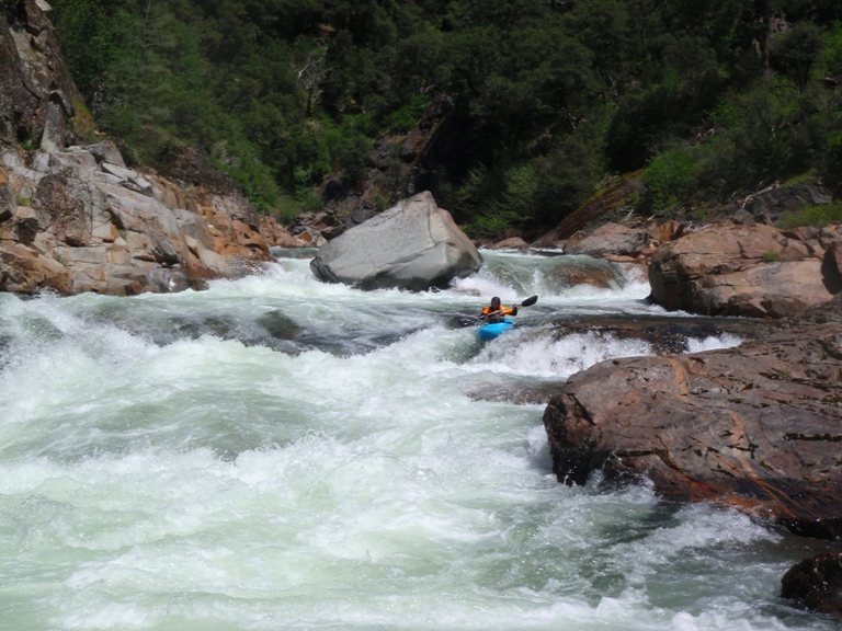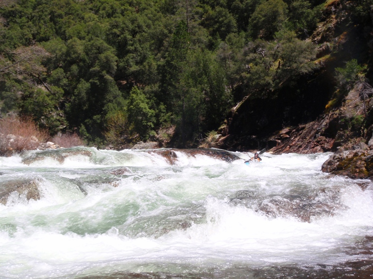 - The Dieter King Drop (V+). I don't know if anyone else has run this drop, maybe folks have. I was told Dieter ran it with more water. At our flow the center rock formed a large pillow and dropped most of the water down two cracks on either side of it. The photos from below make it look good to go, but don't be fooled.