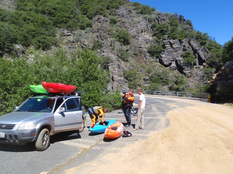 As the weekend progressed it looked like flows were going to drop from the rain spike to a runnable level. With optimism I organized my North Carolina and German as well as arranging a second car to save driving two cars from Sacramento. The plan was to do the North Fork of the Tuolumne on Friday and then drive to the Upper Clavey take-out that night. Foolishly looking at google earth, the computer (which we know are never wrong) told me the quickest way from the NFT put-in to the Clavey take-out was to drive the dirt roads. This ended up taking 1.5 hours and likely blew the shocks in Diane's car (though for the record the CRV did make it!). In hindsight the quicker way would have been to drive the 17 miles or so on perfectly nice paved road to the Upper Clavey put-in and then drive 6 more miles on nice pavement, followed by 3 miles on nice gravel, ending with only 3 miles on a decent dirt road, a route that would have taken less than an hour (or so) and would have provided much less abuse than 20 miles on dirt roads that occasionally bordered on crap.