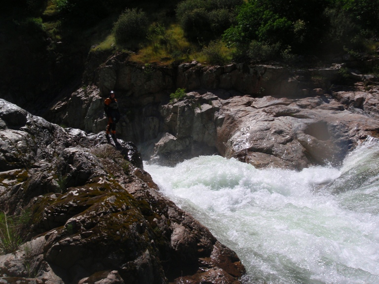 The Ledge (V). The lead in was a good class Iv to IV+ rock and hole dodging affair. At the end of this dodging we realized the bottom ledge was bigger than our brief scout from the top led us to believe and we narrowly caught eddies at the lip. Upon further scouting we found a 8 to 10 foot ledge with a bad pocket on the left and a depressed pocket on the right. Jonas decided to run onto the jet of water flushing out between the two. Looked easy though so did the walk on the left.