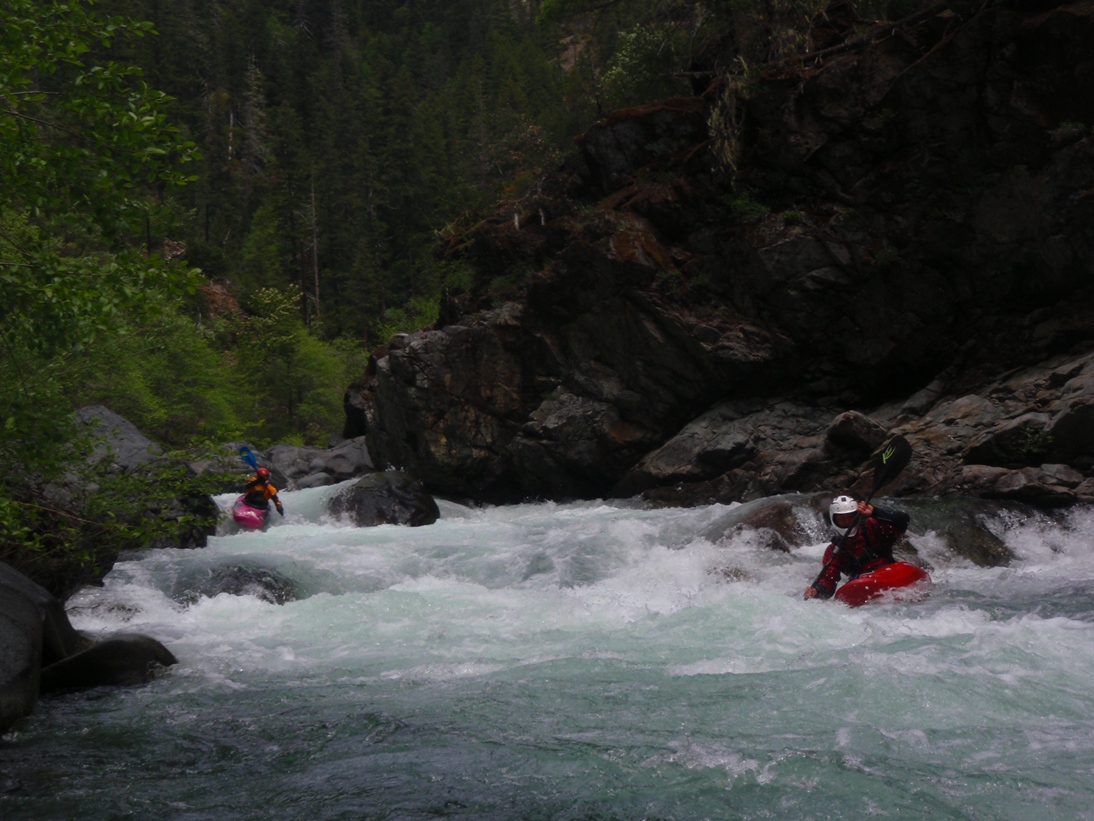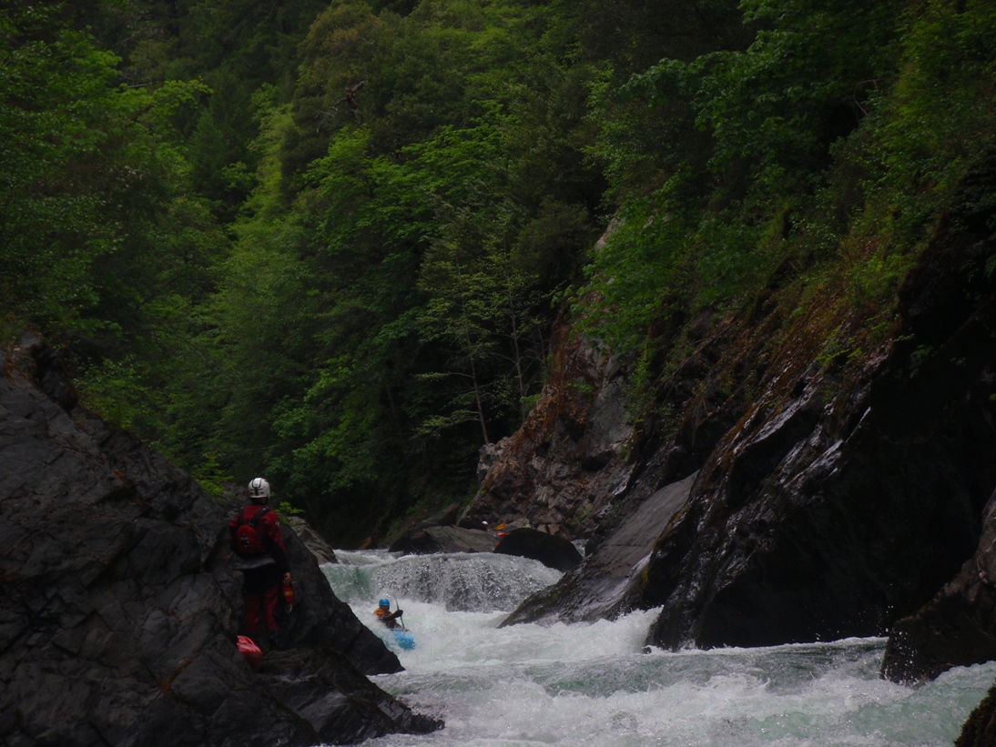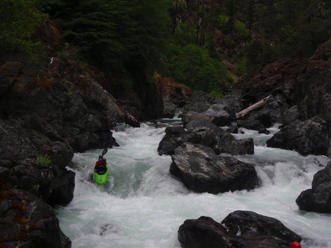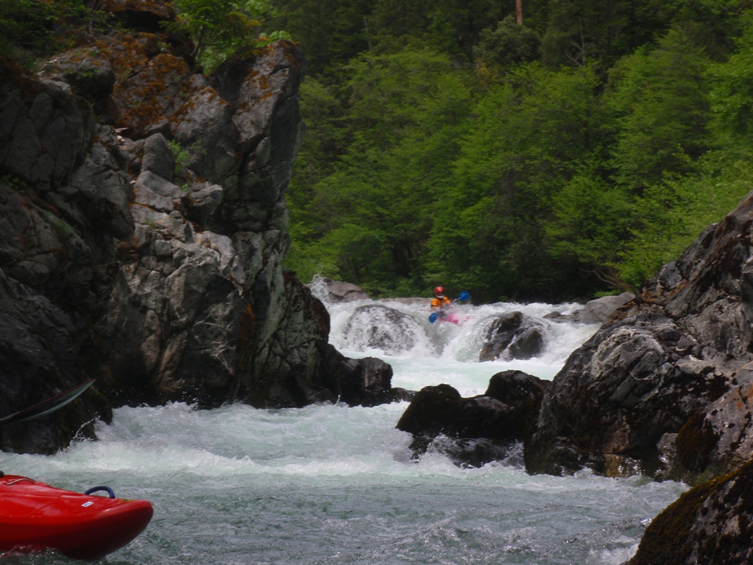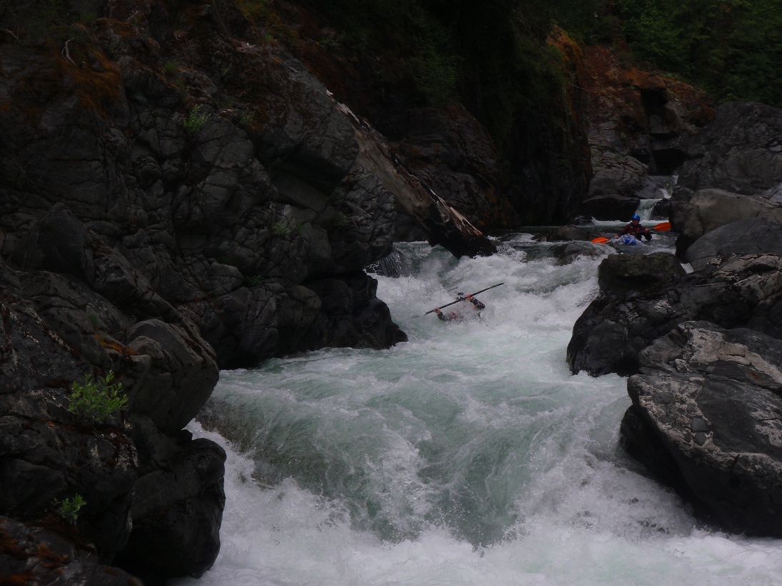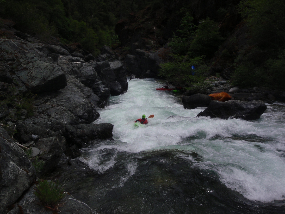 First Rapid (IV+). The first rapid can be seen from the trail on the way in. Move right at the top and boof the hole below.