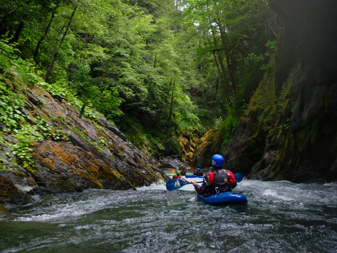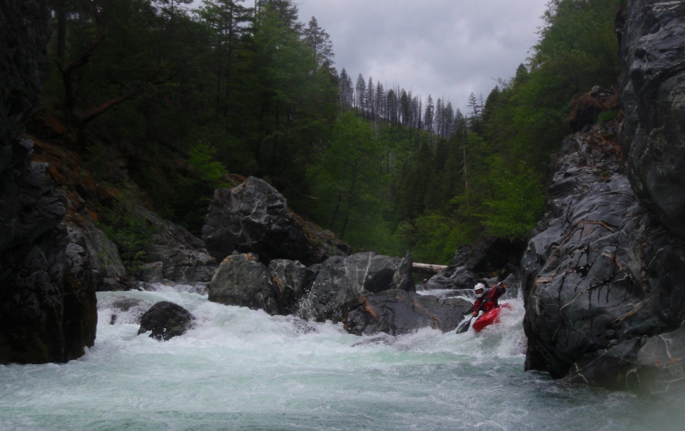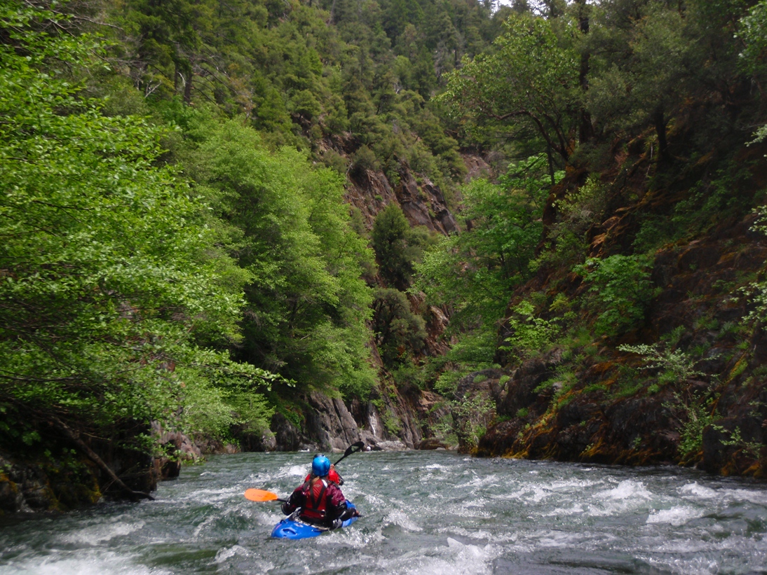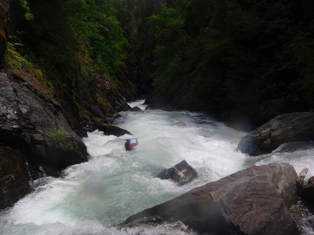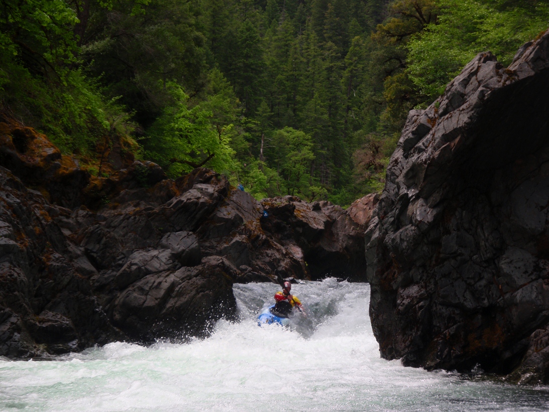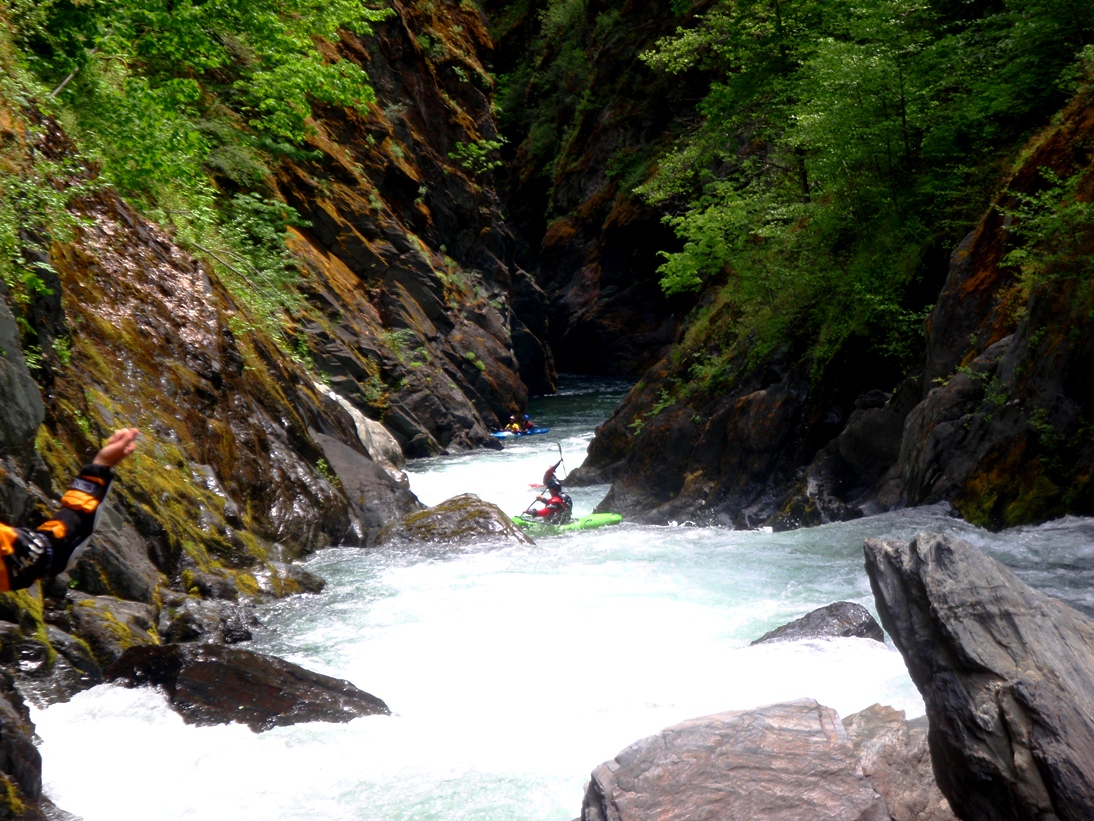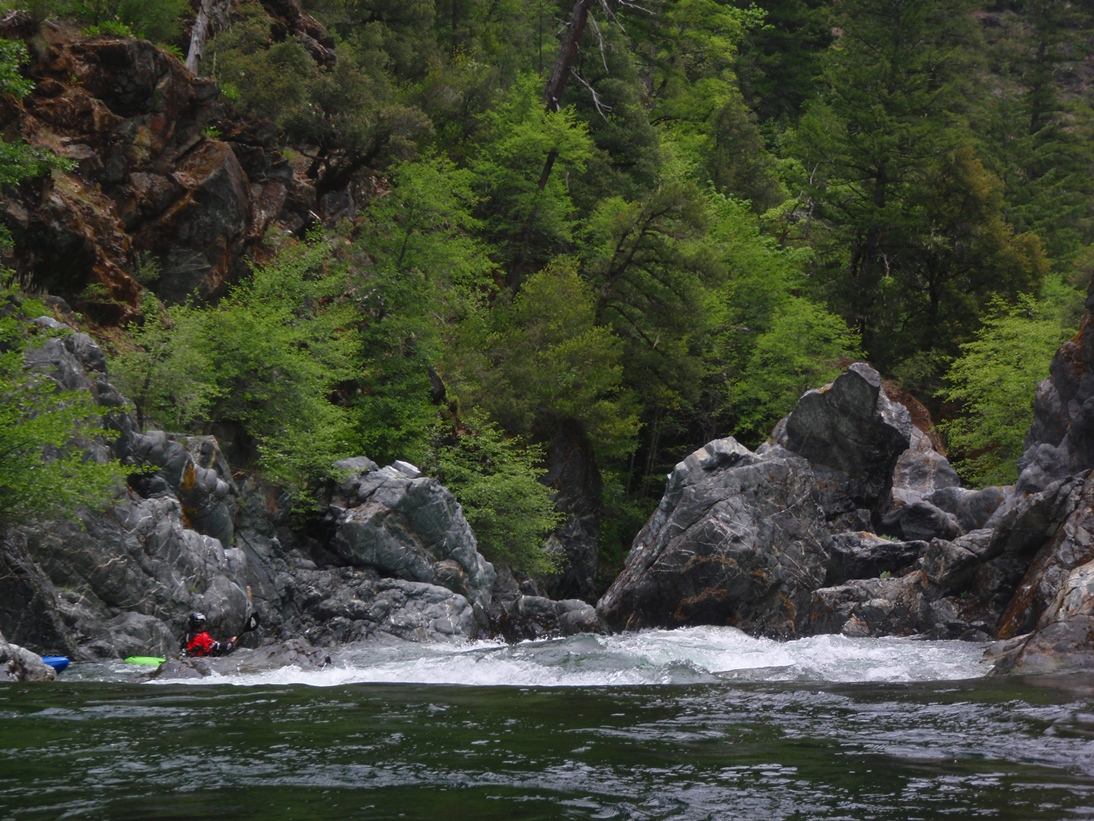 First Rapid (IV+). The first rapid can be seen from the trail on the way in. Move right at the top and boof the hole below.