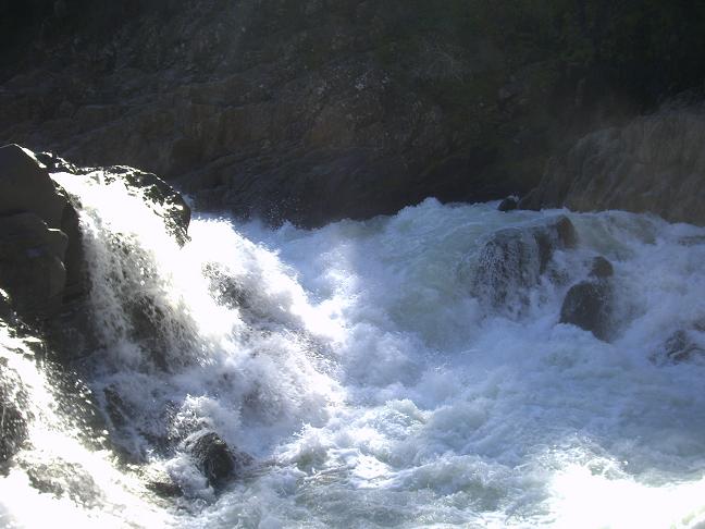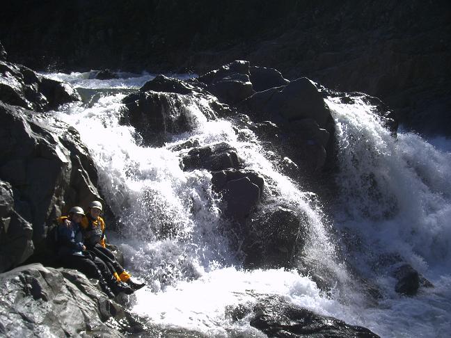 Seven (III+). A long bolder garden, best run on the right, leads into a bit of a steaper cascade, there is a rock at the end which we all exited to the right of. Immediately below is the falls, get out on the right just downstream of the rapid.