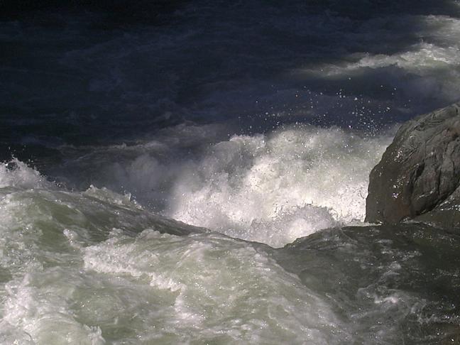 Three (IV). (Scouted on left) This rapid consisted of three features. There was a weird boil wave at the end of the "V," followed by a large hole, followed by a pyramid rock with a lot of current going into it. We ran just off the left edge of the meet of the boil, into the second hole, and then got high on the pillow off the side of the rock. I eddied right at the bottom, at high water this eddy may not happen. The next rapid is immediately below.