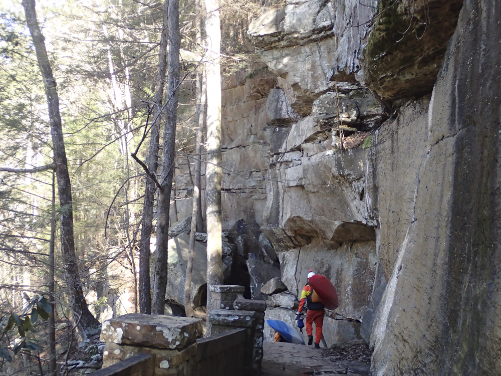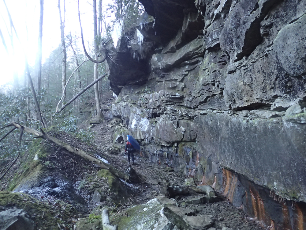 From the river: When you get to Bark Camp Creek (note there are a few small structures up just a short ways from the river on creek left), get out on creek left and climb 100 ft to find the trail. Follow this for ~150 yards to an old bridge site. You will need to rock hop to cross the creek to creek right. The trail then climbs from there. Stay left at a few forks, they will tell you it is a quarter mile to the top... I think it felt a little longer than that personally.