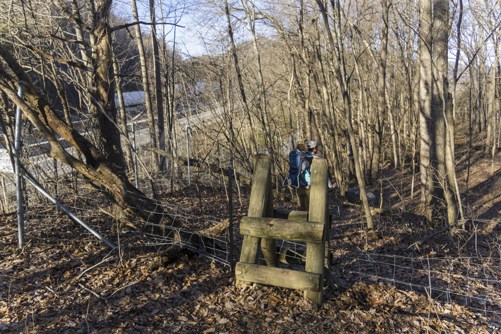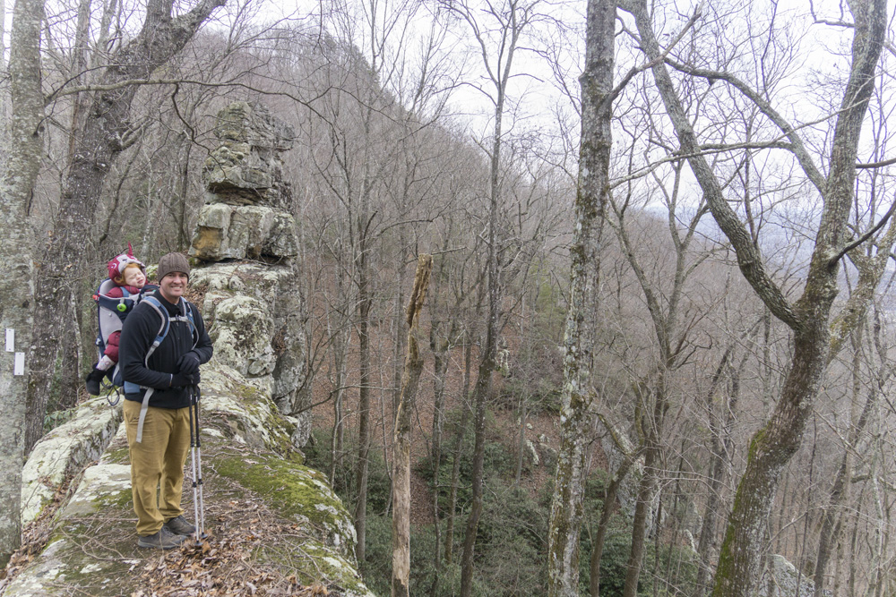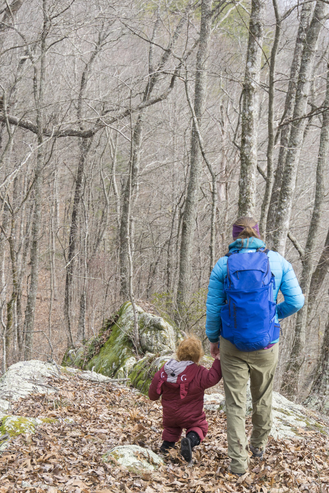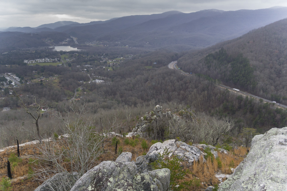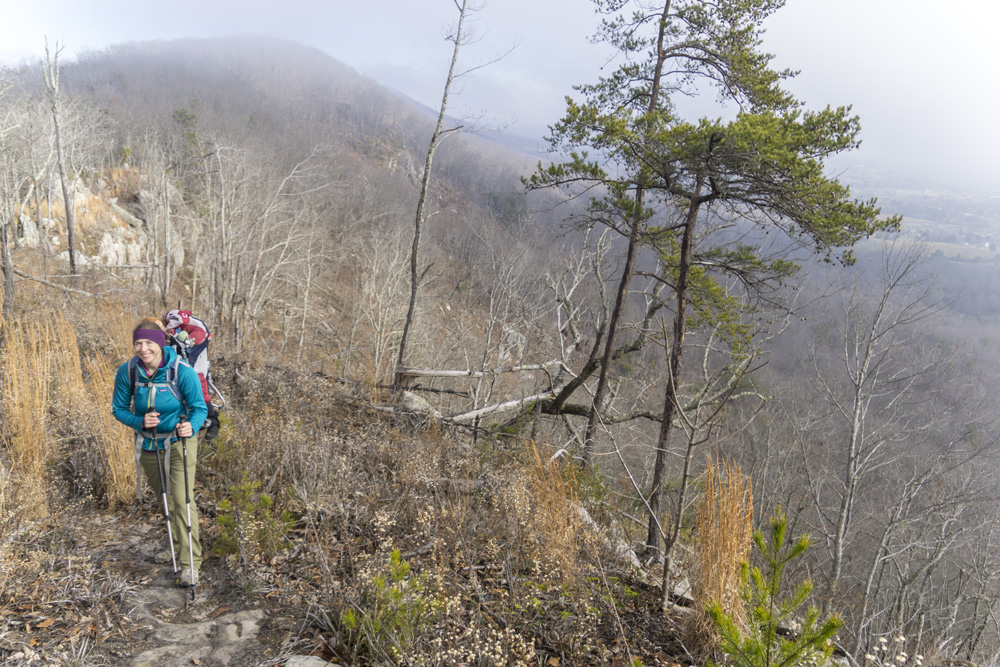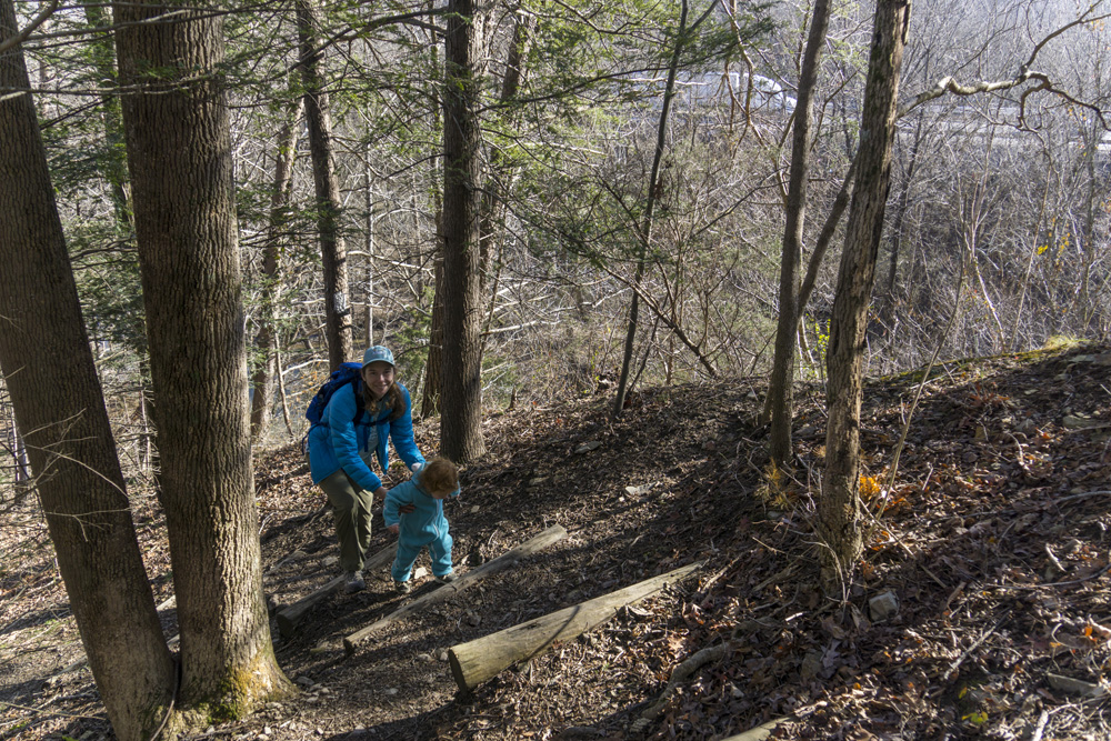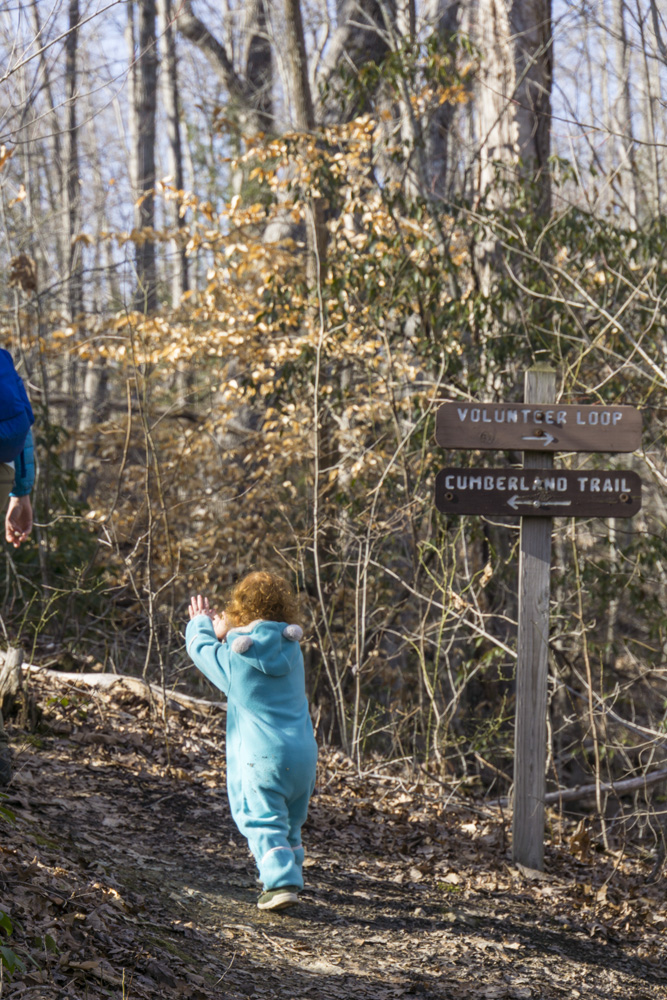- Description: I am really torn on giving this one star versus two. The first 1.5 miles is a nice enough hike, a couple brief climbs, a ridge walk, mountain views etc. It is nice. The trail is nicely made such that Aster was able to hike the first mile which also climbed 200'. Just after the first mile the second climb is more of a typical steep Cumberland Trail affair which takes you back up to the ridge along the highway. You cross a "creek" that runs under the highway via a bridge and then quickly the hike goes south. While the highway is always noticeable, it at times is loud and is regularl able to be seen, once you cross the fence to the highway easement zone for the final quarter mile it is obnoxiously close. You literally walk between the highway and a billboard. To add to it, our day was during a freeze thaw so this part of the trail was a muddy, slippery mess. I think however, most people don't use this trail to access Devil's Racetrack. So rating it based on that last quarter mile would be unfair. Instead, I will say next time I would be more inclined to do this hike as an out and back, skipping that last quarter mile and returning via the parellel Vollunteer Loop. So, since that sounds like an appealing enough hike to me, on a nicely made trail, I am going to give this a two star hike.