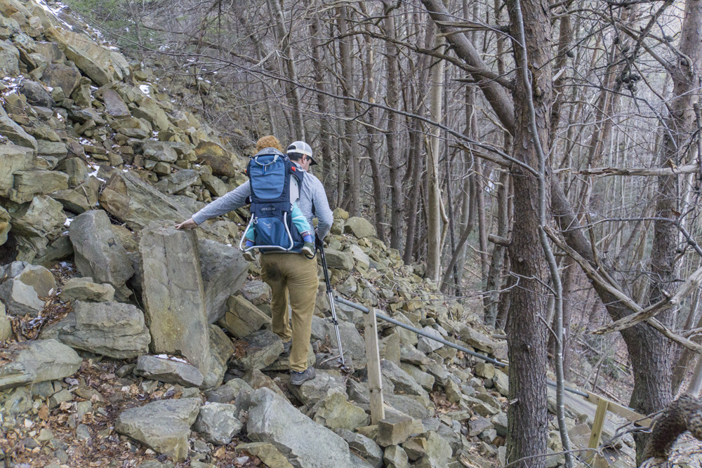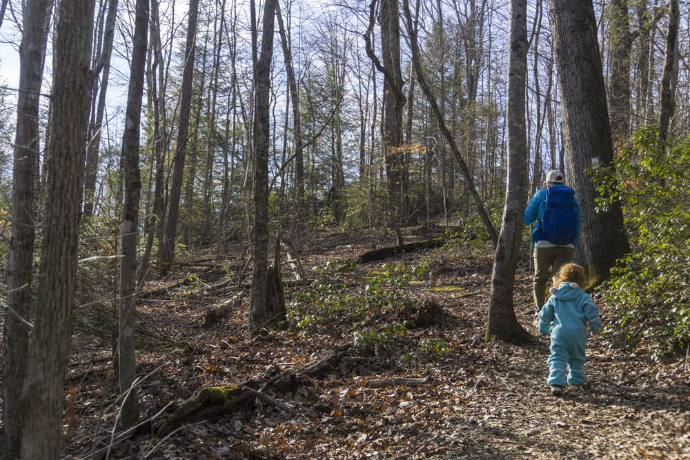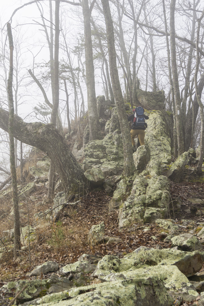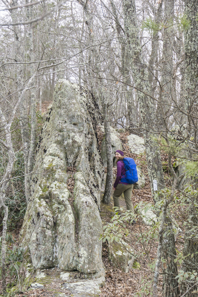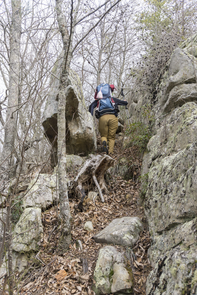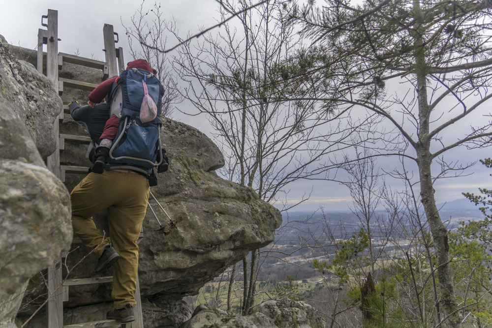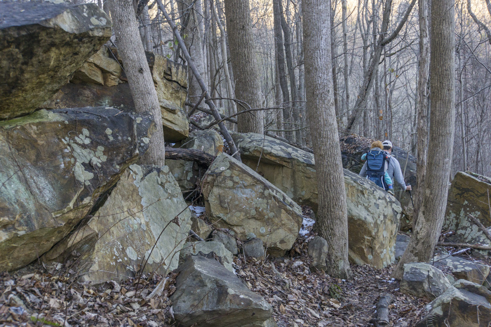 - Description: I am really torn on giving this one star versus two. The first 1.5 miles is a nice enough hike, a couple brief climbs, a ridge walk, mountain views etc. It is nice. The trail is nicely made such that Aster was able to hike the first mile which also climbed 200'. Just after the first mile the second climb is more of a typical steep Cumberland Trail affair which takes you back up to the ridge along the highway. You cross a "creek" that runs under the highway via a bridge and then quickly the hike goes south. While the highway is always noticeable, it at times is loud and is regularl able to be seen, once you cross the fence to the highway easement zone for the final quarter mile it is obnoxiously close. You literally walk between the highway and a billboard. To add to it, our day was during a freeze thaw so this part of the trail was a muddy, slippery mess. I think however, most people don't use this trail to access Devil's Racetrack. So rating it based on that last quarter mile would be unfair. Instead, I will say next time I would be more inclined to do this hike as an out and back, skipping that last quarter mile and returning via the parellel Vollunteer Loop. So, since that sounds like an appealing enough hike to me, on a nicely made trail, I am going to give this a two star hike.