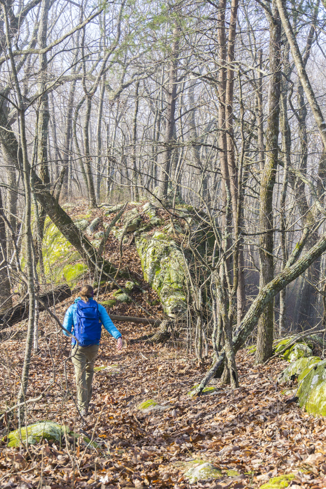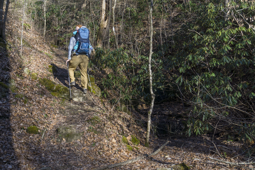 - Access: Either hike up from Cove Lake or Bruce Creek, or come in from Eagle Bluff. Getting to Eagle Bluff requires a 4-wheel drive car as Old Kentucky Rd is dirt and rutted from the North, and very steep from the South. From the South, as soon as you crest the ridge you will see the trail on your right and a parking spot for one or two cars on your right. If you pass the house, you went to far. (Location: 36.35009, -84.19185). We took two cars and left one at Tank Springs (lock your car and hide valuables) and drove the other to the top. I dropped Diane and Aster off, and drove 0.7 miles back down the south side to where the steep portion of the road ended to where I was sure the minivan with its 2-wheel drive could get back to. The hike back to the trail up the 0.7 miles of road climbed about 350'.