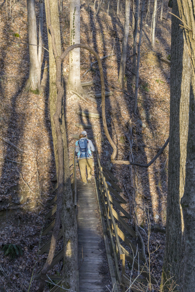 - Description: This portion of the section is done most commonly of all of these sections. Why? Because it has the most bang for your buck. The trail connects quickly to the Cumberland Trail from the parking area and quickly arrives at the waterfalls that were blasted when Highway 75 above you was routed. The falls, while articicial are impressive non-the-less. After significant rain, kayakers enjoying kayaking off all the falls! Getting above the falls is a bit steep and slick, so take care. The trail then levels off before soon crossing the creek via a bridge. Once on the other side of the bridge, the climb begins in earnest as you scale up the steep hillside to the ridge line above. Once you top out, turn right on the spur trail for the 100 yard walk up to the point which is Devil's Racetrack proper. To continue to Eagle Bluff, turn left when you top out.
