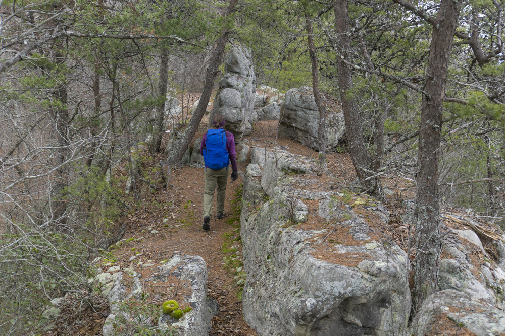 - Description: This hike was really special. There are numerous rock walls to walk on, some cliff side and some just a few feet high. There are sweeping epic views. There are steep ascents and descents. There are massive rock walls whose bases you stroll along, and a rock window to boot. Just whats not to love. Coming from Eagle Bluff to Tank Springs as a one way trip gives you all this for only ~850' of elevation gain. However for those wanting to come up from Tank Springs, you are greeted off the bat with a very steep climb that makes you earn your experience with an additional +1,000' of elevation gain!