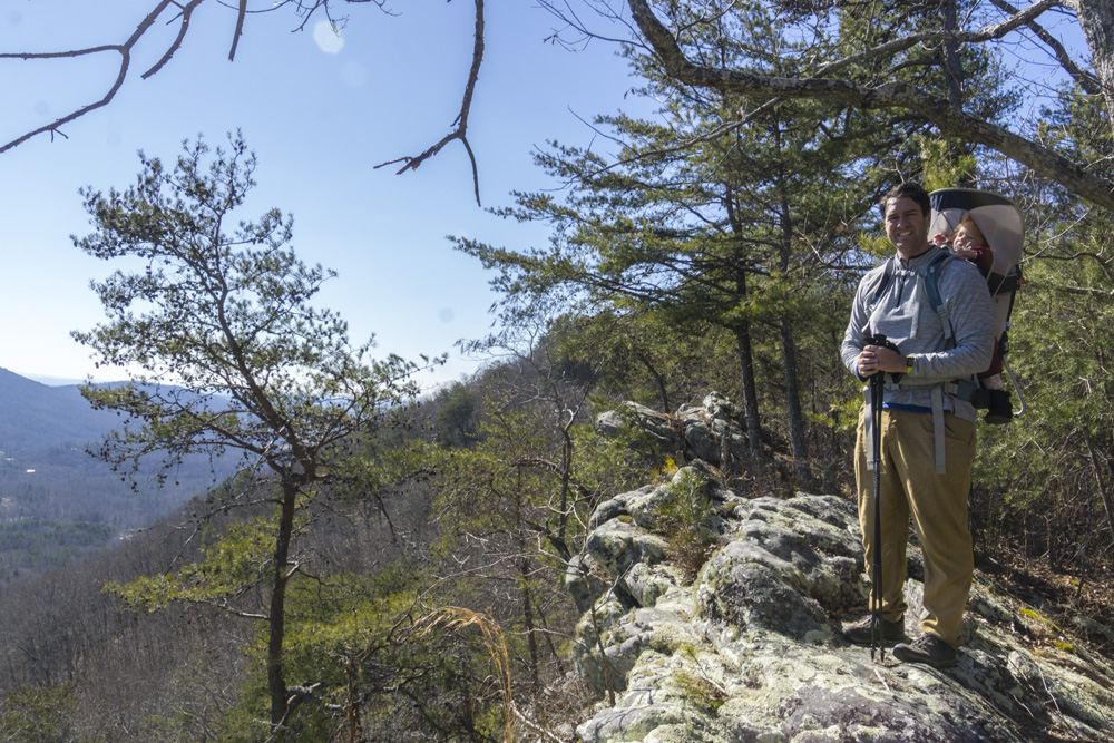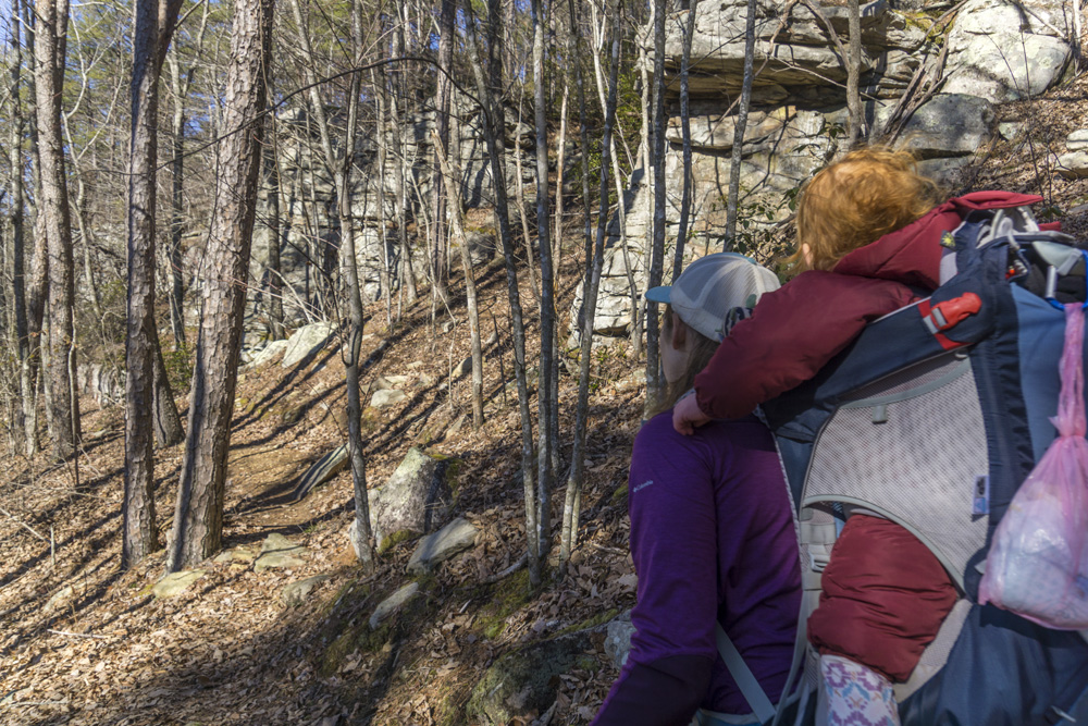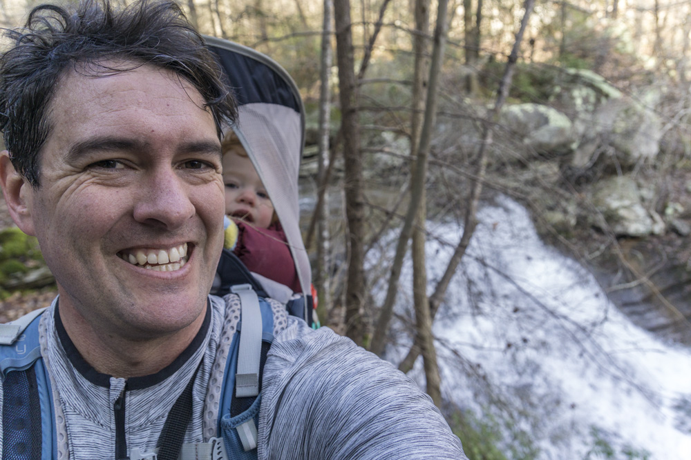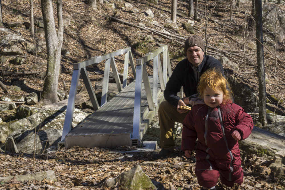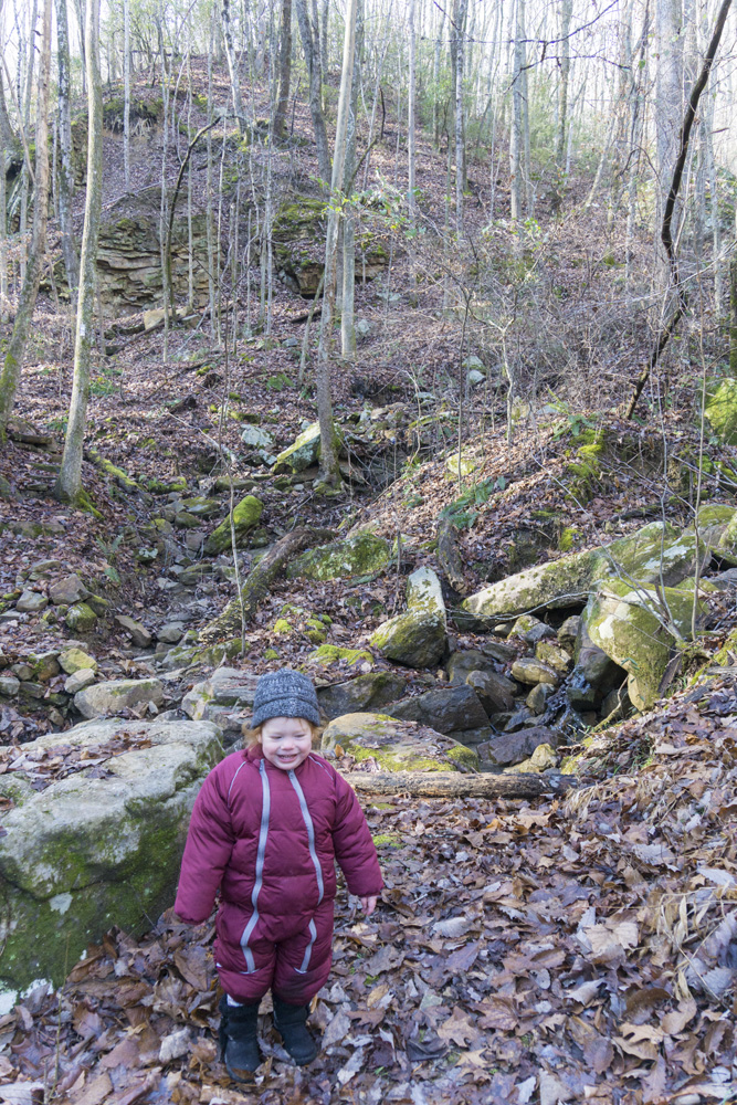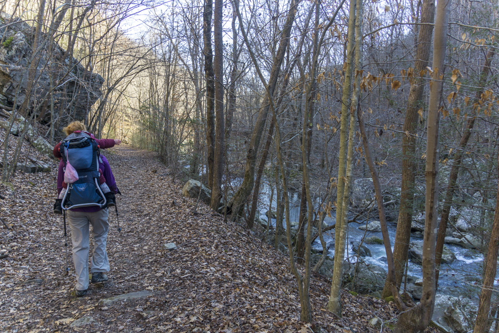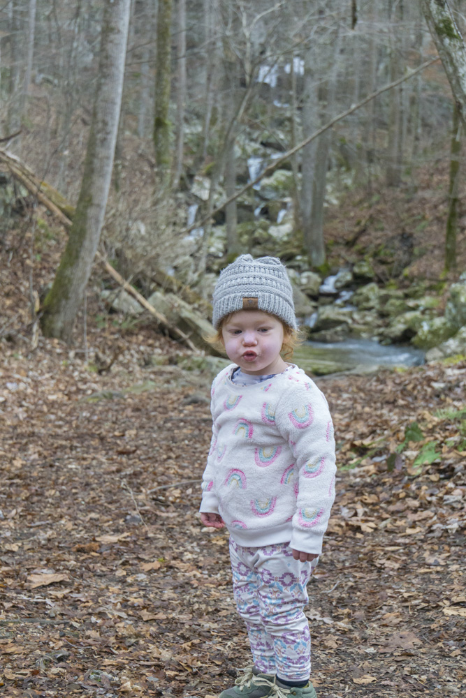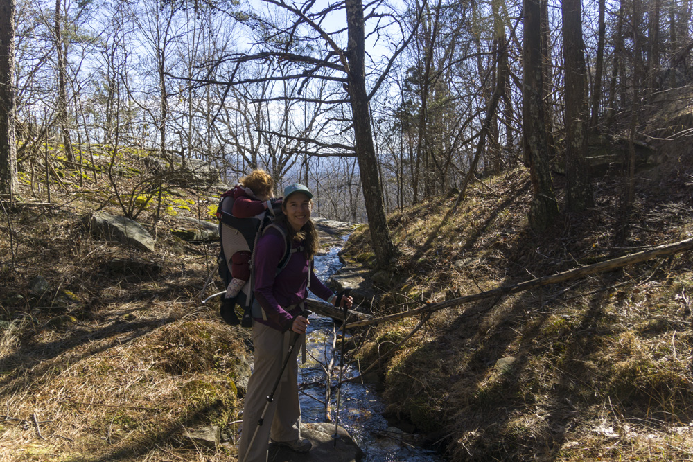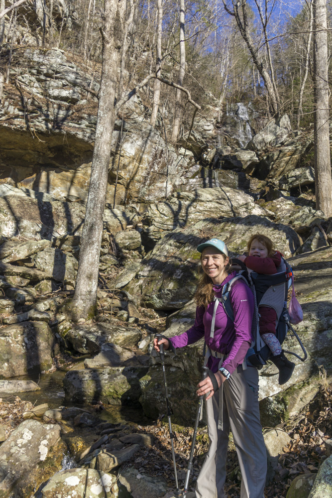 - Description: It seems this variation is the most popular hike in the area. When I did the falls I would say 75% of the people went this way rather than Snow Falls (Snow is longer), and 75% of those people turned around at the base of the falls. Once you pull up from Richland Creek after crossing the bridge over Laurel Falls at mile 1.9, you quickly get to a nice small waterfall along Laurel Creek. The rocks here are immense and soon you get to a small rock tunnel to climb through. I had Aster on my back, so I backtracked 100 ft and found a mellow way up to the trail beyond the tunnel as the tunnel was not baby carrier on back friendly. The switch backs get steep beyond here and you keep going until you get to the falls. It gets really rocky if you want to work your way to the water level itself.