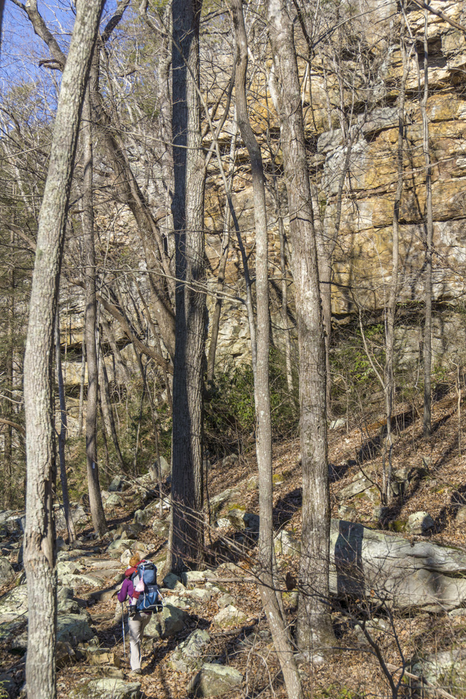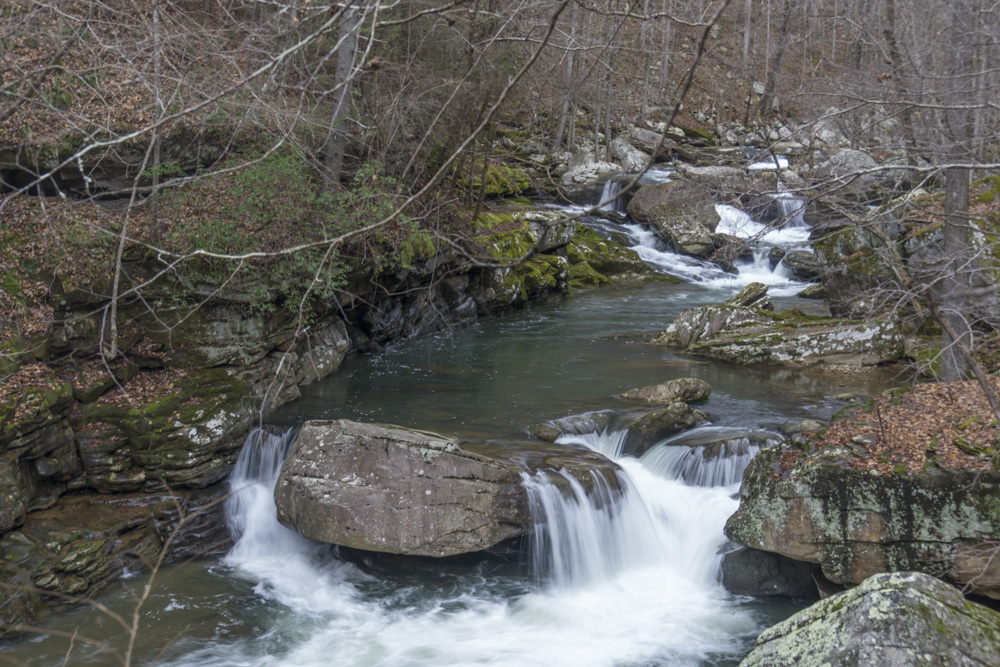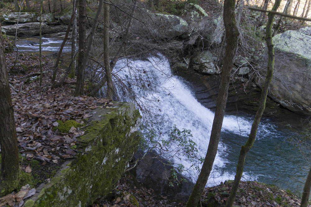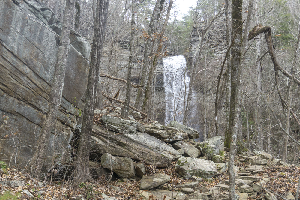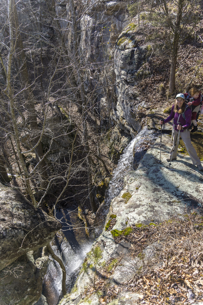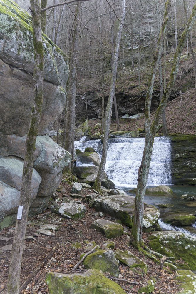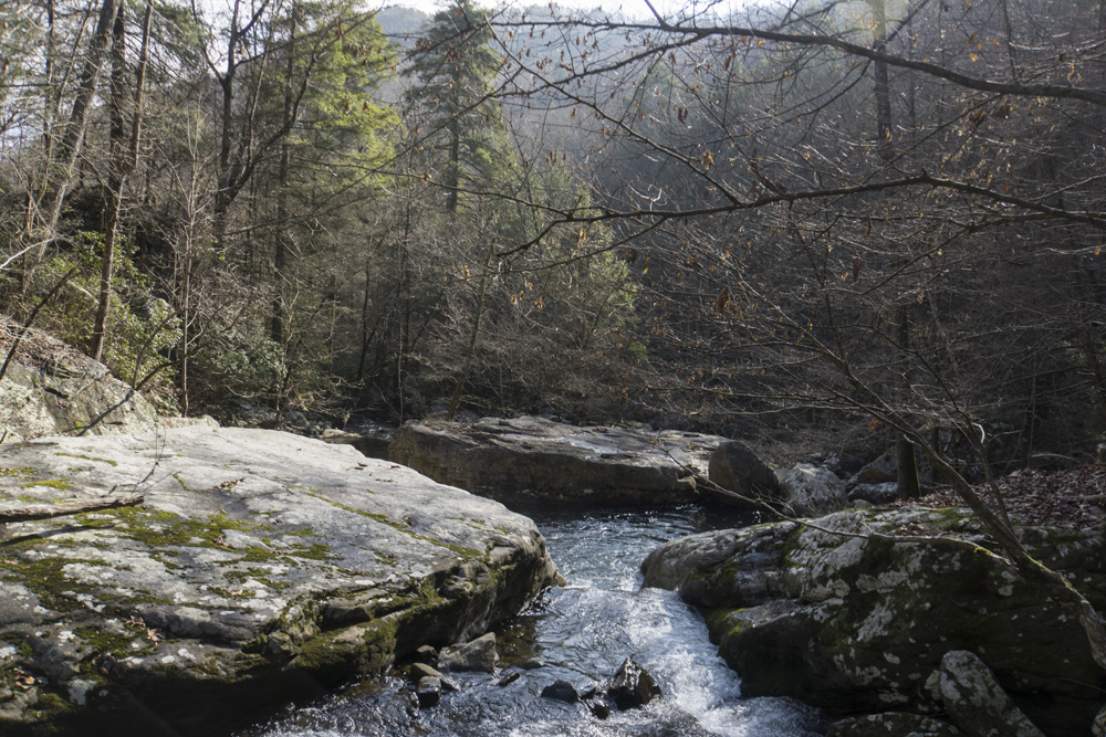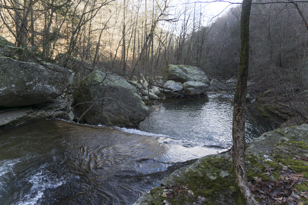- Description: From the base of the falls, look for the trail the cuts back and climbs up to the bluff line's base. There were a lot of rock climbers out the day I was there. Work along the base and you will come to a gap in the wall that is the only way up. It is a steep climb that is a fun adventure, I was able to do it with Aster, but some certainly may not be comfortable with this and turn back. Once on top, there is a campsite, and you can walk across the bluff's edge and eventually up the creek above the falls. You will then come to a creek crossing (just 100 yards above the falls), I stopped here as it was 30 degrees, I would have had to have gone barefoot as it was too deep, and it was cold so I didn't want that... but also more importantly, I was solo and had Aster on my back and I didn't feel comfortable with the risk though it was admittidly low risk. Once on the other side though you walk the bluff line back out towards Richland Creek. I was told though from some friends that have done it that the views were not as good as expected as they were not open views without trees.