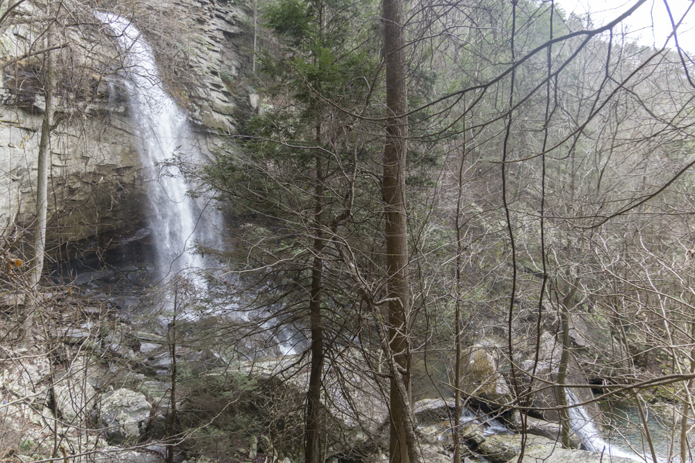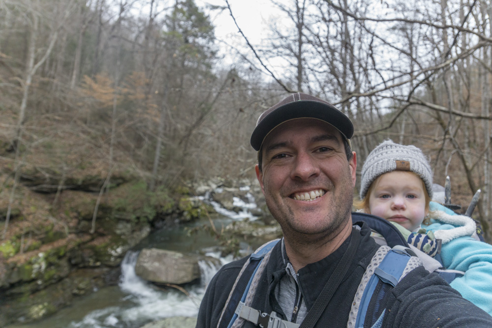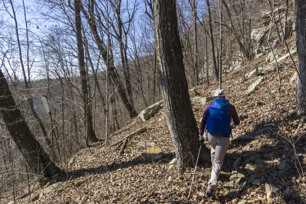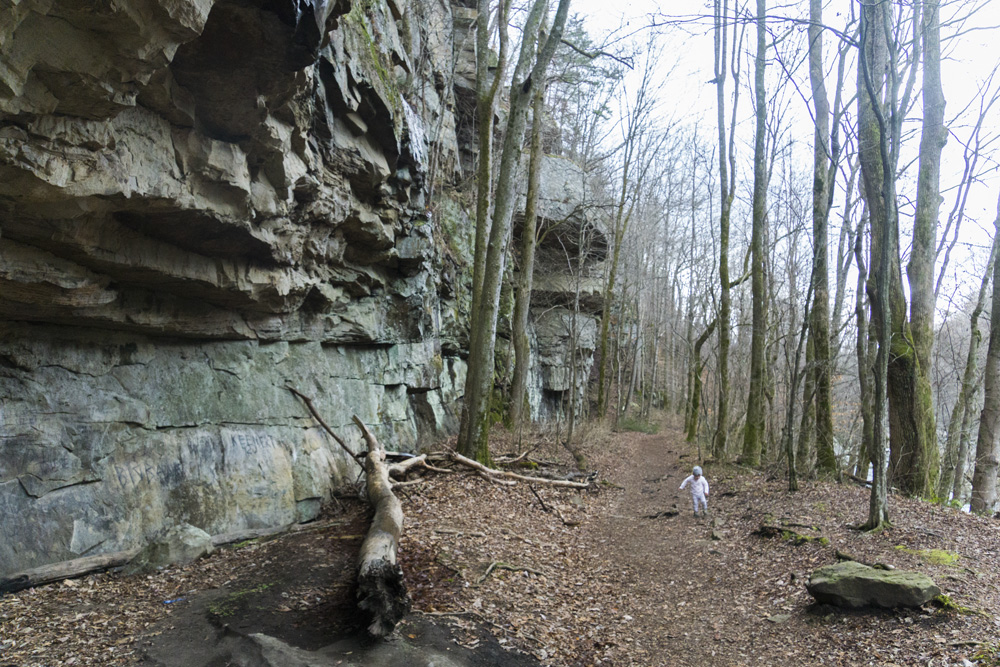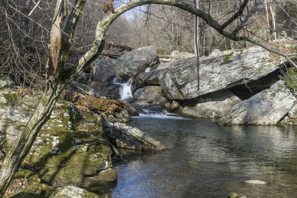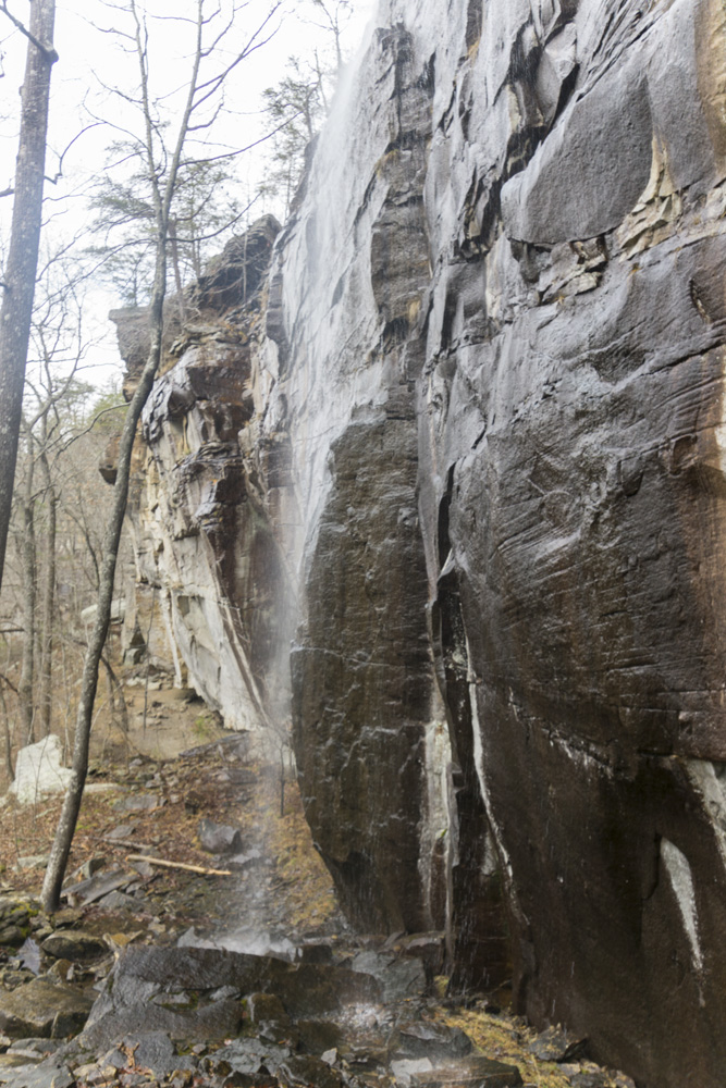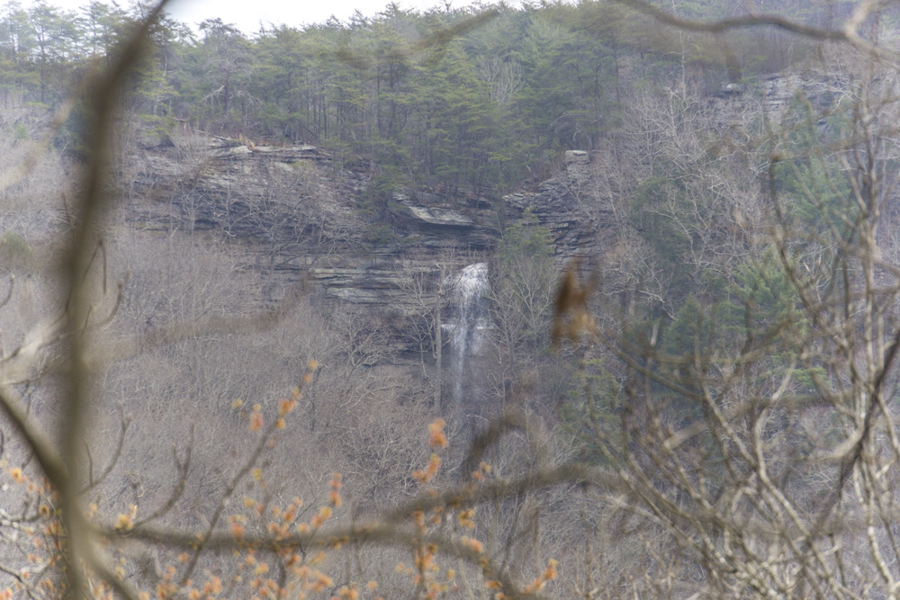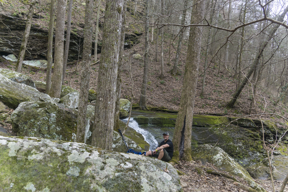 - Description: From the base of the falls, look for the trail the cuts back and climbs up to the bluff line's base. There were a lot of rock climbers out the day I was there. Work along the base and you will come to a gap in the wall that is the only way up. It is a steep climb that is a fun adventure, I was able to do it with Aster, but some certainly may not be comfortable with this and turn back. Once on top, there is a campsite, and you can walk across the bluff's edge and eventually up the creek above the falls. You will then come to a creek crossing (just 100 yards above the falls), I stopped here as it was 30 degrees, I would have had to have gone barefoot as it was too deep, and it was cold so I didn't want that... but also more importantly, I was solo and had Aster on my back and I didn't feel comfortable with the risk though it was admittidly low risk. Once on the other side though you walk the bluff line back out towards Richland Creek. I was told though from some friends that have done it that the views were not as good as expected as they were not open views without trees.