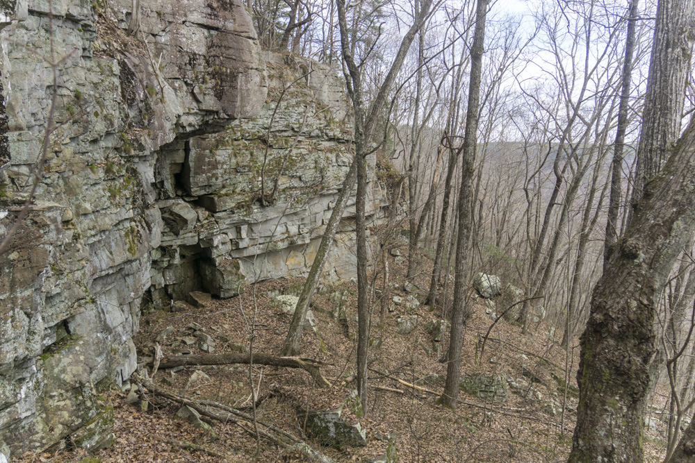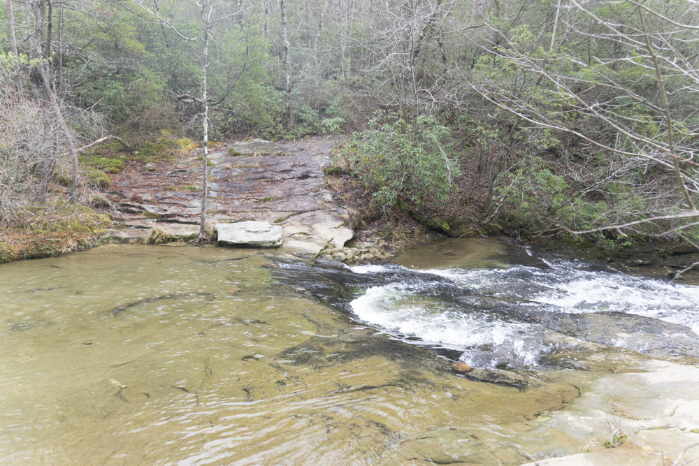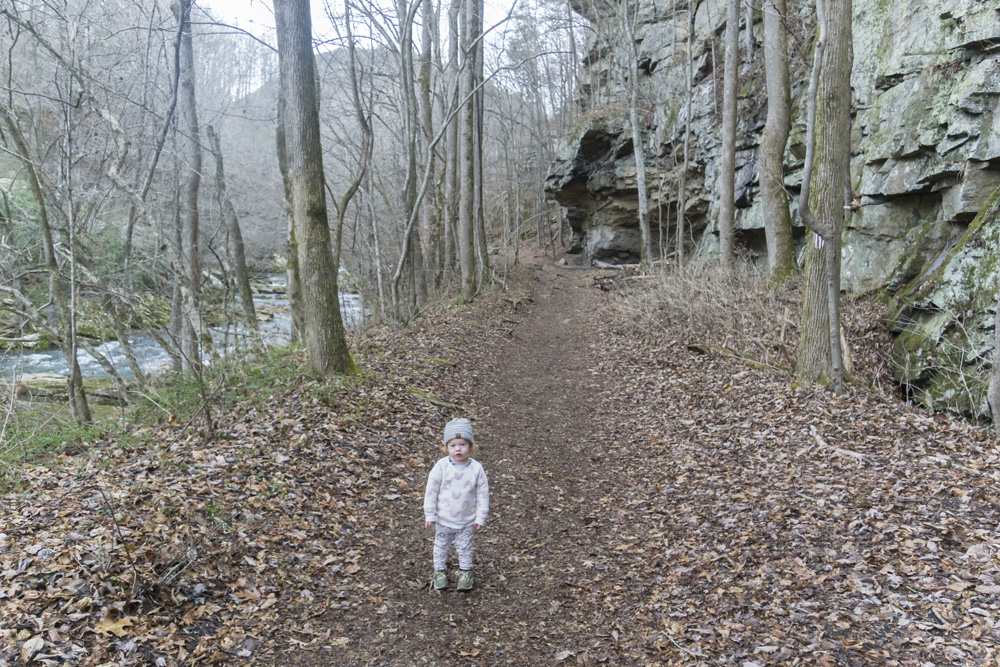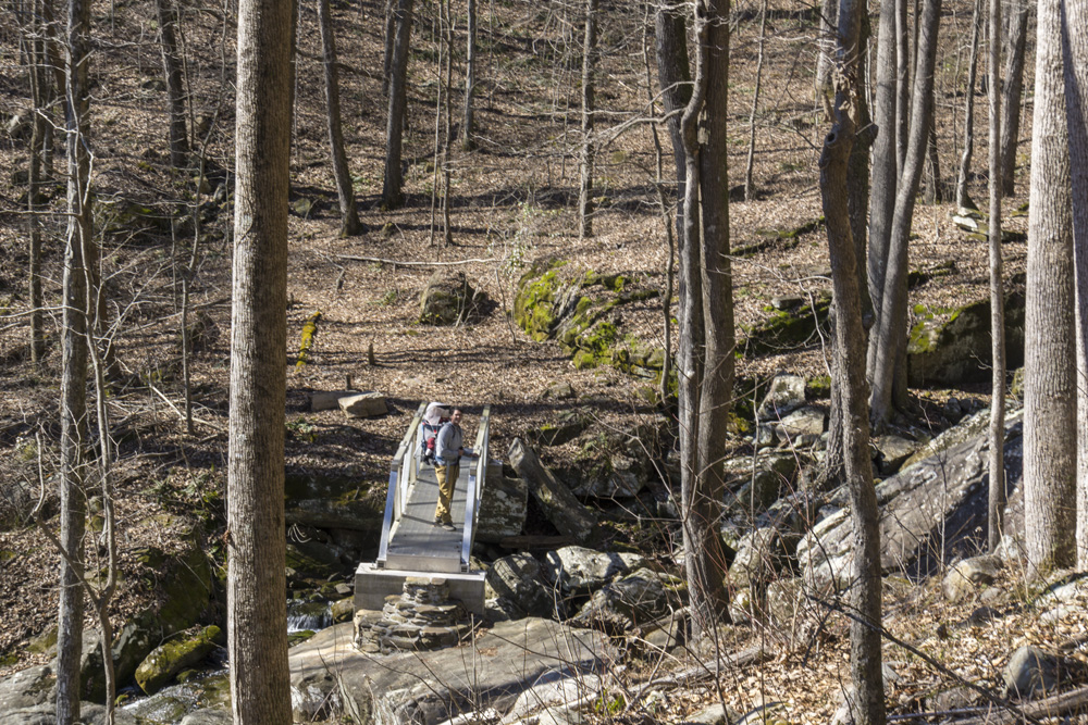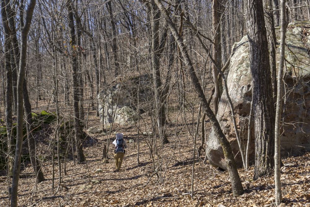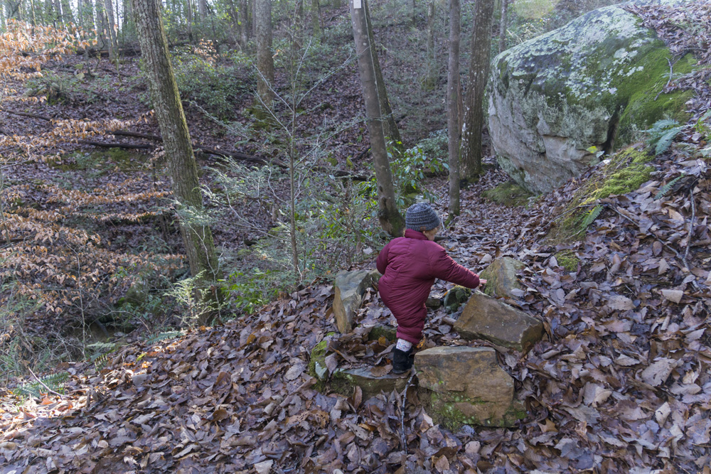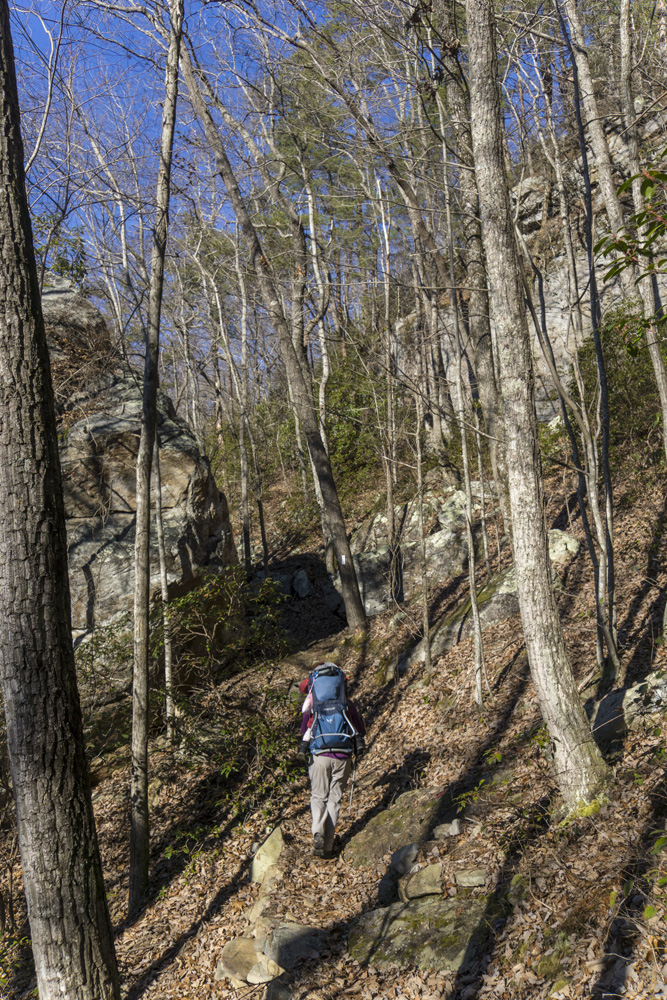 - Description: From the base of the falls, look for the trail the cuts back and climbs up to the bluff line's base. There were a lot of rock climbers out the day I was there. Work along the base and you will come to a gap in the wall that is the only way up. It is a steep climb that is a fun adventure, I was able to do it with Aster, but some certainly may not be comfortable with this and turn back. Once on top, there is a campsite, and you can walk across the bluff's edge and eventually up the creek above the falls. You will then come to a creek crossing (just 100 yards above the falls), I stopped here as it was 30 degrees, I would have had to have gone barefoot as it was too deep, and it was cold so I didn't want that... but also more importantly, I was solo and had Aster on my back and I didn't feel comfortable with the risk though it was admittidly low risk. Once on the other side though you walk the bluff line back out towards Richland Creek. I was told though from some friends that have done it that the views were not as good as expected as they were not open views without trees.