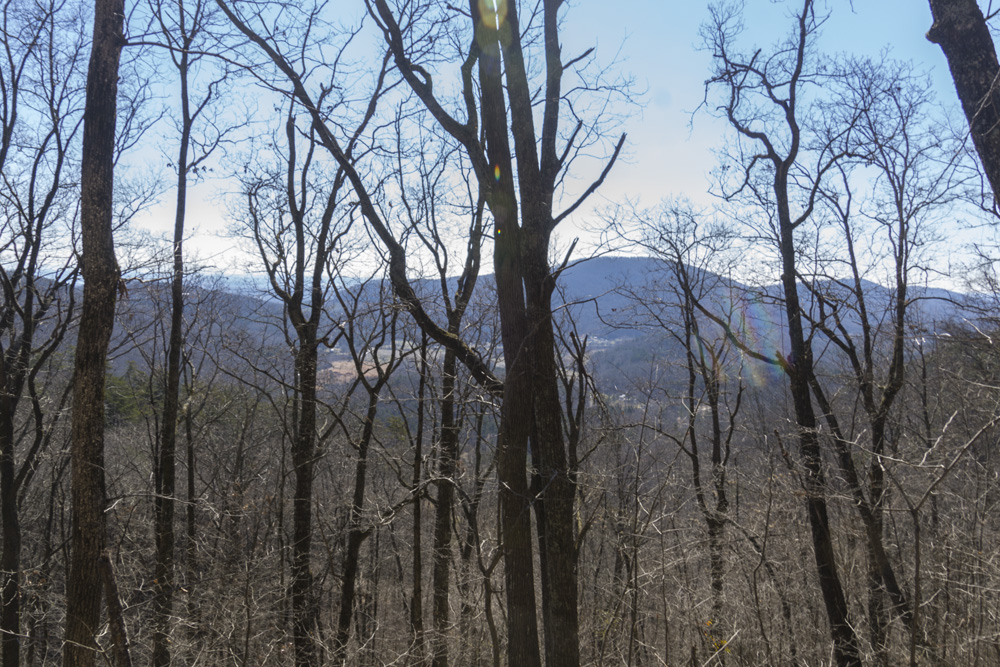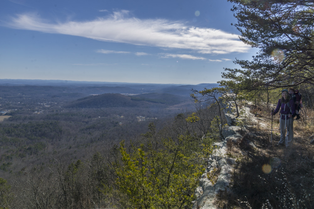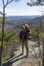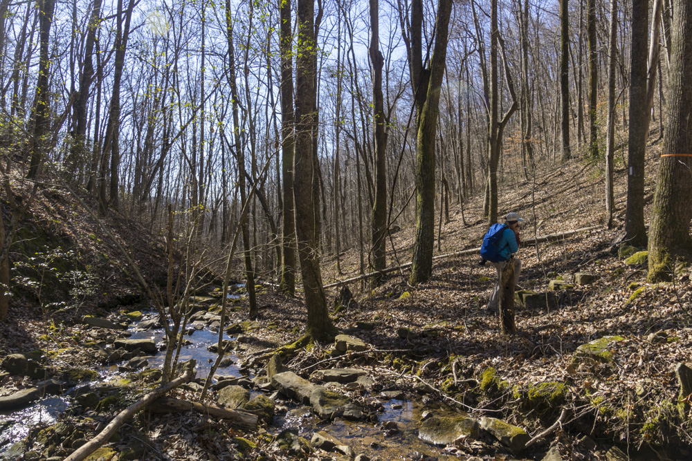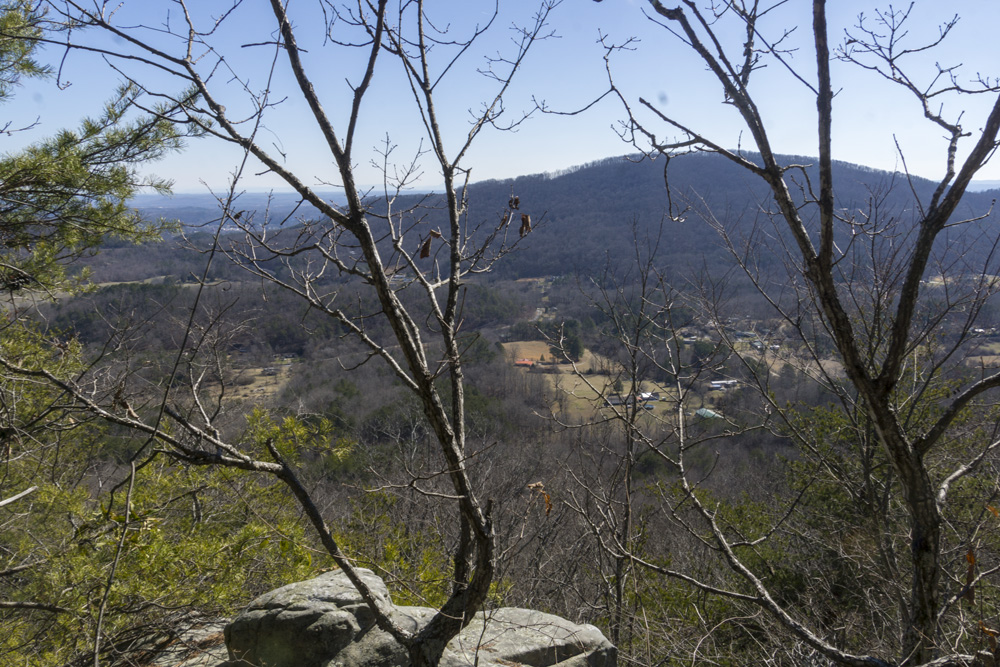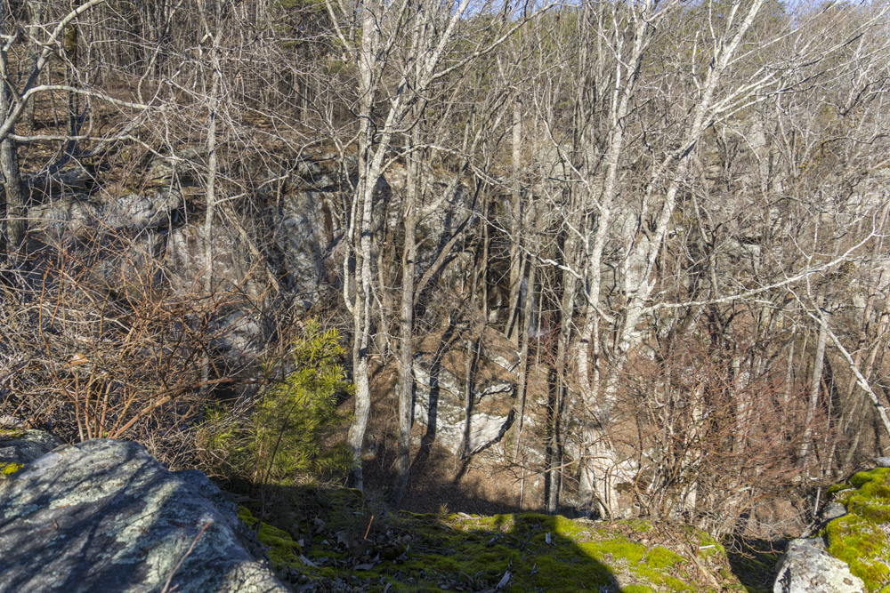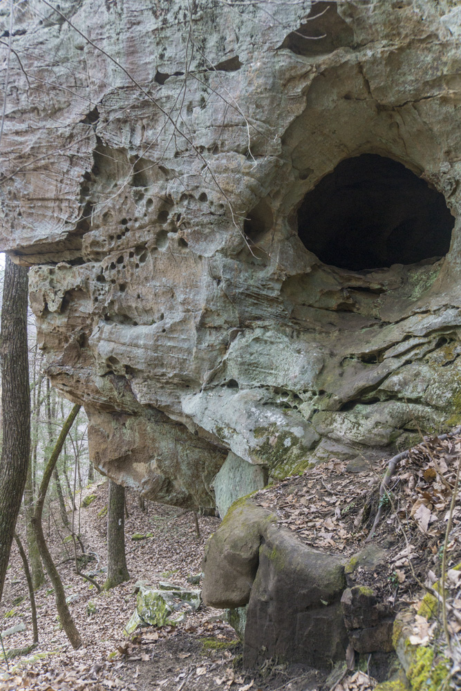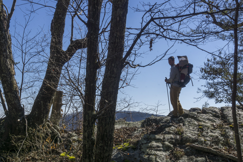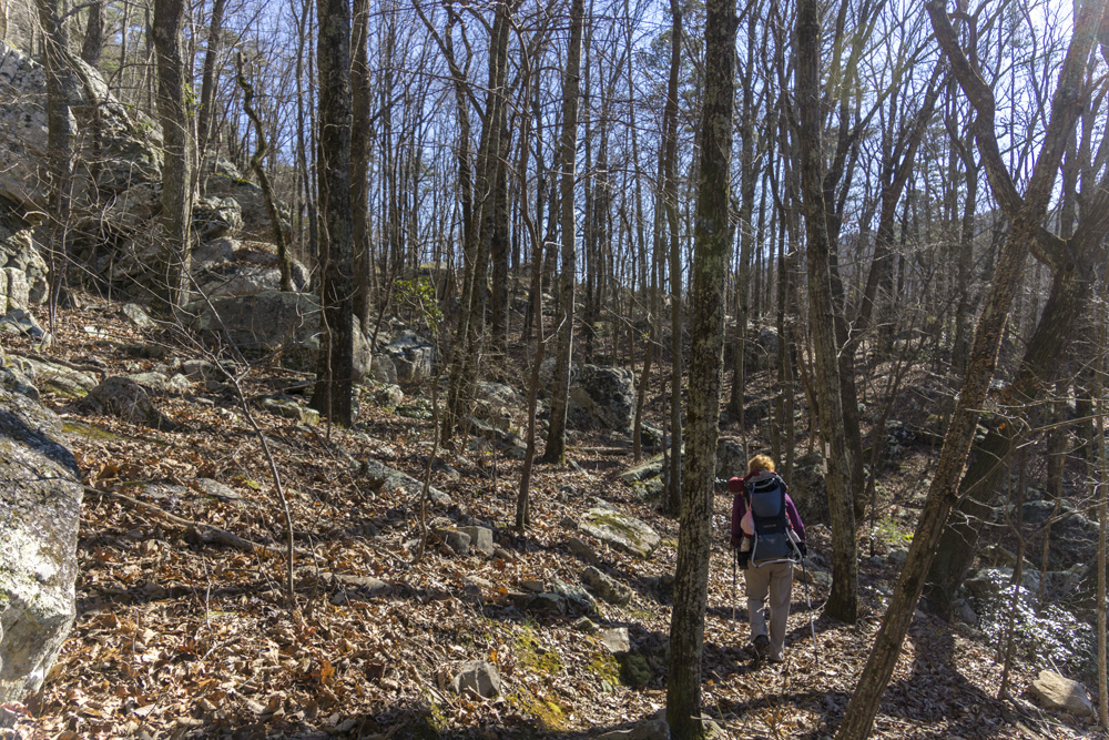 - Description: From the base of the falls, look for the trail the cuts back and climbs up to the bluff line's base. There were a lot of rock climbers out the day I was there. Work along the base and you will come to a gap in the wall that is the only way up. It is a steep climb that is a fun adventure, I was able to do it with Aster, but some certainly may not be comfortable with this and turn back. Once on top, there is a campsite, and you can walk across the bluff's edge and eventually up the creek above the falls. You will then come to a creek crossing (just 100 yards above the falls), I stopped here as it was 30 degrees, I would have had to have gone barefoot as it was too deep, and it was cold so I didn't want that... but also more importantly, I was solo and had Aster on my back and I didn't feel comfortable with the risk though it was admittidly low risk. Once on the other side though you walk the bluff line back out towards Richland Creek. I was told though from some friends that have done it that the views were not as good as expected as they were not open views without trees.