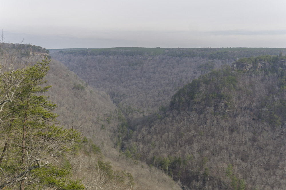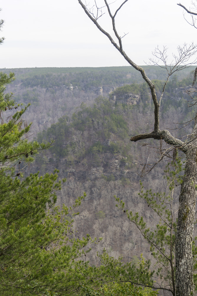 - Description: First note, the 3 stars is more for Buzzard Overlook, that is just spectacular as an end point. I would rate the hike to Snow Falls as a lone destination as 2 stars as that falls is just a little underwhelming, especially compared to Laurel Falls across the canyon. Second Note that this section has variability in its length based on how you approach the falls and the overlooks and what route you take down. It will typically be around 10.5 miles round trip. OK, so on with the description... 1.5 miles from the trailhead you will cross a bridge and hit a junction, stay left to Snow Falls (right is Laurel Falls) and continue another 0.4 miles to a triple metal bridge over Henderson Creek. You then head downriver until you are across the river from Laurel Creek. If the creek is low, you could potentially cross the creek at the campground and you would not trample any nature. This would cut of 0.8 miles both directions, if that is what you needed to make it so you wanted to do this hike or were short on time. But of course, crossing a river should not be done any time the creek has flow in it. Once across from Laurel Creek, the trail begins to climb. I found the climb to be much better graded than Laurel Falls side and it made for an easy 1.5 mile climb to the top. At the top you will go through a narrow rock passage and then see three trails. The one to the left hooks around and picks up the cut off that is the straight path, and hits the road where a sign points you left to Buzzard Point, or a right turn will take you to Snow Falls, more on that later. To the right at the triple junction, is the trail along the rim which goes towards Snow Falls. OK, so lets start with Buzzard Point, turn left on the old dirt road for the flat half mile walk out to the point. The viewpoint is spectacular. There are some wooden ladders that descend and go out to the tip of the point but for me, alone, and afriad of heights, I did not go out there as it was super exposed and the ladders seemed less than superb. The view from where everyone can enjoy was three star by itself though, and could be done as an 8 mile out and back which is much more appealing to people than the 10.5 mile Buzzard Pointand Snow Falls hike distance. OK, so now backtrack down the road a half mile to the junction. I hiked the road up to where the trail crosses 0.7 miles up the road. This allowed me to follow a small footpath to the river left side of the falls. I had hoped to find a way to cross the creek and do this as a lolipop, but, the creek is super walled out and I could not descend to creek level. So I backtracked to the road and continued up to the trail. Note, in the future, I would hike the trail North and the Road south, the trail had good canyon views going north but was forgettable going south and the road was much quicker. So anyways, back to the road and trail junction on the north end. If you are on the road going north, then you see a gate look for the trail crossing and white blazes. This is you. One large footpath junction comes in after 0.1 miles or so on the right, stay left. It was pink flagged. This then takes you down to the creek. You must cross on the rock ridge of a small ledge that is in the water. It is slippery and will have water if it is the winter months or after a storm. On the other side, the creek climbs a short ridge and then drops you down to the waterfall on the other side. For me, as a kayaker, this waterfall was more just a rocky rapid that I would likely portage. It was some 20 ft tall, but with all the waterfalls and rapids I have seen it just did not pack the punch I had hoped for. Therefore for me, Buzzard Point was by far the more memorable take away from this hike. From here, turn around and go back the way you came back down to the bottom of the trail.
