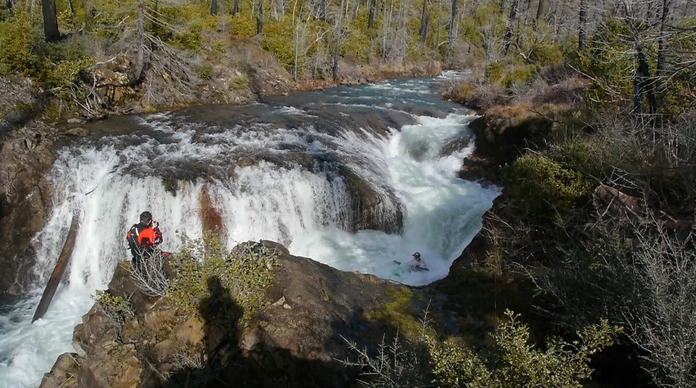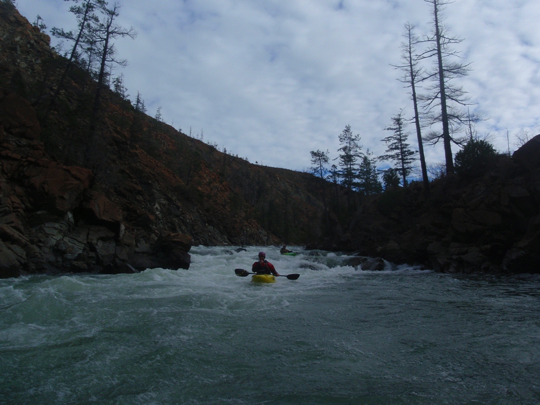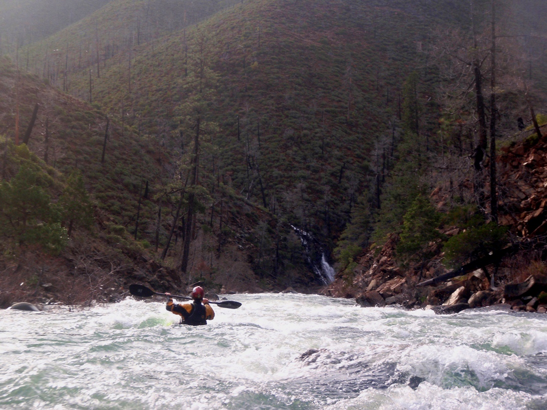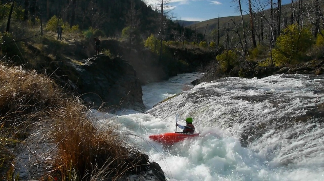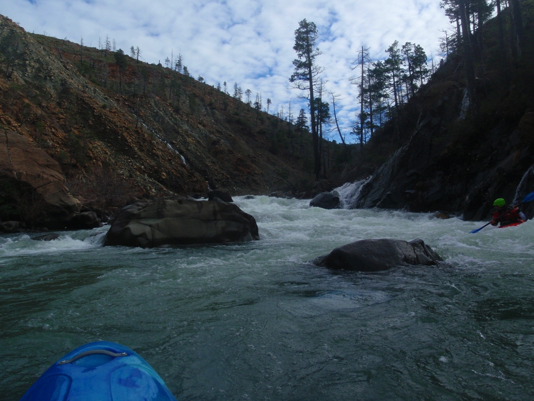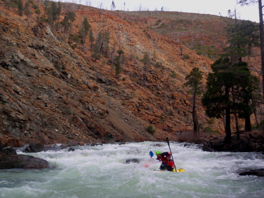 Two Falls (IV to IV+). After a few class III+ rapids you will come to a spot where small falls come down on both sides of the river. We ran down the right, there are a few good sized holes near the bottom that we boofed through.
