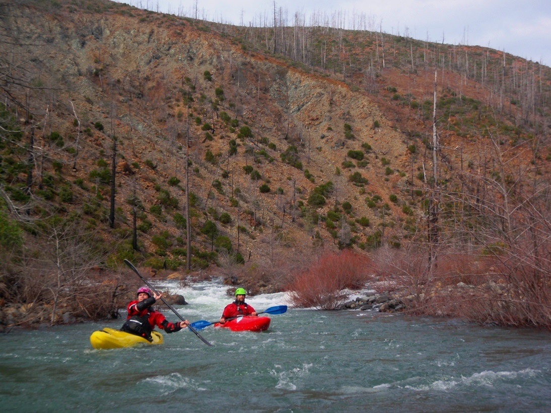 Put-in: First off, call Brad to drive your shuttle... 707-457-3365, he drives the North Fork Shuttles as well for a very reasonable price. This shuttle is long, and driving in again at the end of the day would suck. Here is the gist of it though, drive up Highway 199 to Patrick's Creek. Go up Patrick's Creek Rd (dirt). In 3.1 miles turn right to stay on Rd 316. In another 5.8 miles you will come to a large 3 way intersection of dirt roads, stay center on 316. In 2.6 miles turn left on a dirt road which climbs steeply for a mile up to a well maintained gravel road, turn left, this is rd 4402 (unmarked). Follow this for 2.6 miles around several hairpin turns up and over a small ridge. Near the bottom, turn left on a very small and shitty looking road. I don't recall having to make any turns, but the map shows that after 3.7 miles we turned left to stay on the road for another 2.7 miles. I think it was all one road. When in doubt, head down river! The last roads (3.7+2.7) are really crappy and I would recommend something better than a Highlander or Subaru for this one.