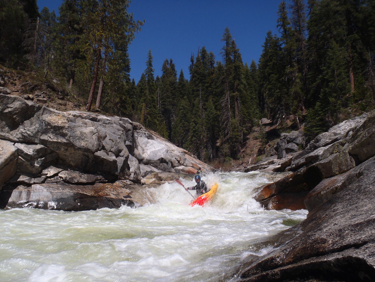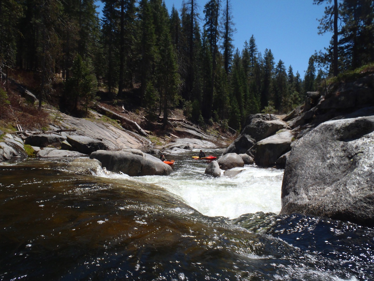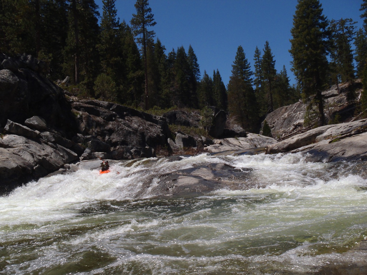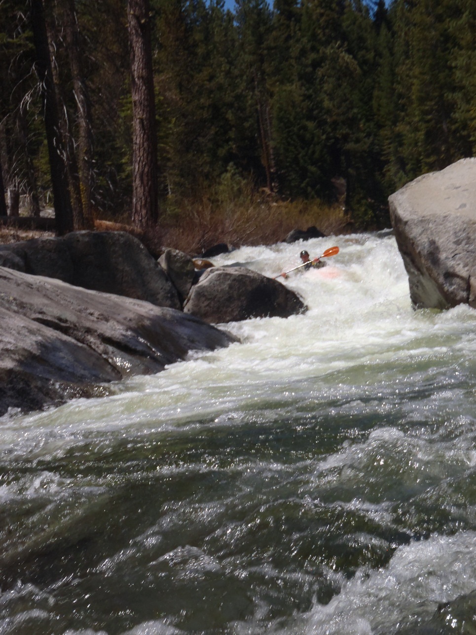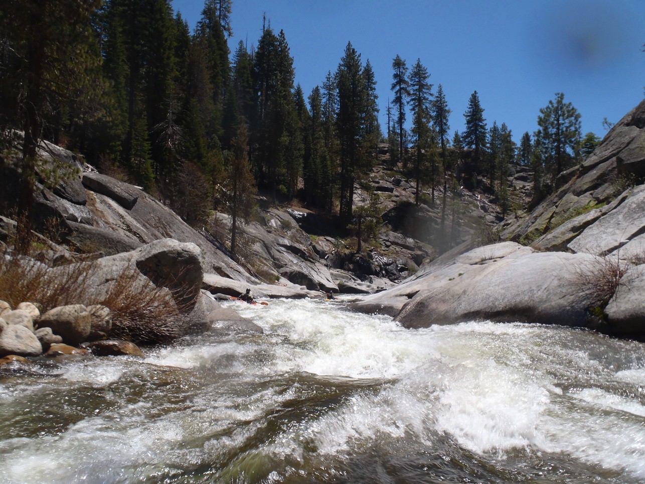 Take-out: From Shaver Lake, Take Dinkey Creek Rd East off of Highway 168 for 11.0 miles. Turn right on Ross Crossing (the sign is horribly faded). Stay left at the immediate fork. Follow for 3.5 miles (there was another fork that we stayed left on too). At 3.5 miles turn left on the small dirt road dropping down to the left. It is a bit tight, you will scratch your car. About halfway down the mountain there will be a nice clearing on the left. This is the parking. You know you have passed it by 100 feet if the road ends and you have to reverse up the road. On the far side of the clearing, amongst the trees, find the over grown trail that after 15 feet opens up into a more noticeable trail. Follow it down to the river to mark take-out before putting on.