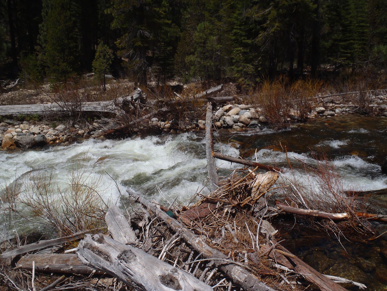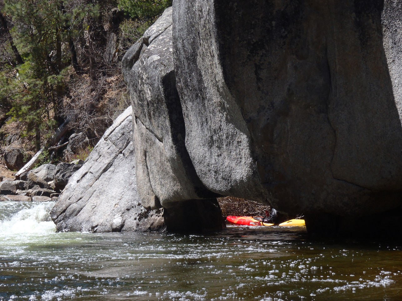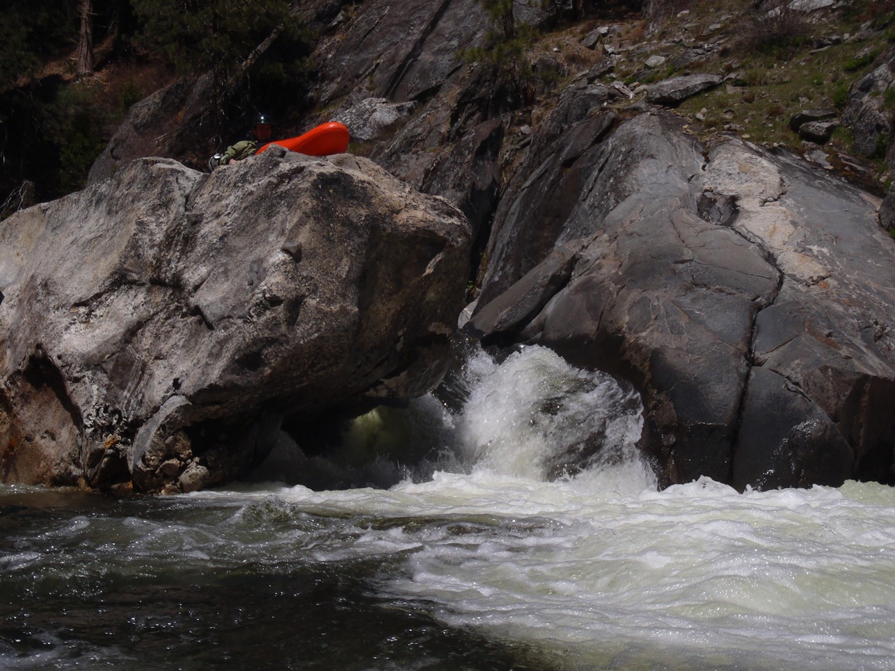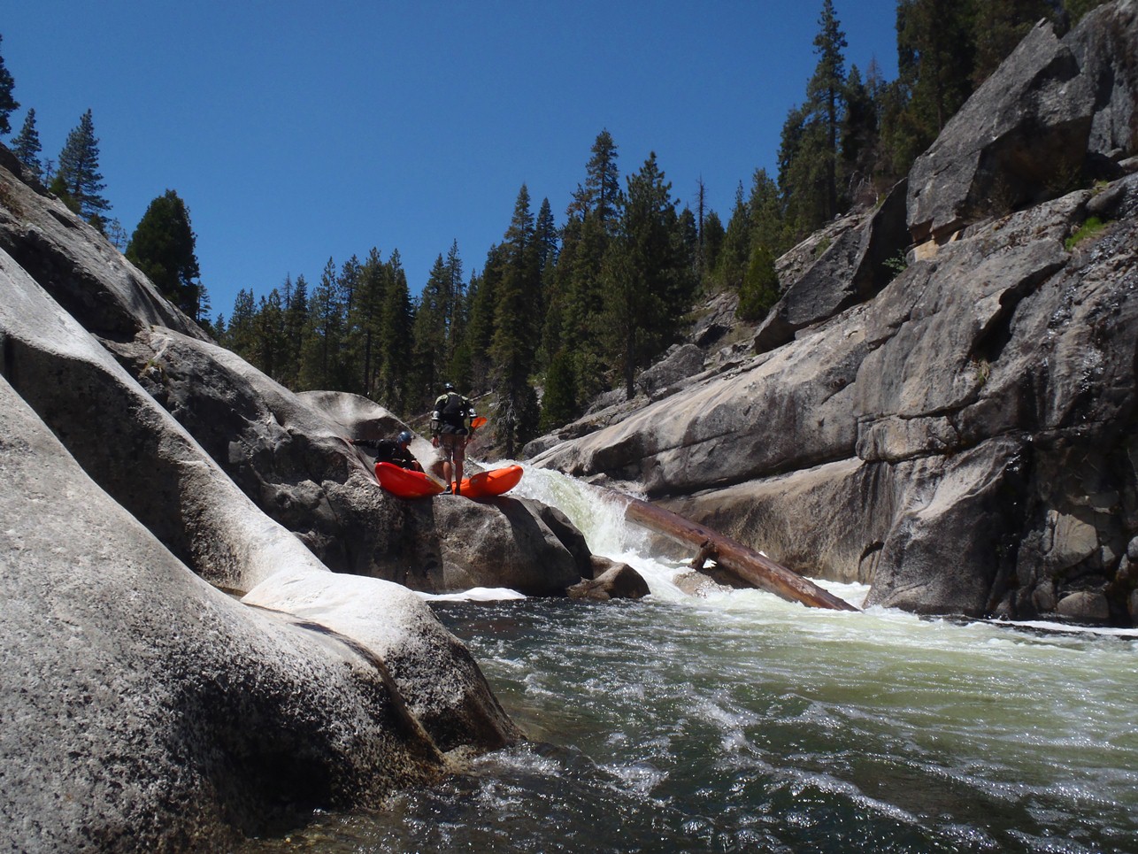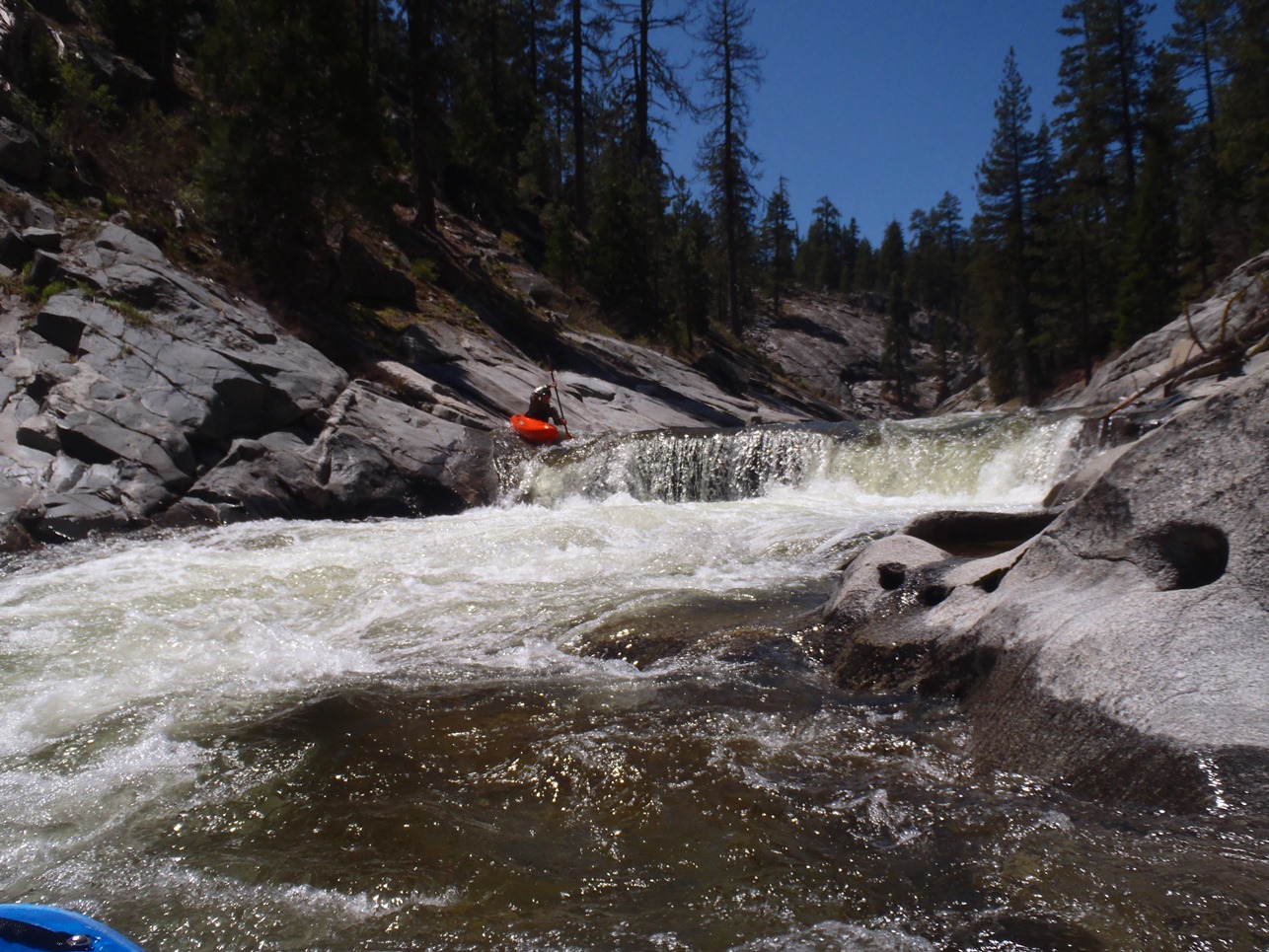 Take-out: From Shaver Lake, Take Dinkey Creek Rd East off of Highway 168 for 11.0 miles. Turn right on Ross Crossing (the sign is horribly faded). Stay left at the immediate fork. Follow for 3.5 miles (there was another fork that we stayed left on too). At 3.5 miles turn left on the small dirt road dropping down to the left. It is a bit tight, you will scratch your car. About halfway down the mountain there will be a nice clearing on the left. This is the parking. You know you have passed it by 100 feet if the road ends and you have to reverse up the road. On the far side of the clearing, amongst the trees, find the over grown trail that after 15 feet opens up into a more noticeable trail. Follow it down to the river to mark take-out before putting on.