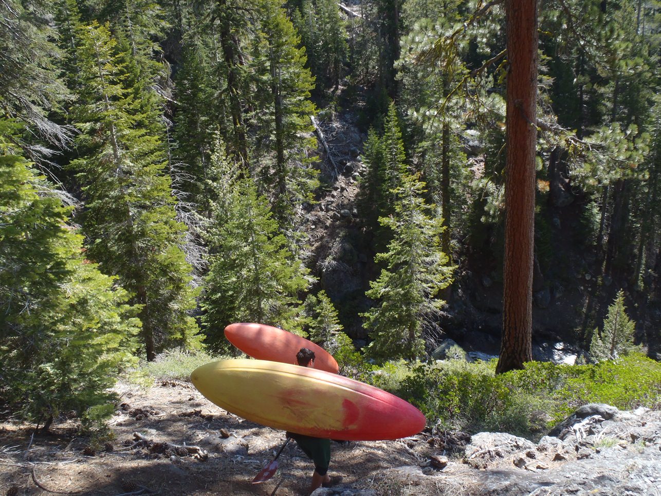 - Portage Gorge (V to U). The first drop is unrunnable. A 20 foot drop into a rock that then deflects either into the wall or into a sieve. Portage right around the house size rocks. Lowering the boats back down and friction climbing (bring your 5.10's!) down. A few runnable rapids lead to a boulder chock which is runnable but is followed by a slide into a nasty undercut. We chose to walk left. Below is another drop that we tried to scout but could not get a vantage at. It looked big and gross from what we could see. We continued our previous portage on the left. There was a 10 foot ledge just below that we ended up portaging in continuation as well due to difficulty of getting back down to the water. We put back in by down climbing a Manzanita ravine. Then went 50 feet, scouted another drop that went but were instructed to portage (right) from our one scout designee. It is a 10 foot boof with a reconnect. It wouldn't have been pretty, but would have gone in hindsight.