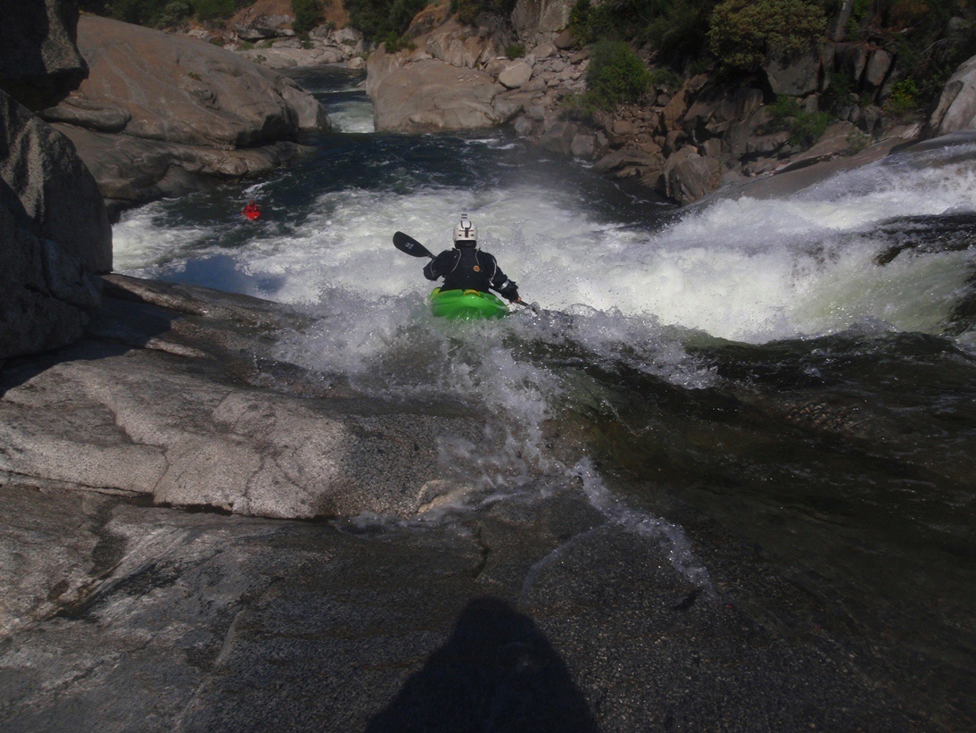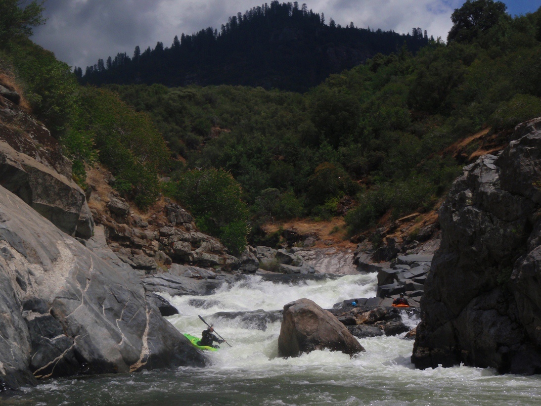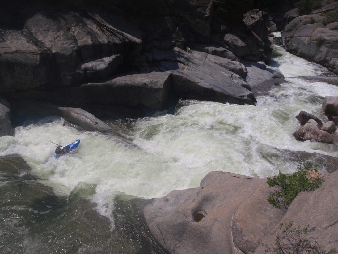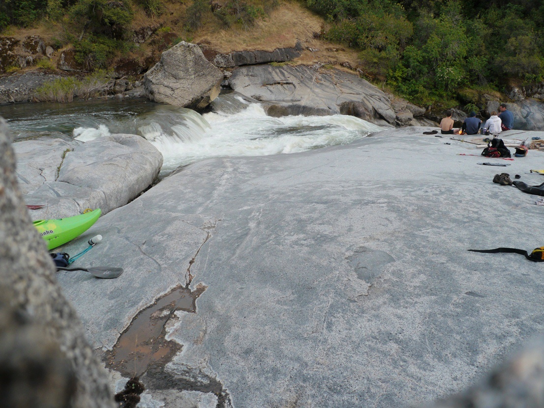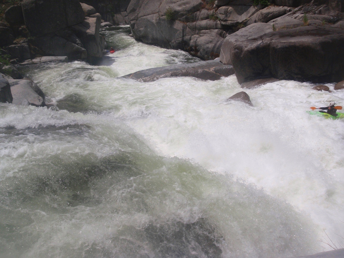 Exit Rapid (V). Scout on the left. Enter the left channel (most just seal launch into this channel from the scout) and then run center moving left. Boof the ledge downstream on the left and drive left away from the dangerous sieve. Then drive back right to avoid the wall and pocket eddy below. The portage is sketchy at best. But as there was a boat in the rapid making the line much harder as well as a soul in the sieve, I choose to do the portage instead. It involved a throw of my boat into the pool below with a friend station downstream after his run of the rapid. Next was a friction climb out as far as possible until my footing gave way and I was sent sliding down the 40 or so feet down the steep slab to the river below. It would be difficult without someone willing to run the rapid. Everyone else ran the rapid just fine. It just seemed to that I needed to pay my respects to the man and the rapid... and it was scary of course, so I choose to walk.