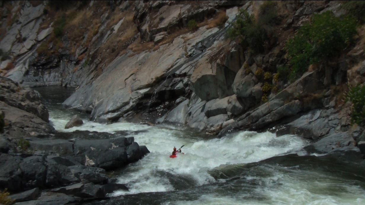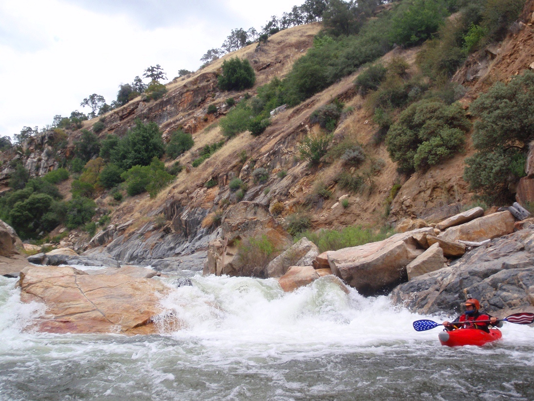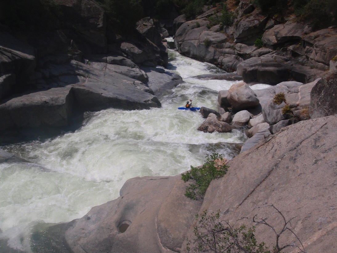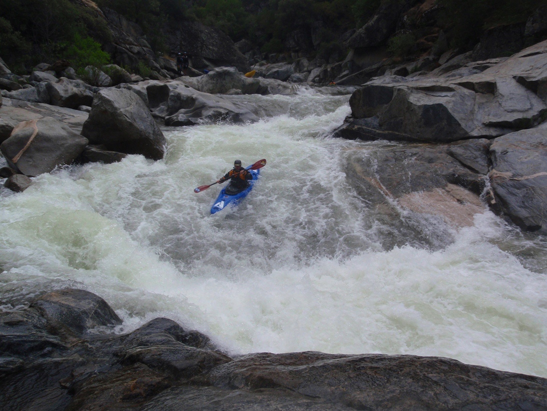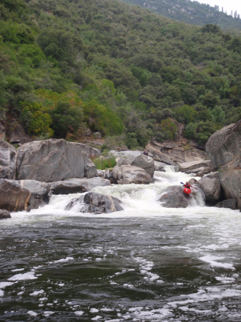 Exit Rapid (V). Scout on the left. Enter the left channel (most just seal launch into this channel from the scout) and then run center moving left. Boof the ledge downstream on the left and drive left away from the dangerous sieve. Then drive back right to avoid the wall and pocket eddy below. The portage is sketchy at best. But as there was a boat in the rapid making the line much harder as well as a soul in the sieve, I choose to do the portage instead. It involved a throw of my boat into the pool below with a friend station downstream after his run of the rapid. Next was a friction climb out as far as possible until my footing gave way and I was sent sliding down the 40 or so feet down the steep slab to the river below. It would be difficult without someone willing to run the rapid. Everyone else ran the rapid just fine. It just seemed to that I needed to pay my respects to the man and the rapid... and it was scary of course, so I choose to walk.