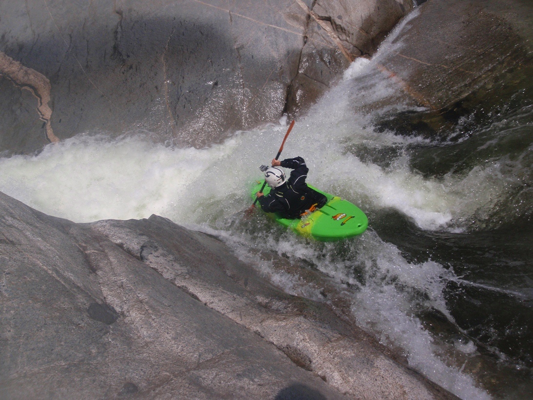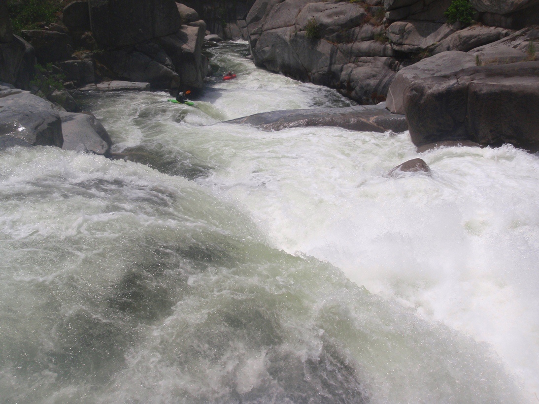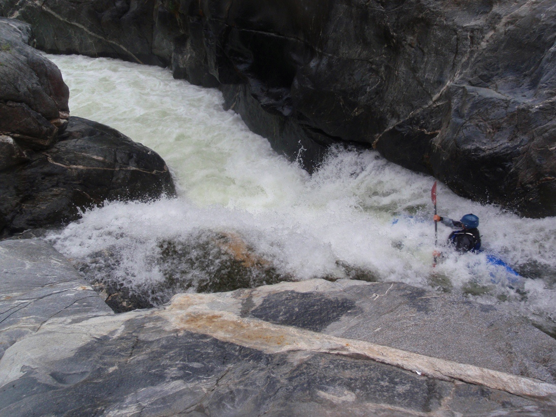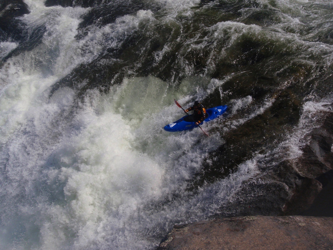 - The Gorge Rapid (P/V+/V-). Several different options here. First and foremost, get out on the right and scout before leaving the pool. The first two drops are almost always portage due to a large sieve in the second drop but with that said it has been run a time or two down the right. Some people choose to seal launch in below the second drop, careful to avoid the hole from the second drop and then run the ledges leading to the 10 foot tall third tier. The challenge with that tier is that it is hard to scout and you HAVE to be far right to avoid boofing onto a rock. Set safety for the seal launch as in 2009 someone swam after seal launching in and broke his back when he swam over the third ledge. To portage this requires passing boats a little further before lowering them down a steep granite slab. You also walk down this slab. If it is raining, it would be stressful. With it dry, it is surprisingly tacky... at least with 5.10 shoes on. One in the water below, ferry out and boof the exit ledge on the center. Downstream lays on more drop best run center driving right boofing a large hole just above Anaconda.
