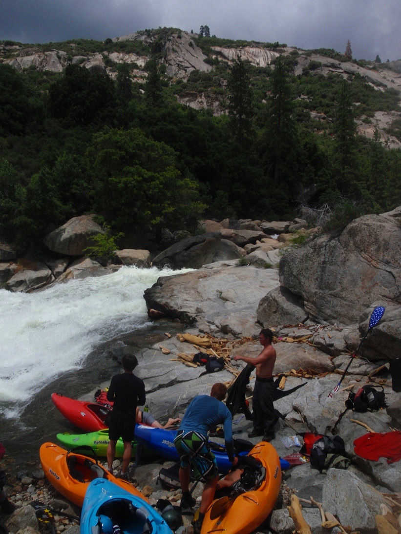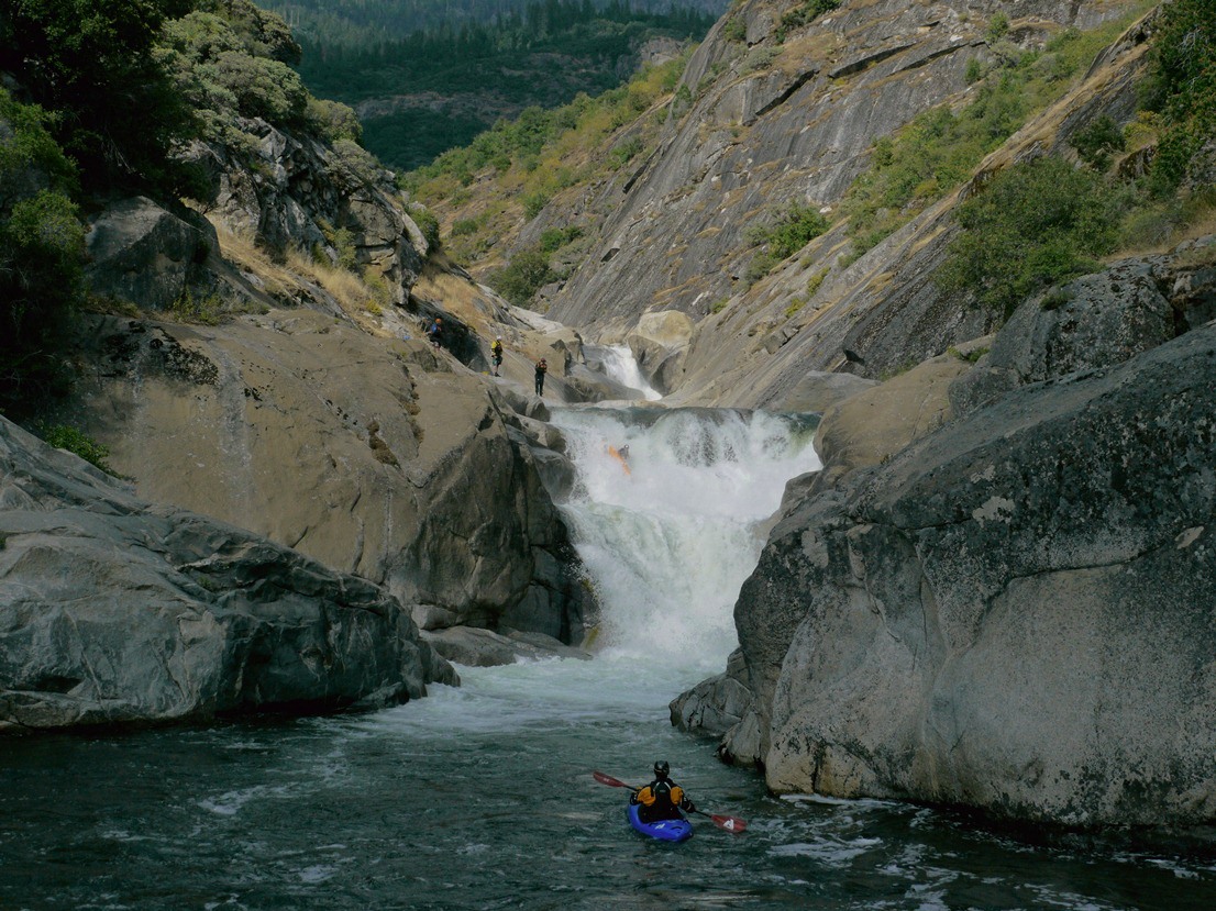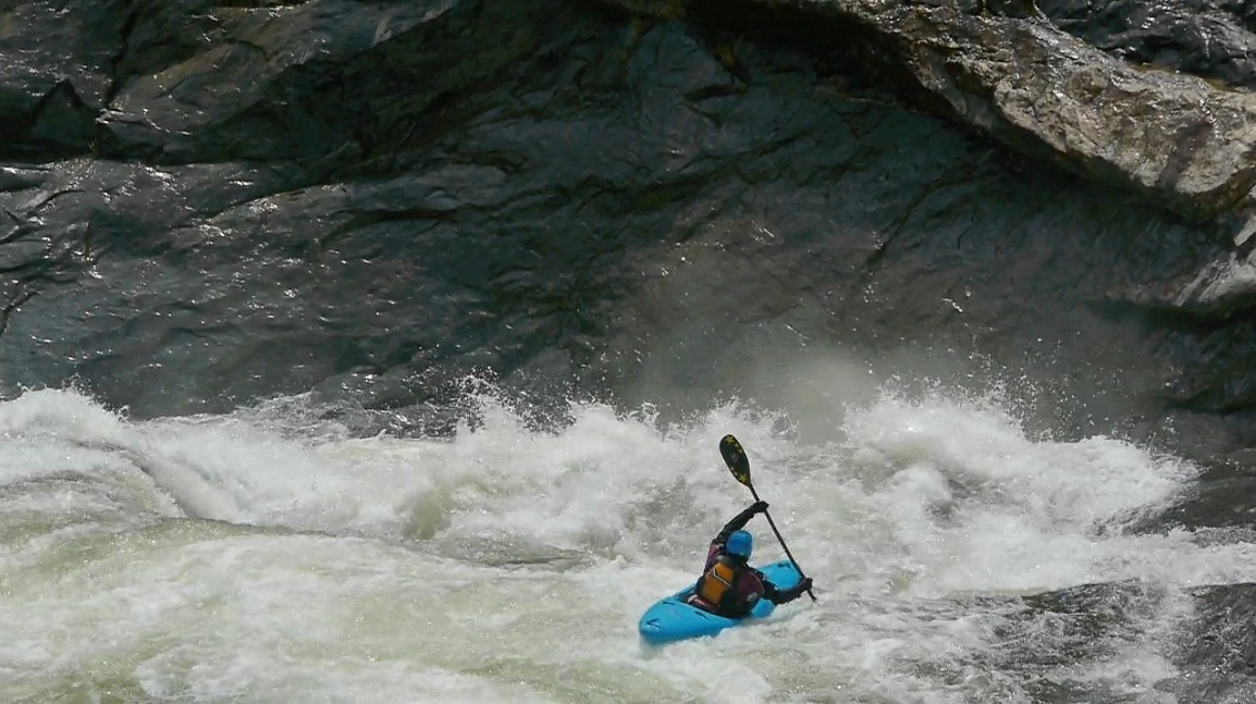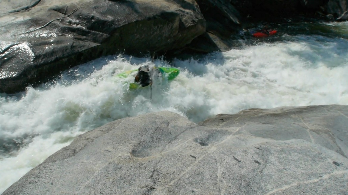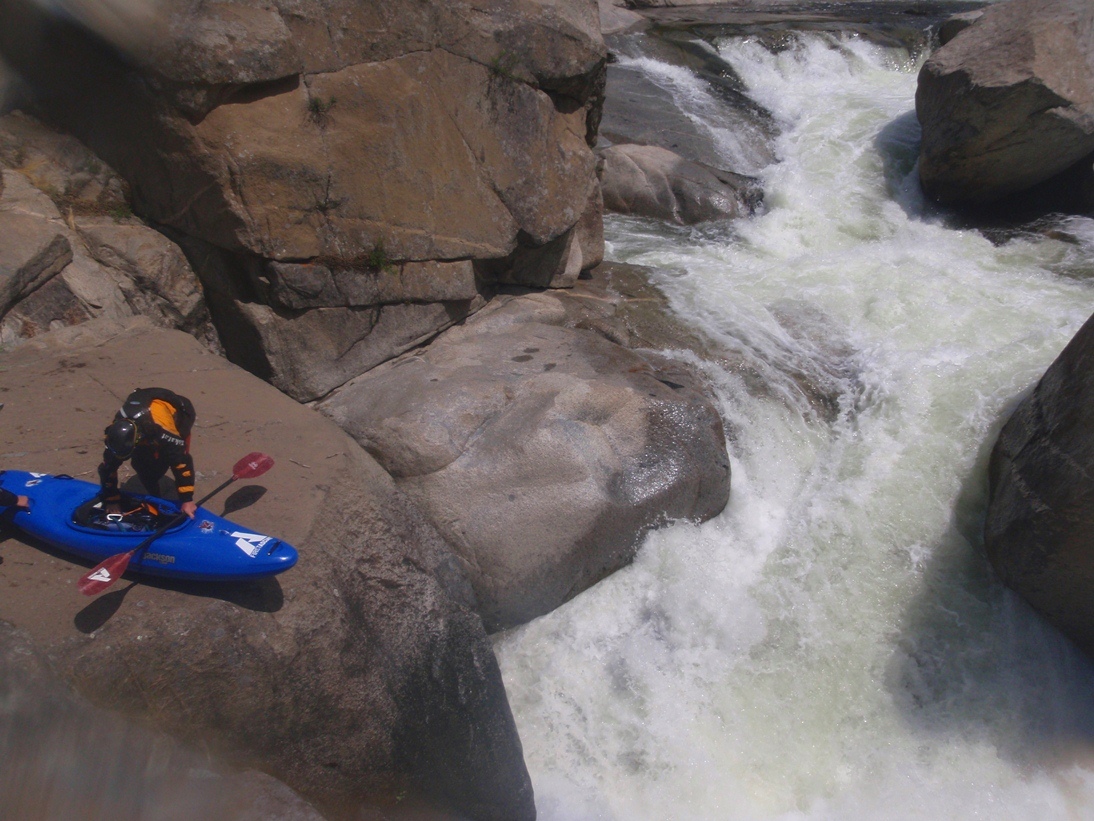 - The Gorge Rapid (P/V+/V-). Several different options here. First and foremost, get out on the right and scout before leaving the pool. The first two drops are almost always portage due to a large sieve in the second drop but with that said it has been run a time or two down the right. Some people choose to seal launch in below the second drop, careful to avoid the hole from the second drop and then run the ledges leading to the 10 foot tall third tier. The challenge with that tier is that it is hard to scout and you HAVE to be far right to avoid boofing onto a rock. Set safety for the seal launch as in 2009 someone swam after seal launching in and broke his back when he swam over the third ledge. To portage this requires passing boats a little further before lowering them down a steep granite slab. You also walk down this slab. If it is raining, it would be stressful. With it dry, it is surprisingly tacky... at least with 5.10 shoes on. One in the water below, ferry out and boof the exit ledge on the center. Downstream lays on more drop best run center driving right boofing a large hole just above Anaconda.