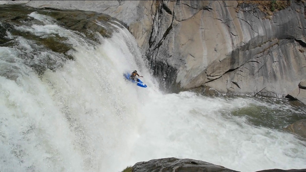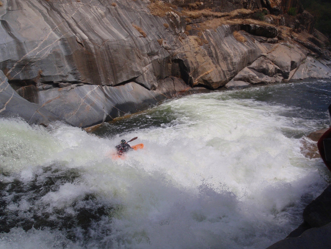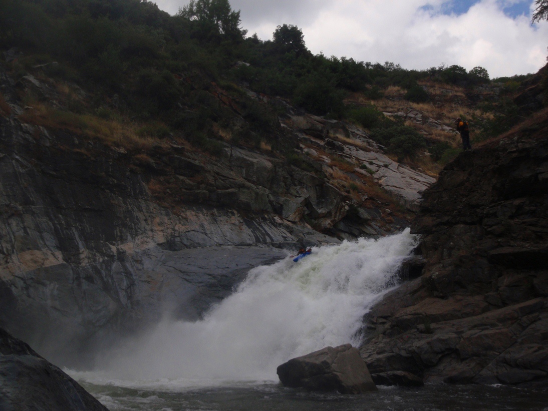 Willie Kern's (V to V+). Enter the ramp and fly through the hole below. At higher flows, this is faster and the hole is meaner. Staying right worked well. The bottom drop is 30-40 feet tall, not quite vertical. It needs to be run between the two rooster tails else you risk a pocket on the right or breaking your ankles like Willie Kern apparently did.