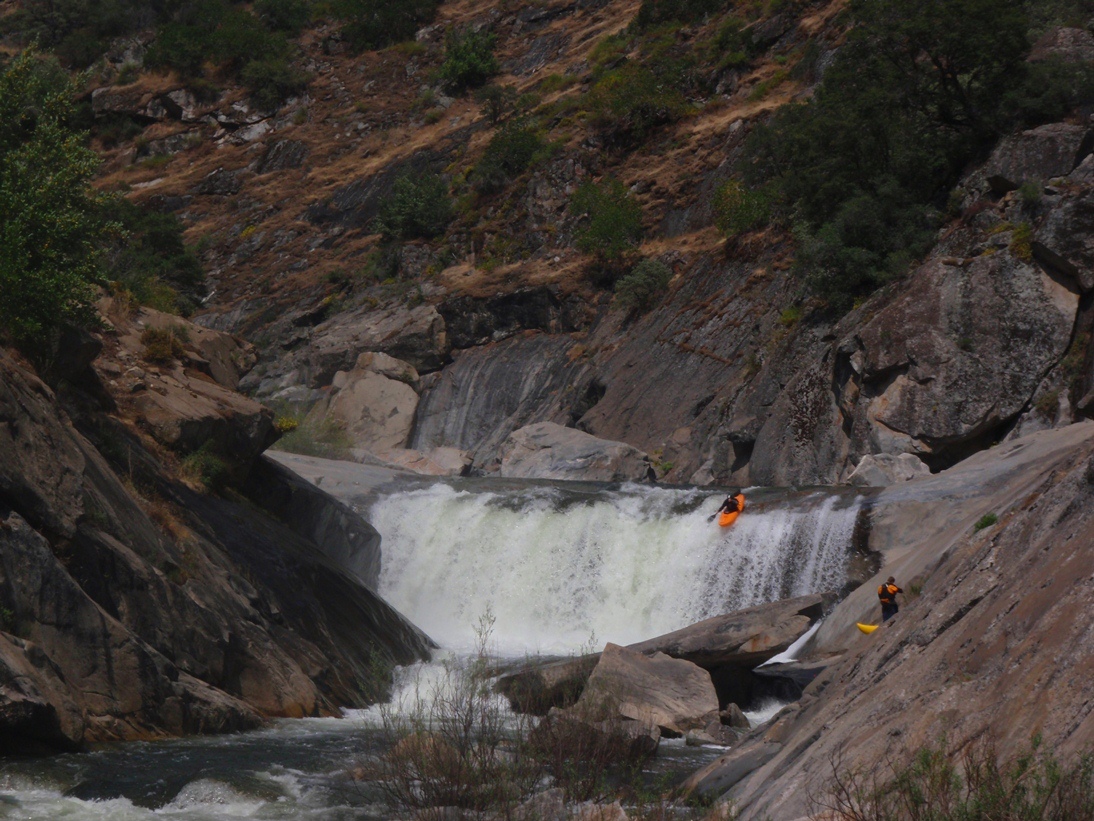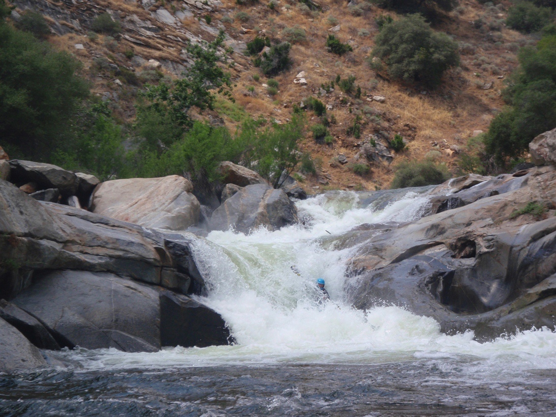 Spike (V+). A large double drop. Scouted on the right, and portaged on the right as well for those not wanting to run it. Be aware that there is a cave on the right behind the first curtain. Two folks ended up in it this year that I know of. Close calls for sure.