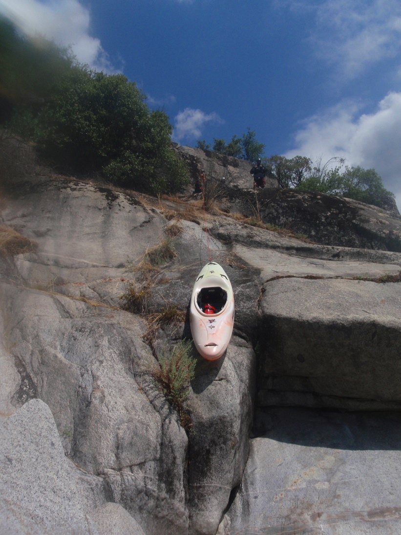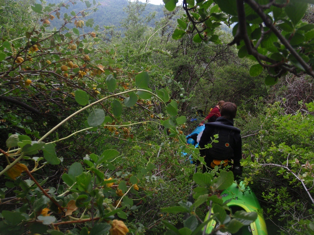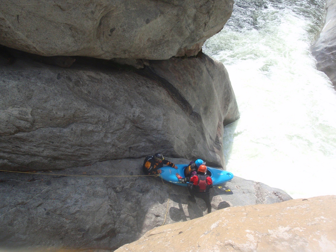 - Portage (U). Time for a little teamwork. The portage is via the easy eddy on the left. Pass boats along the cliff face. Darin left a rope attached to down climb the ravine in 2011 so hopefully it stays a while. It is best to lower boats via a separate rope. Assist boaters by holding their boat on the 45 degree slope and releasing them to their seal launch. It is highly recommended that only the last person does a throw and go once all the others in the team are downstream to rescue the gear. In 2011, a group threw the last boat off only to have it capsize. While fighting to get the loaded boat to shore, an experienced Italian boater who was pulling the boat to shore was swept into the next rapid and unfortunately perished in a sieve on the right side. A freak accident that occurred despite the group doing the portage safely. The next day, another group did a entire group throw and go and lost one of the boats in the rapid as well. So, please be careful. The eddy on the left above the next rapid is large, but simple accidents or bad decisions can be costly here. It is safer to take your time and do the portage right then to rush through it.