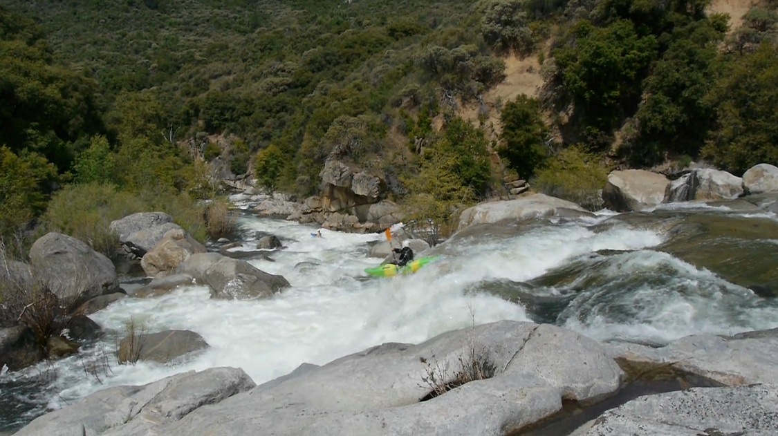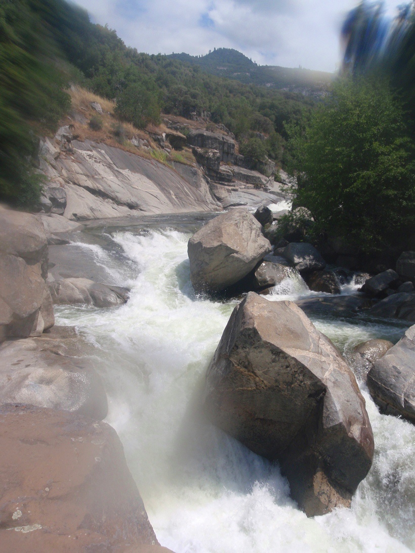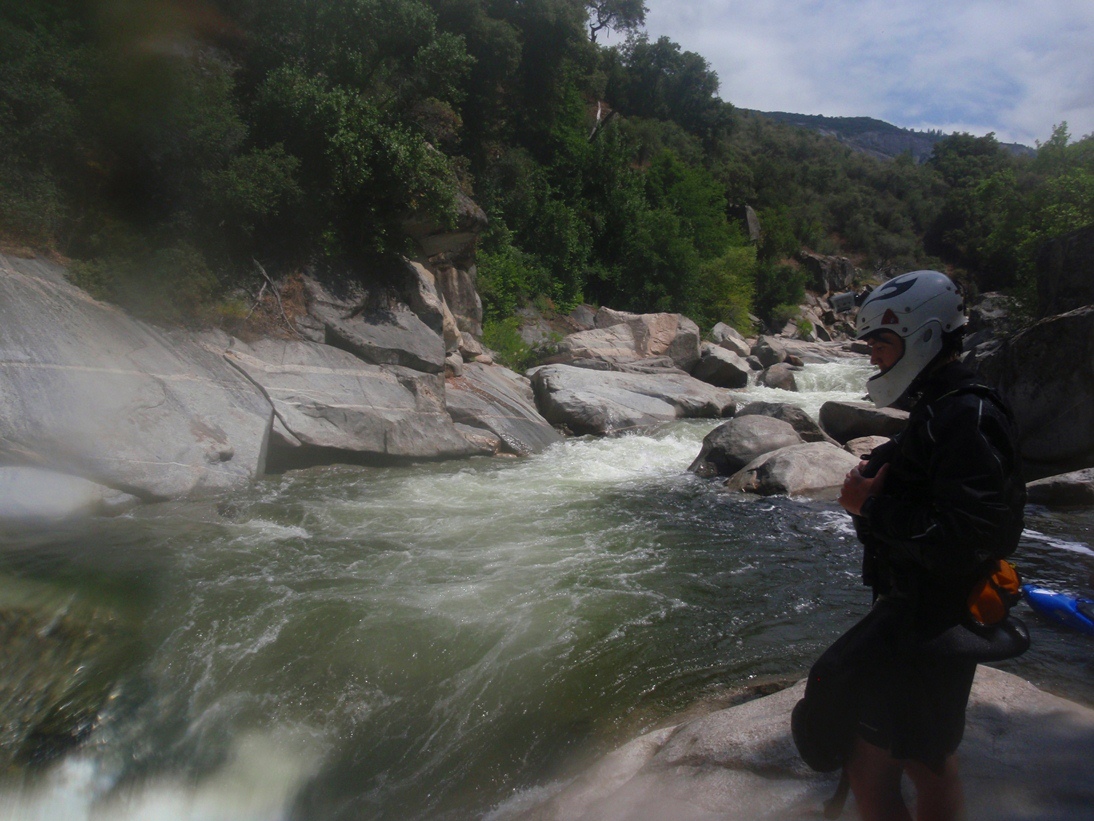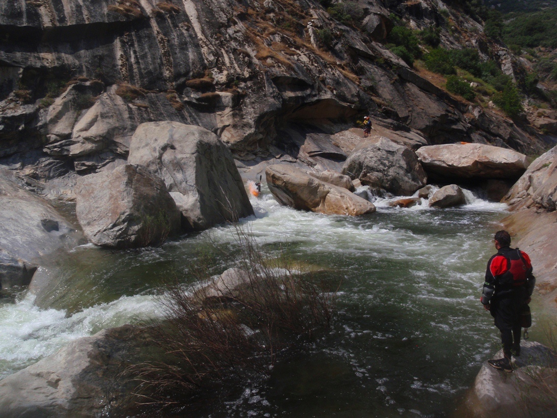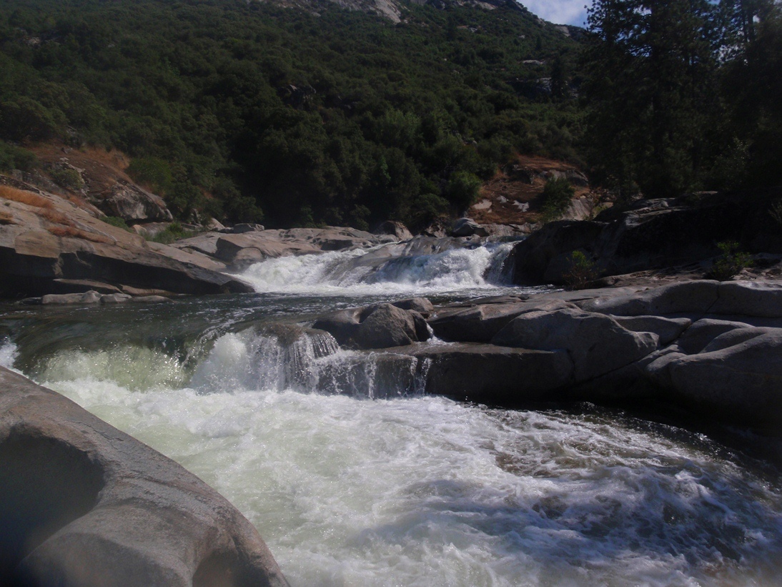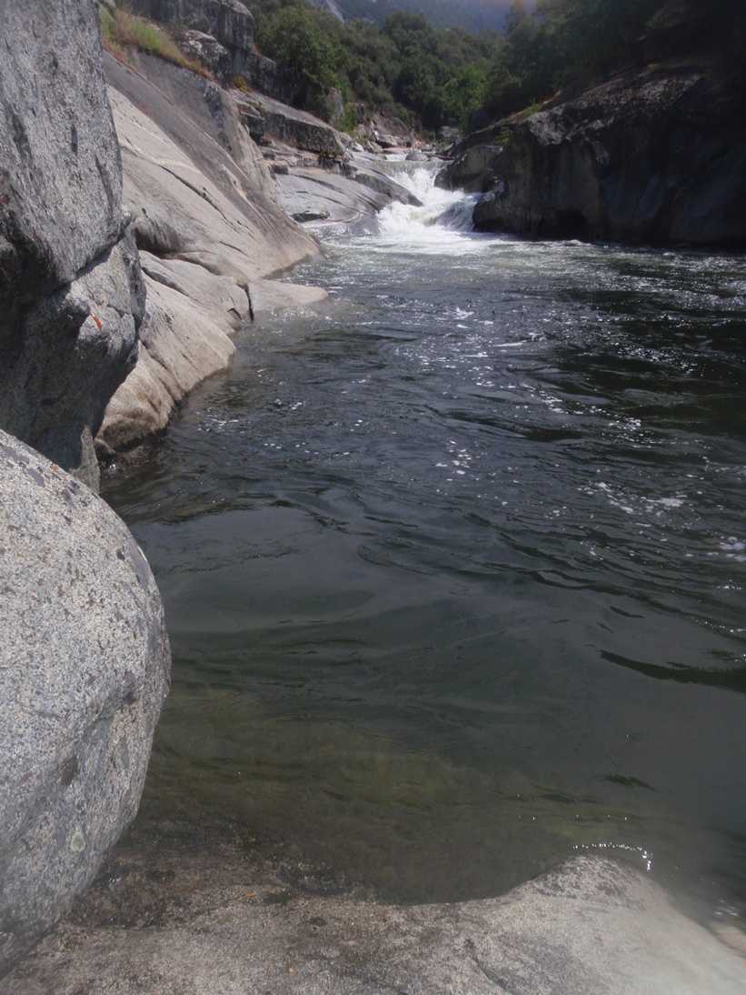 Put-in: Drive Back towards Fresno 10.6 miles on Trimmer Springs Rd. Just after the bridge over Big Creek, turn right on Big Creek Rd. In 4.8 miles stay right and cross the creek. Climb 7.7 miles, passing under the power lines. At the crest of the hill, make a left onto Ross Crossing. In 8.4 miles turn right at the 4-way intersection. In 4.4 miles turn right back onto Ross Crossing. In 2.2 miles you will cross over Dinkey Creek, continue another 1.9 miles climbing away from the river. Park just before a left hand bend. If you reach the Ross Creek, go back a short ways. The trailhead is hard to spot and is more just a trail that drops down quickly away from the river. It is however well groomed at the start as of 2011 so it should be easy to recognize that you have found it once you have actually found it (if that makes sense). After some bushwhacking, you will come to a granite slab, go down the slab to the creek below. Cross the creek and begin climbing the remnants of a forest service trail. After 100-200 yards drop down to the right on the steep not quite trail. This will drop you down to the creek, follow the creek at creek level from here to Dinkey Creek.