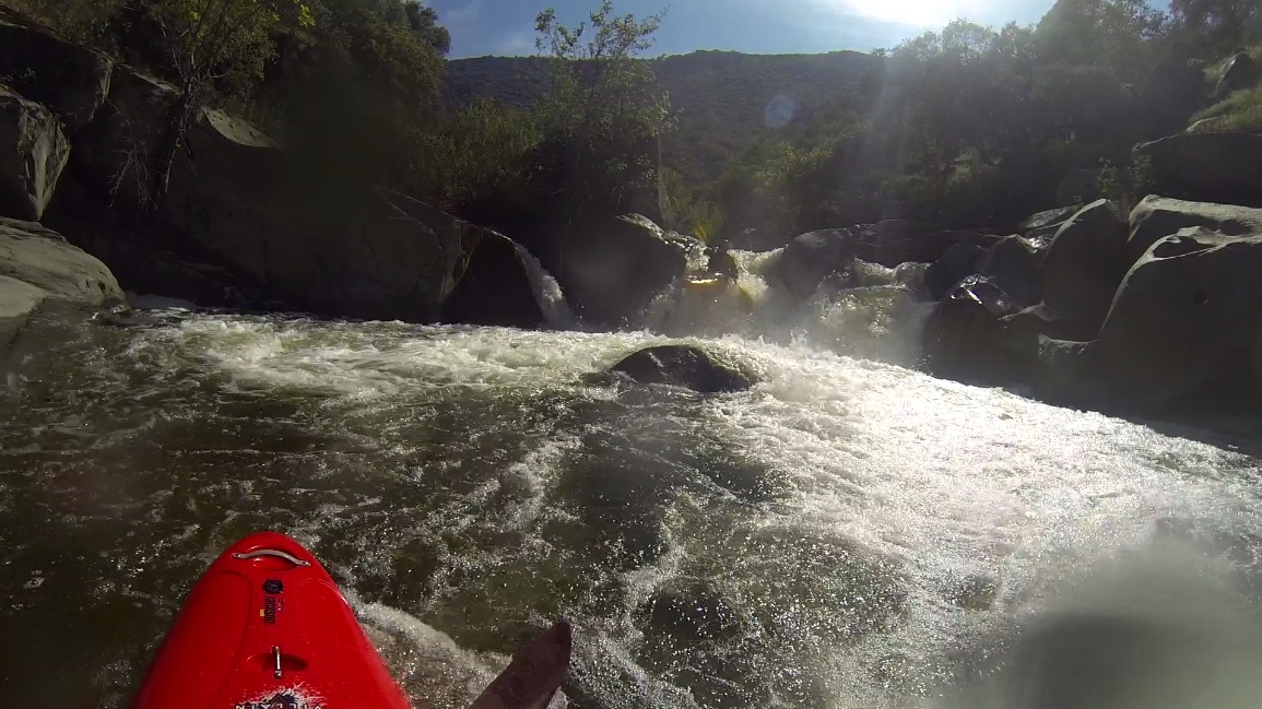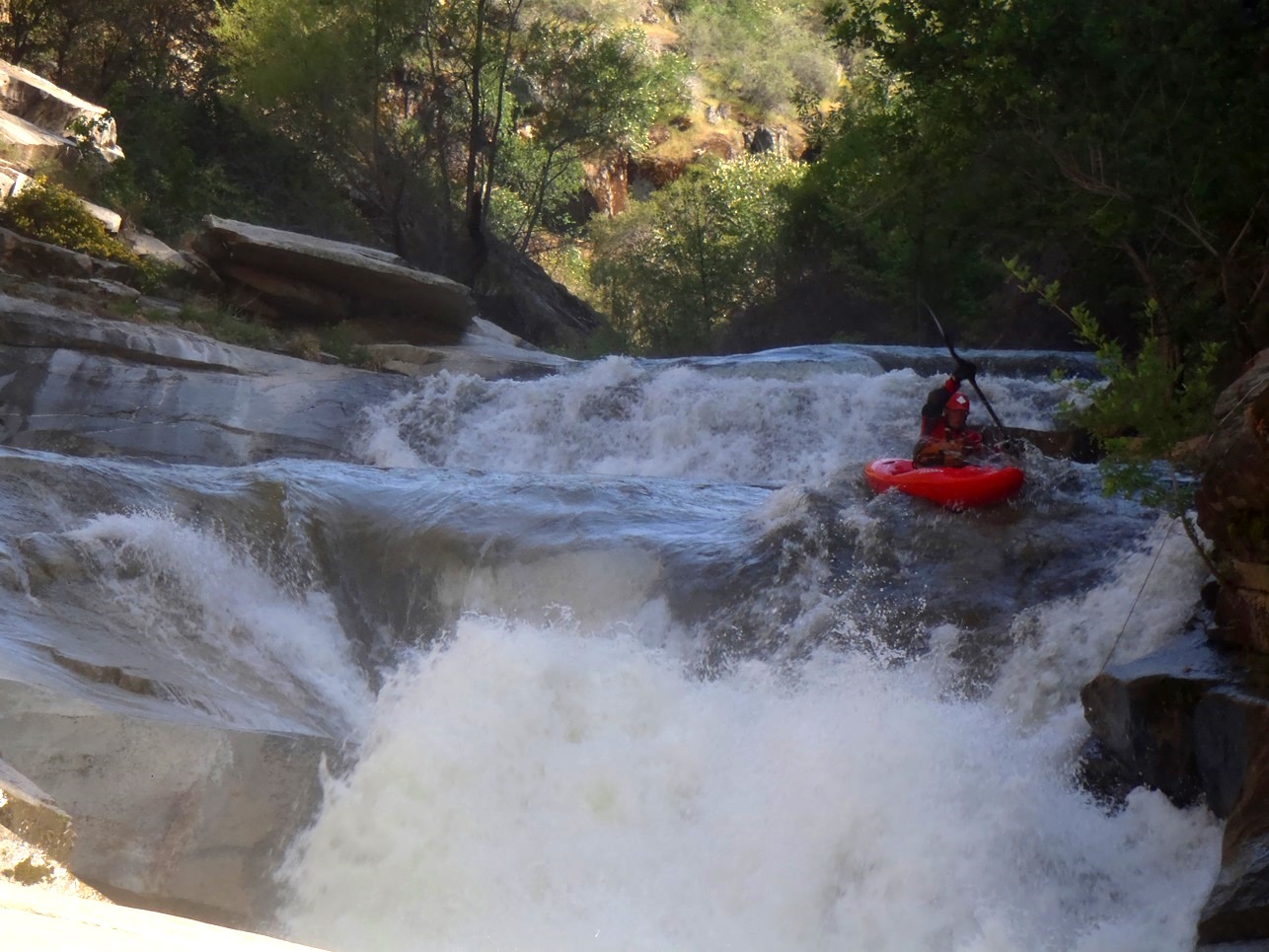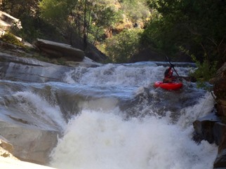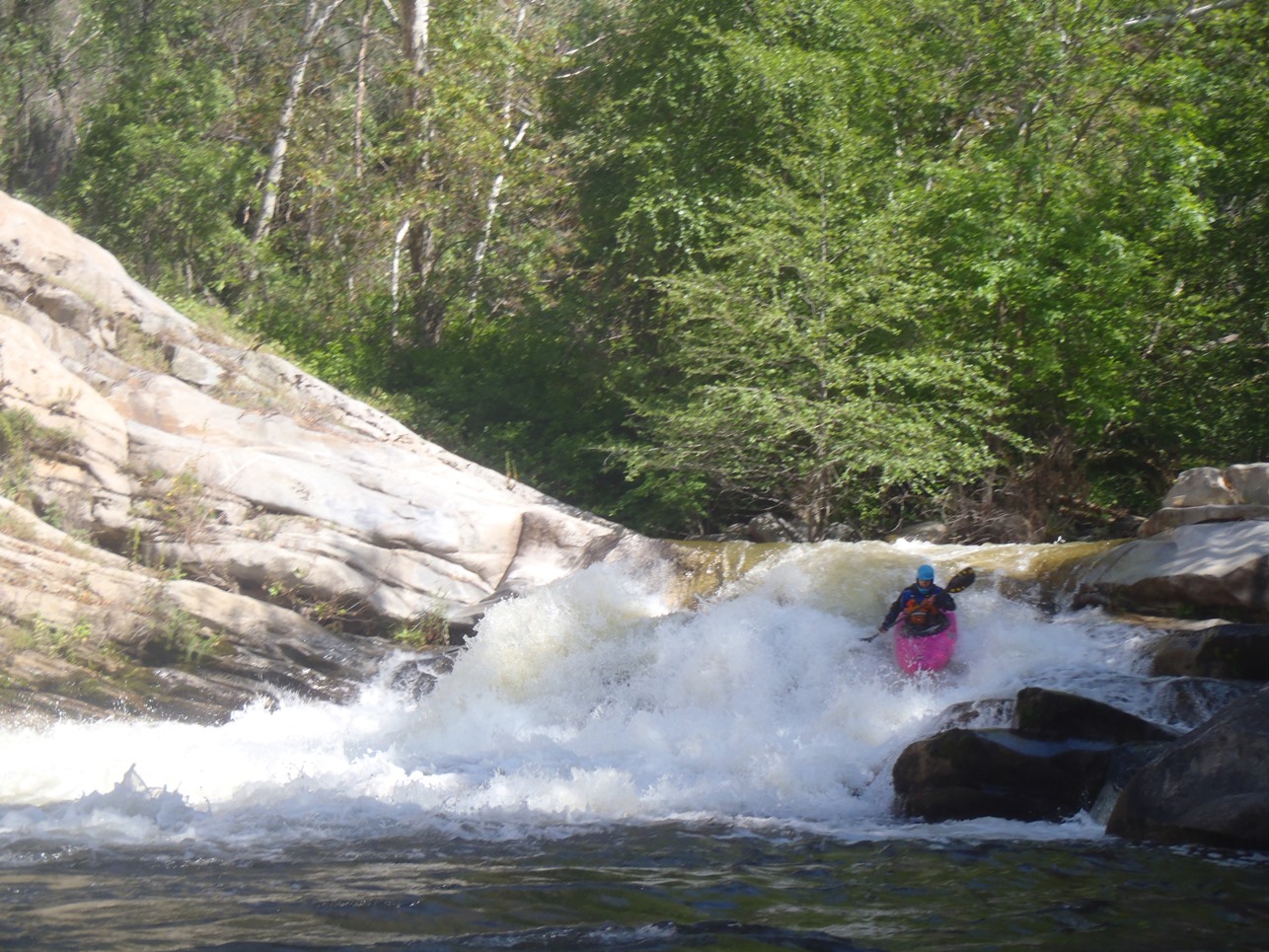 - Driftwood (V+). One junky rapid lead to Driftwood which most will walk on the left. The walk kinda sucks. I almost slipped and feel down the cliff. Getting back in also stinks. Many seal launch in gingerly without their skirts on (too slick and steep of a slope to get it on). There is a big pool below with a beach so I jumped in with my boat to swim there rather than swamping my boat. Turns out the water is shallow. Gently lower yourself to the water if you take that option. The line for those that run the drop is to act like driftwood and just plug it.