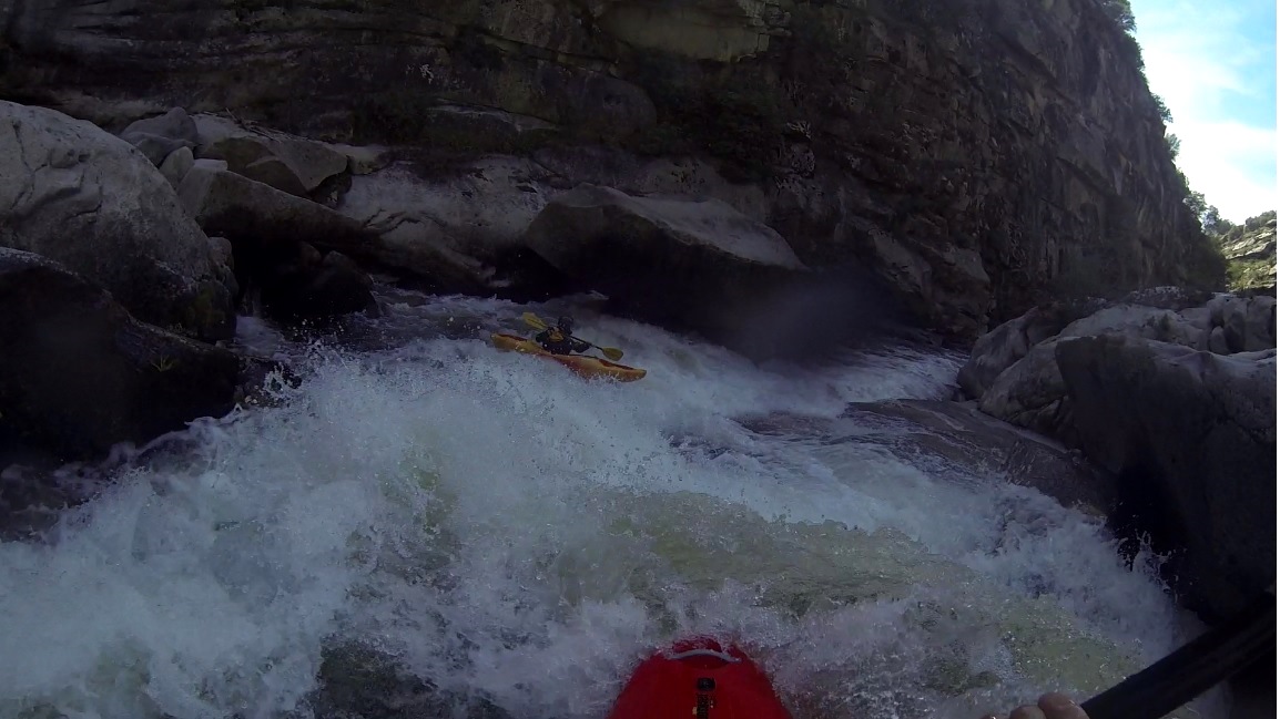 Junk 2 (IV+). Immediately after as I recall, there is another junky rapid that Darin said "we catch an eddy on the right and then ferry back across. It is junky just don't flip." And then mentioned to two in our group to portage on the left. He then failed to catch the eddy due to an unforeseen guard rock that submerged his boat and flipped him before sending him down the rocks upside down and backwards. I took a different angle to catch the eddy not knowing about the unseen guard rock and had a similar experience. I still can't believe my gopro didn't get knocked off with how many rocks I hit. Chris and Diane then didn't catch the eddy on purpose and just ran it directly with great success. Oh well. Immediately below is another big drop.